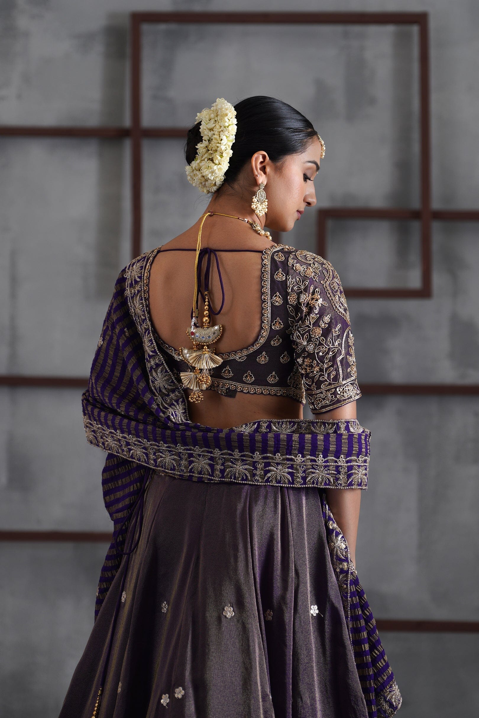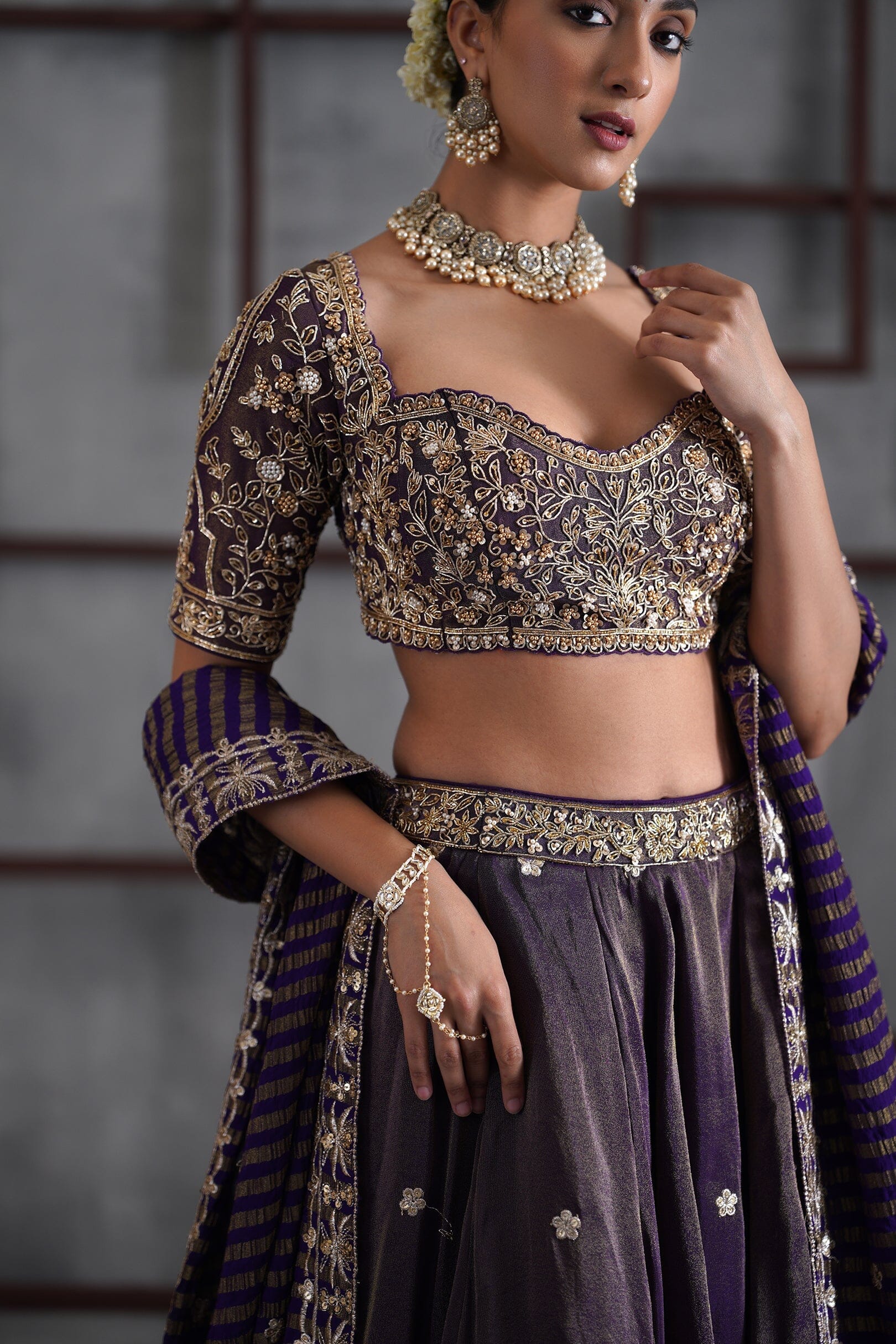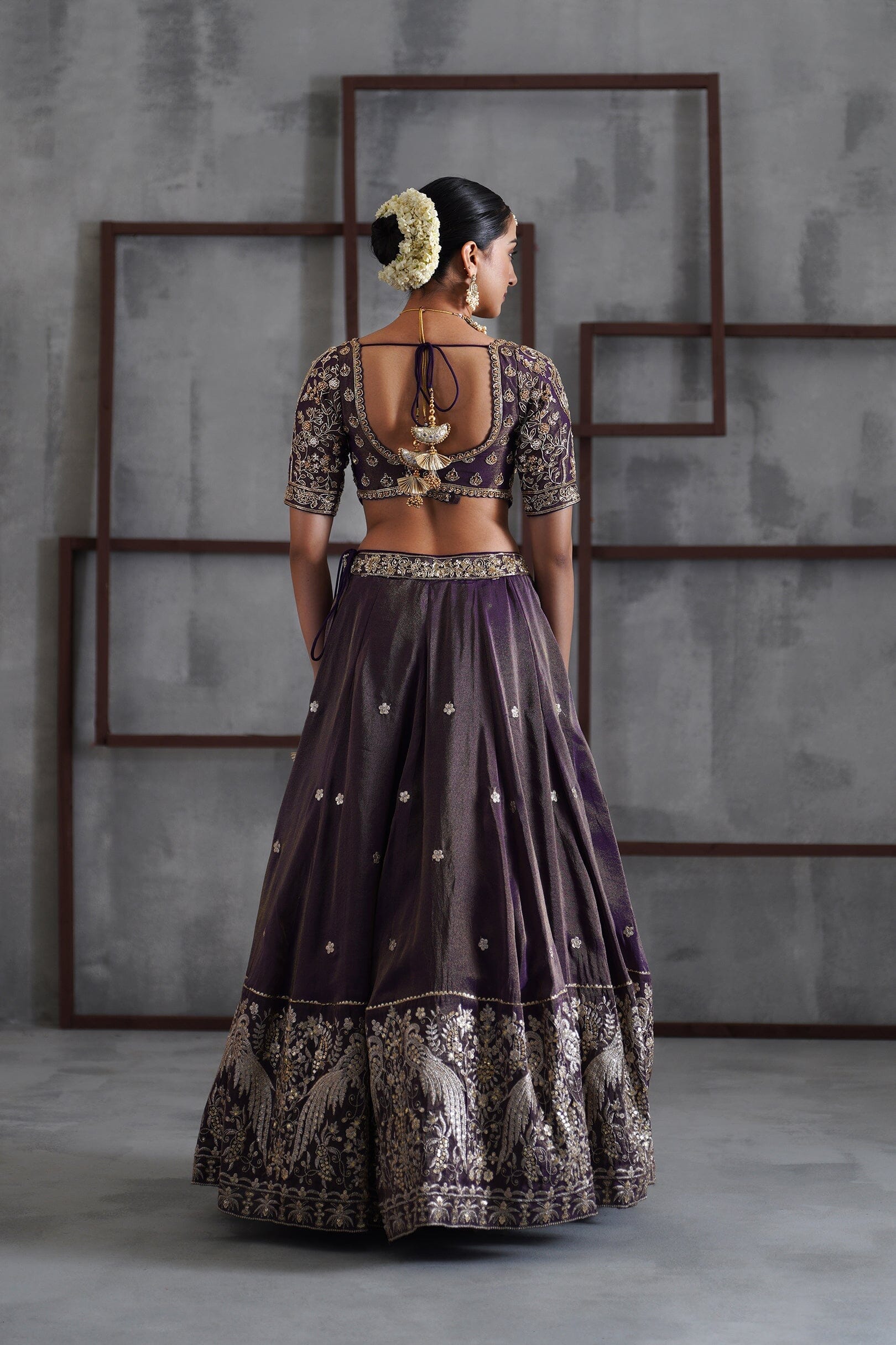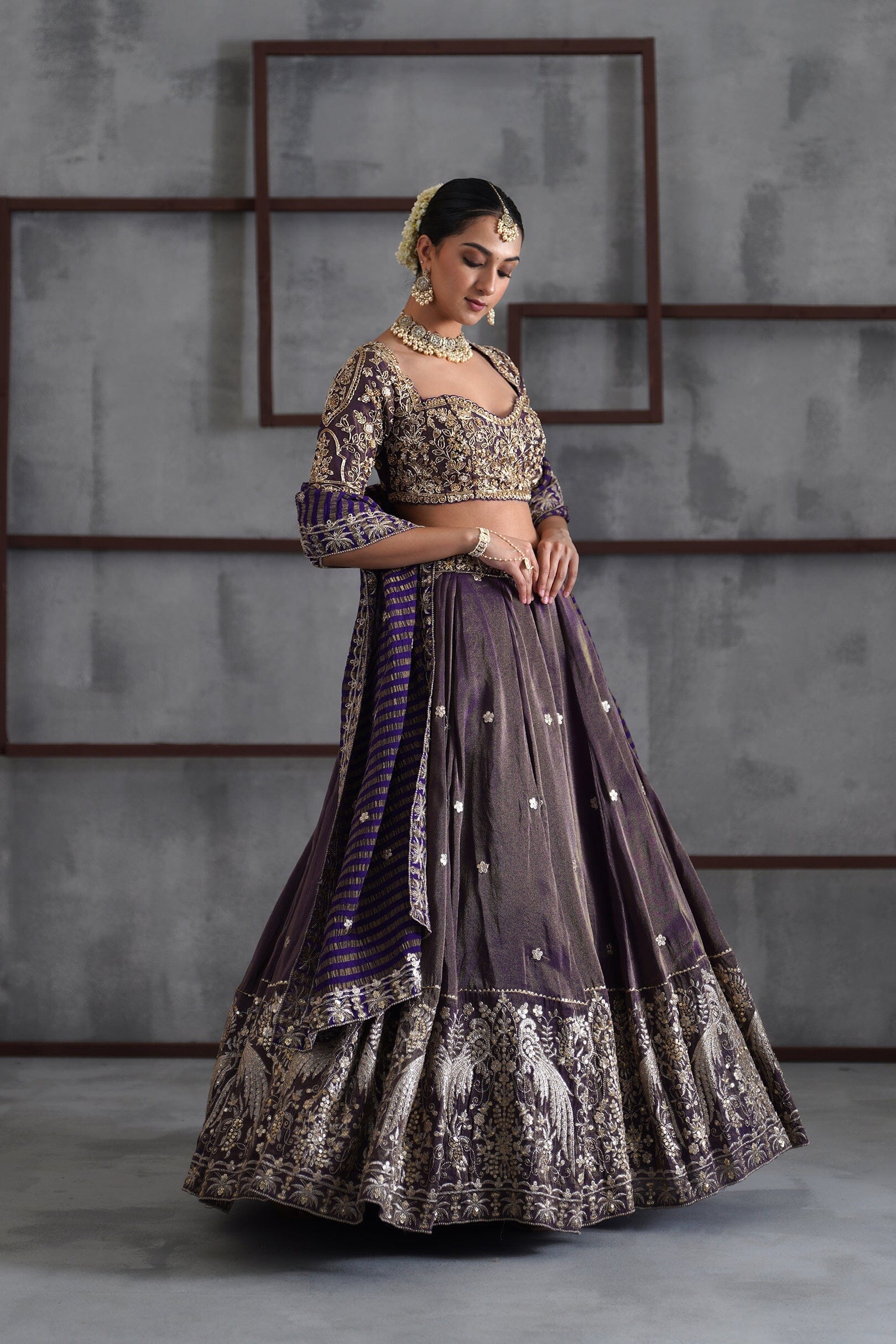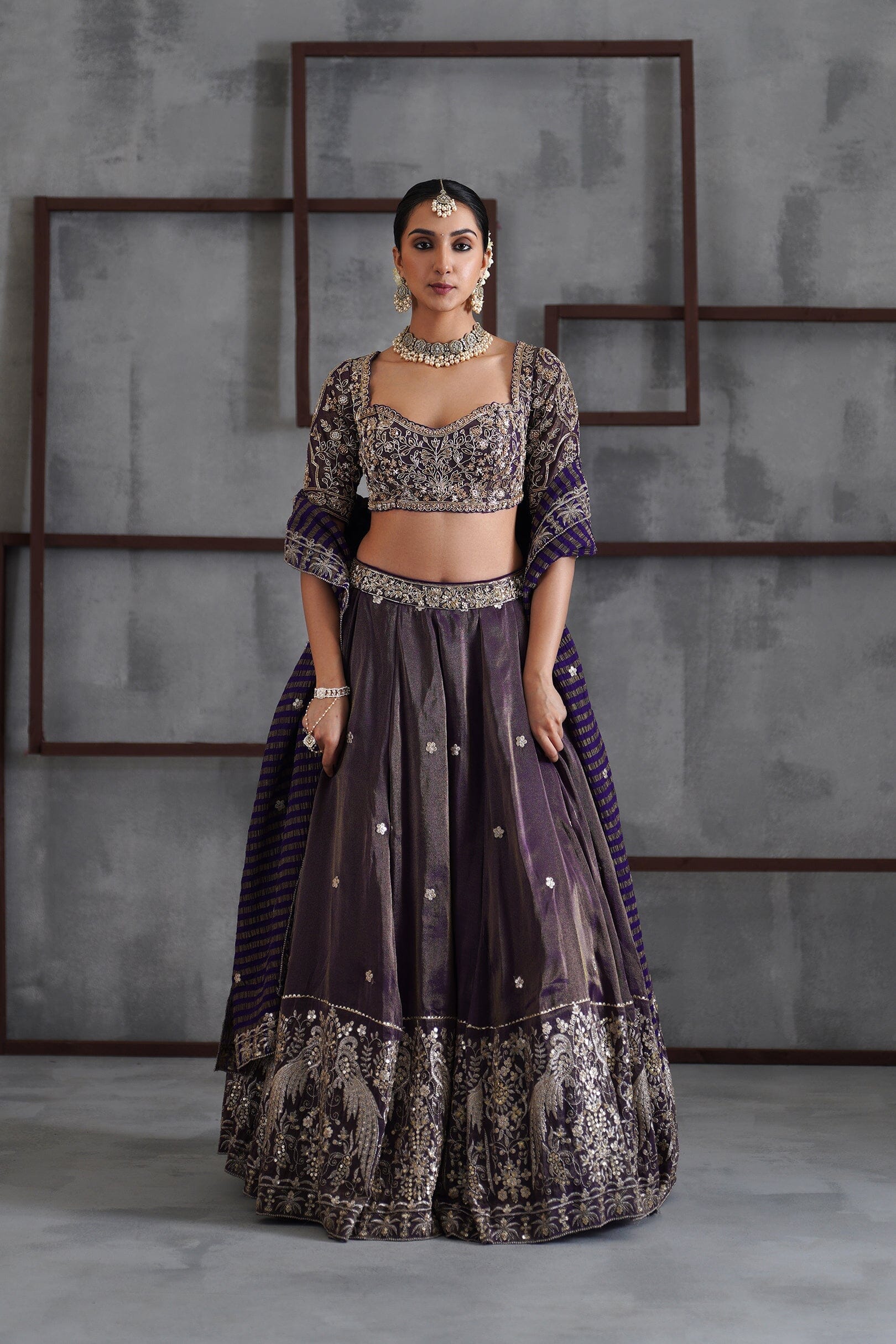 Purple Tissue Embroidered Blouse, Lehenga and Dupatta