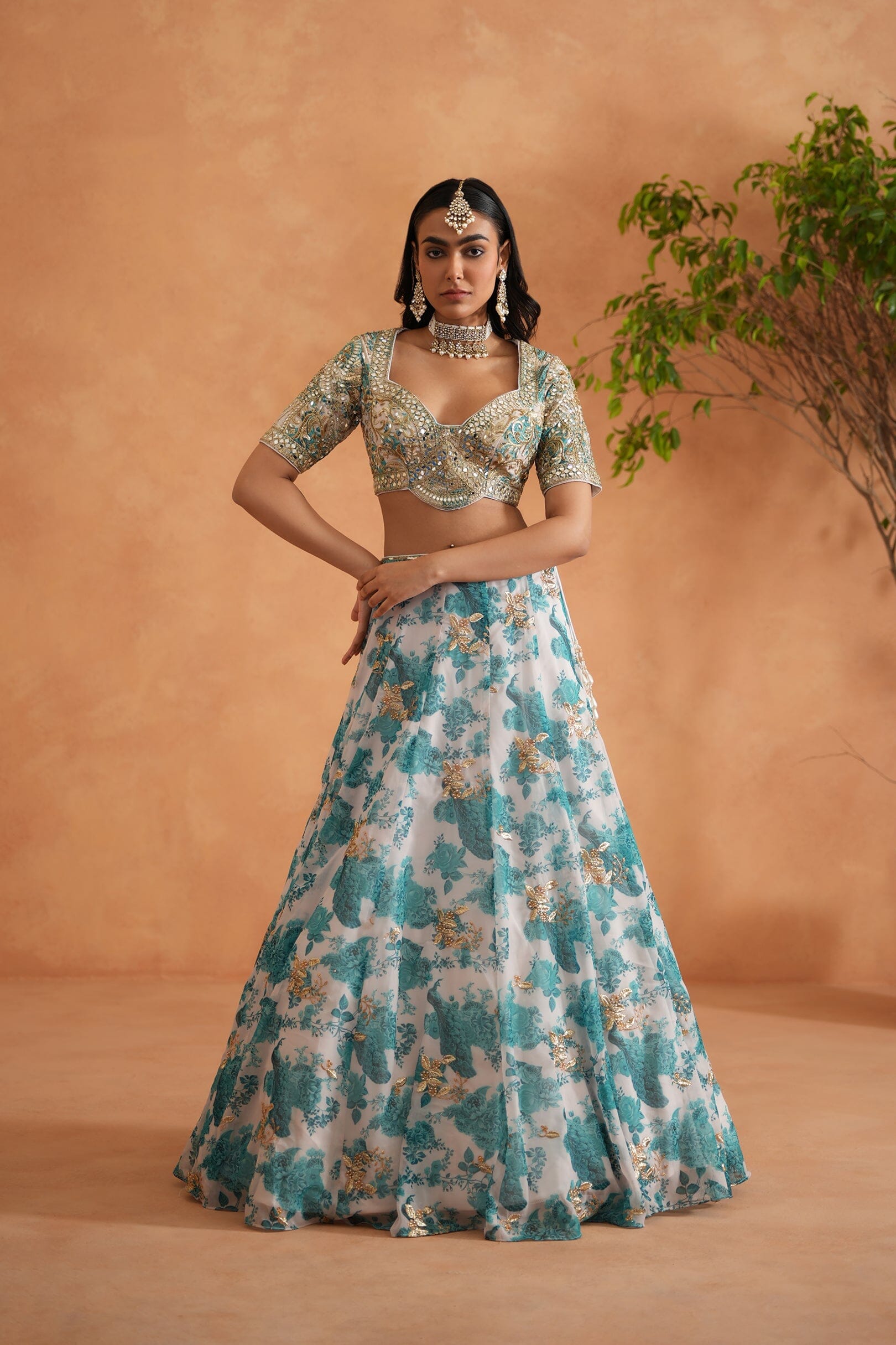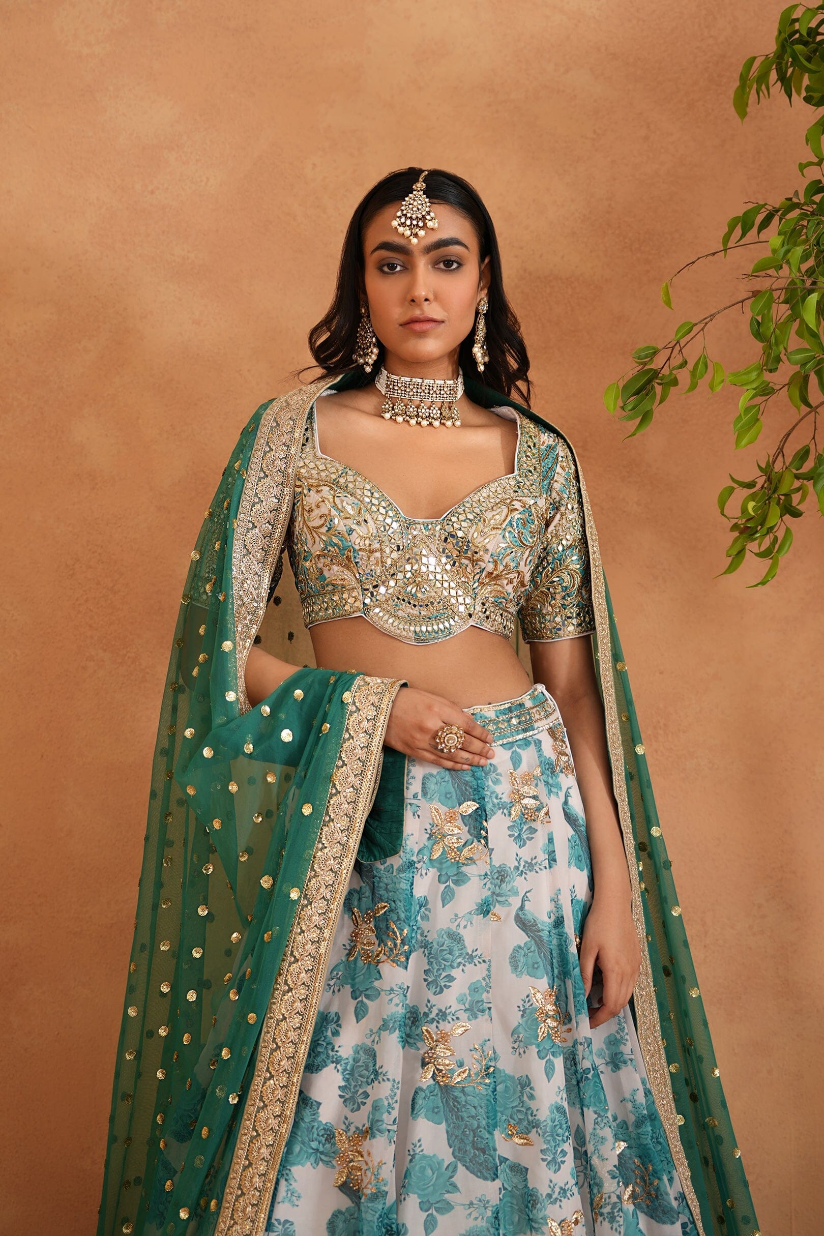 Teal Blue Mirror Embroidery Blouse, Printed Lehenga and dupatta