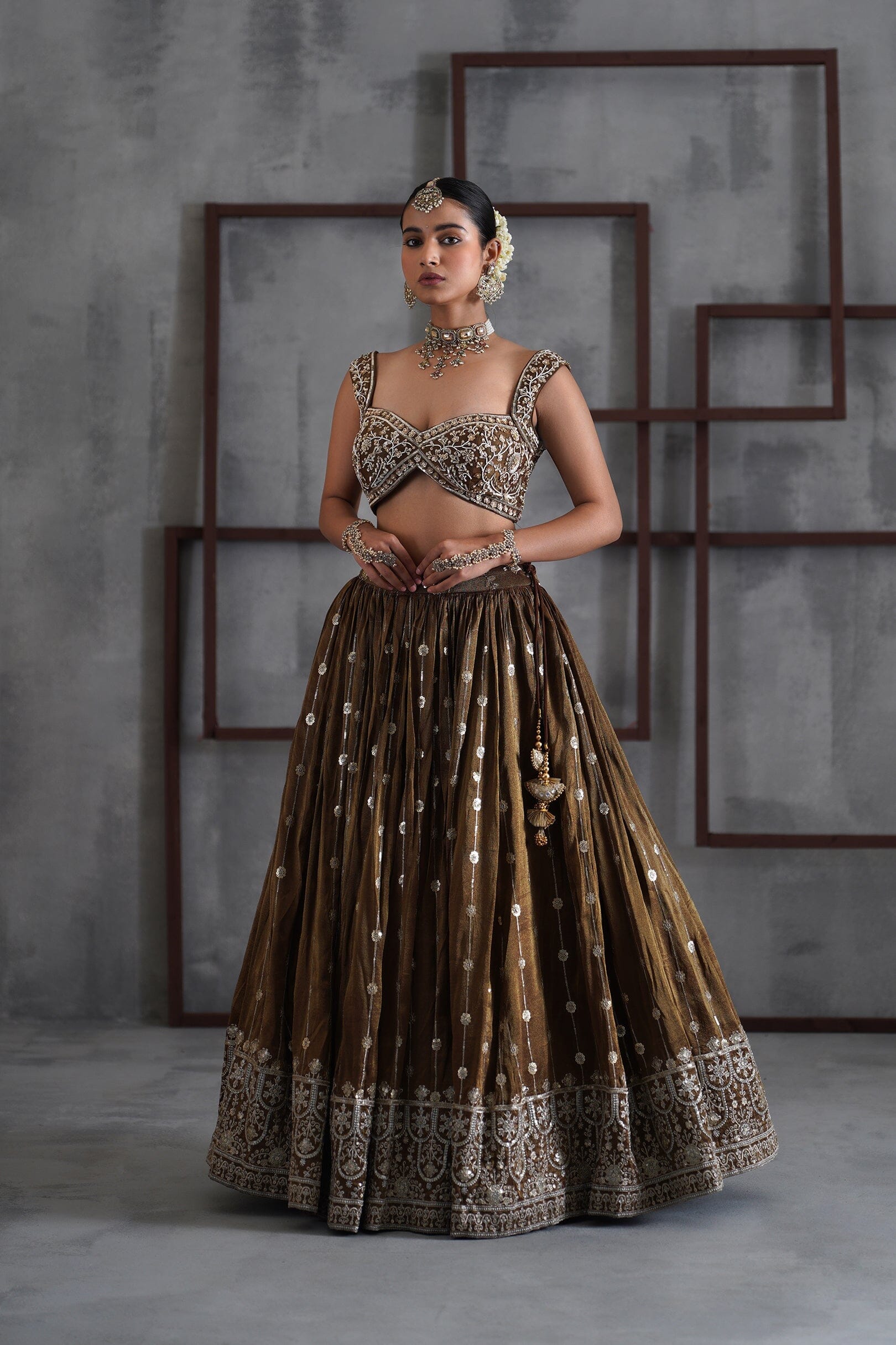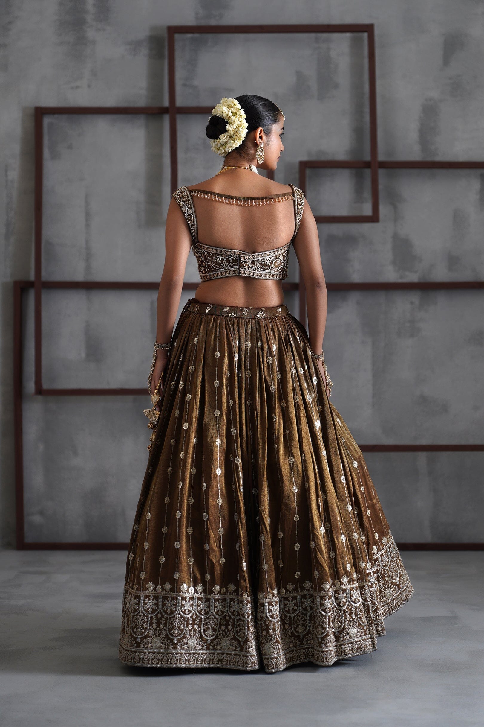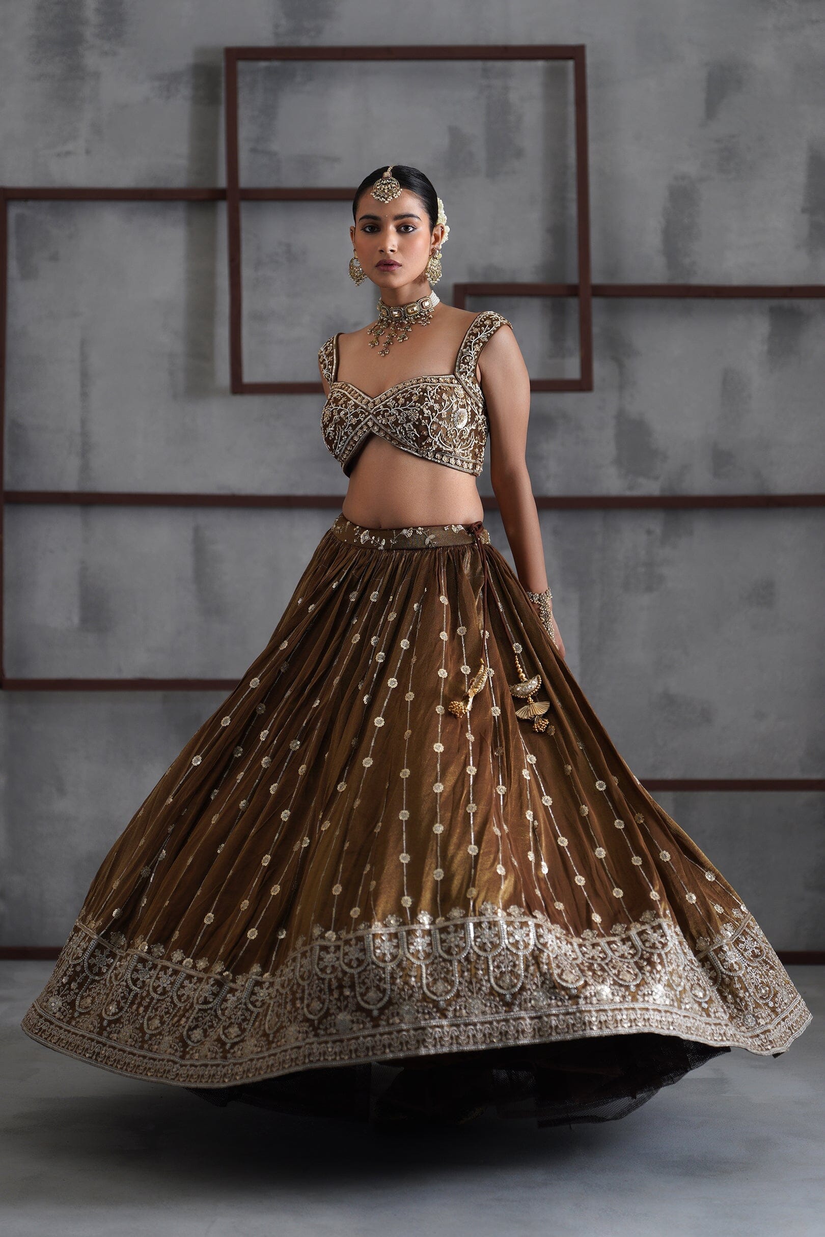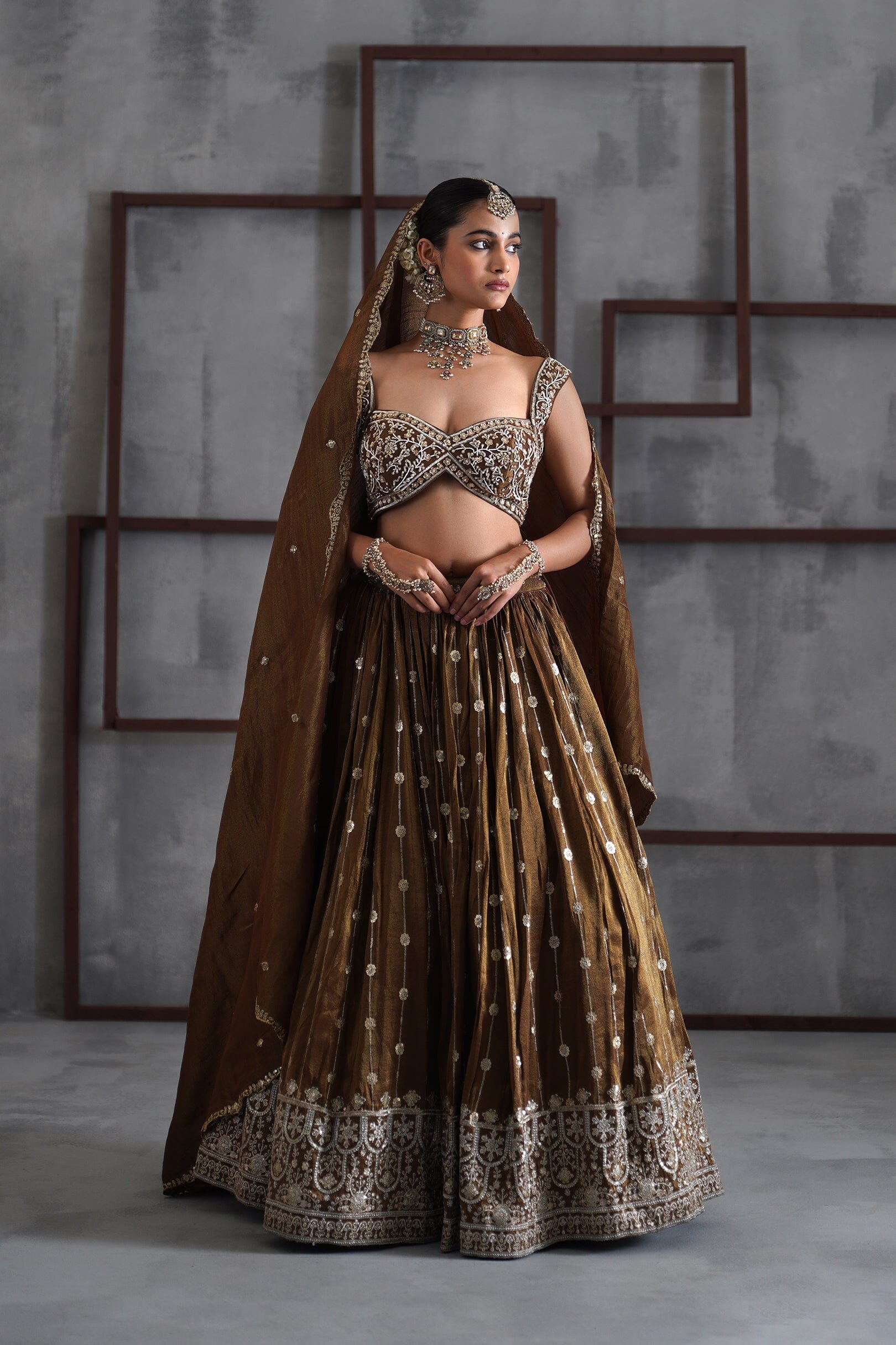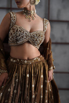 Deepika Chadha's stunning brown and gold cosmo fabric blouse beautifully adorned with intricate pearl , dabka, cutdana and sequins embroidery. The flowy gold and brown cosmo fabric lehanga with borders adds a touch of tradition and sophistication to your look, while the cosmo Dupatta is perfect for wedding and festive season.