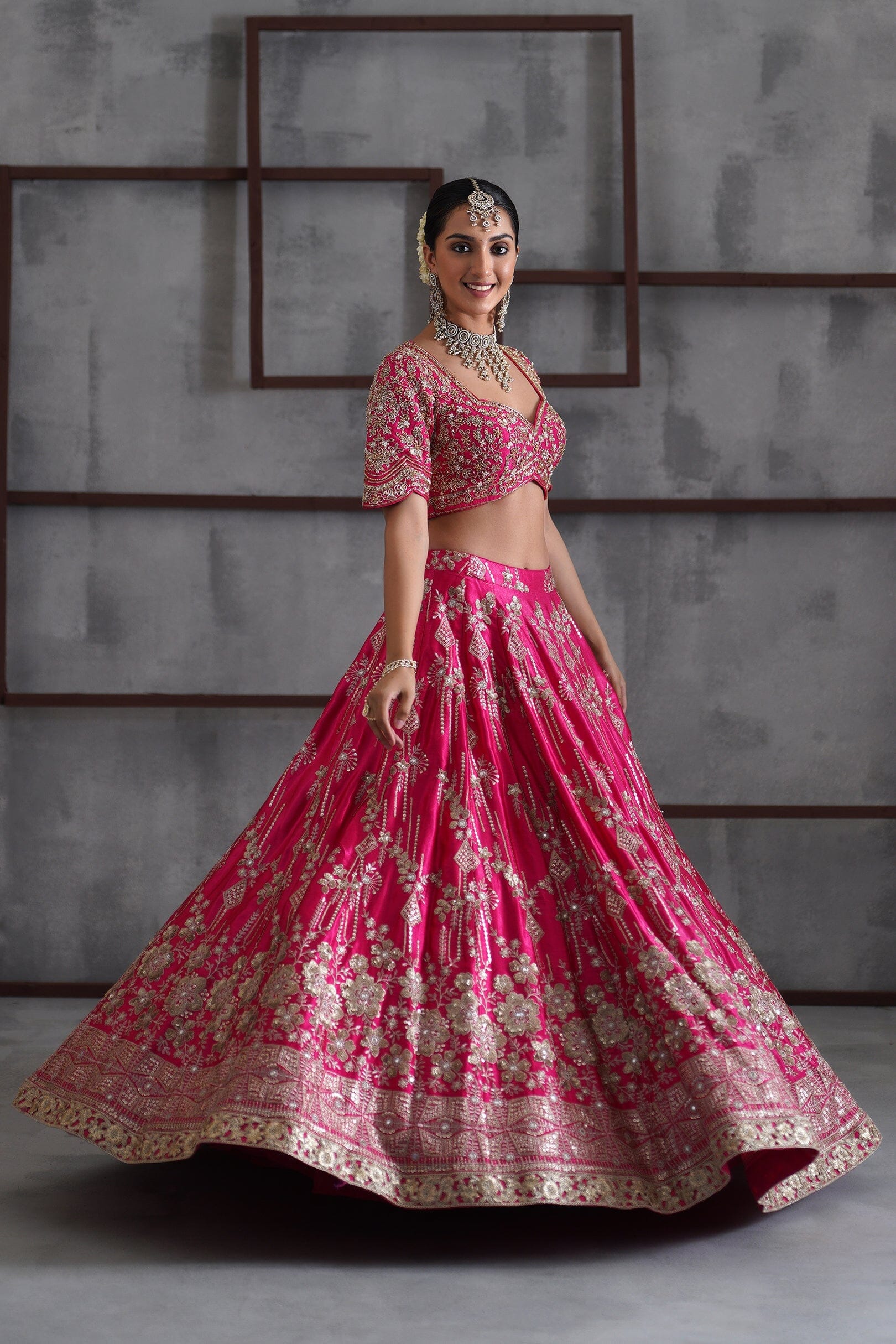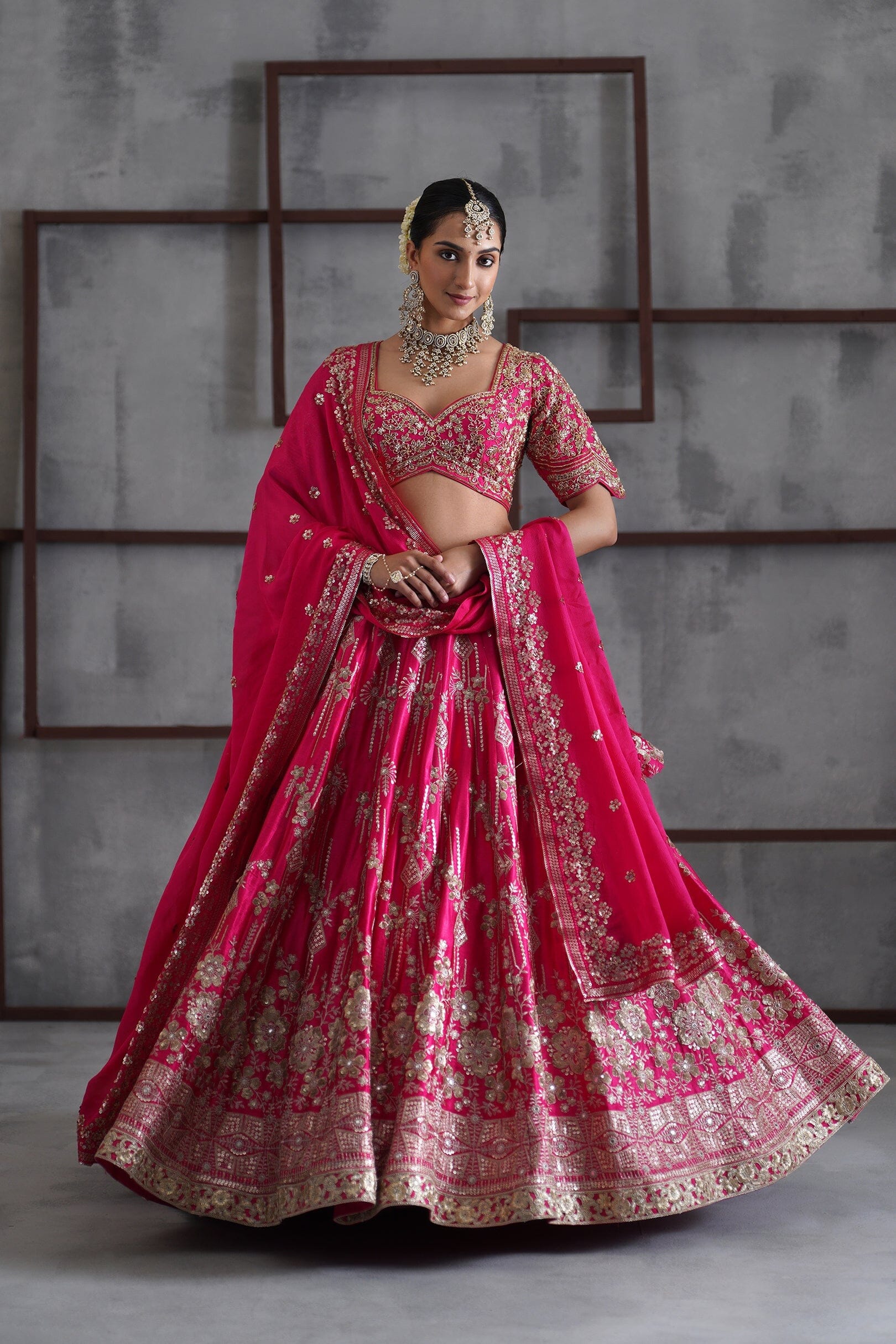 Deepika Chadha's stunning Fuchsia and gold crepe fabric blouse, beautifully adorned with intricate pearls, dabka and sequins embroidery. The flowy Fuchsia and gold mushrooh satin lehenga adds a touch of tradition and sophistication to your look, while the embroidered chinnon Dupatta is perfect for wedding and festive season.