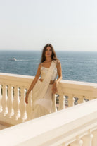 A mirror embellished corset top & drape on a layered skirt. A stunning look that pairs classic details with contemporary style, this ensemble offers effortless elegance and modern sophistication.