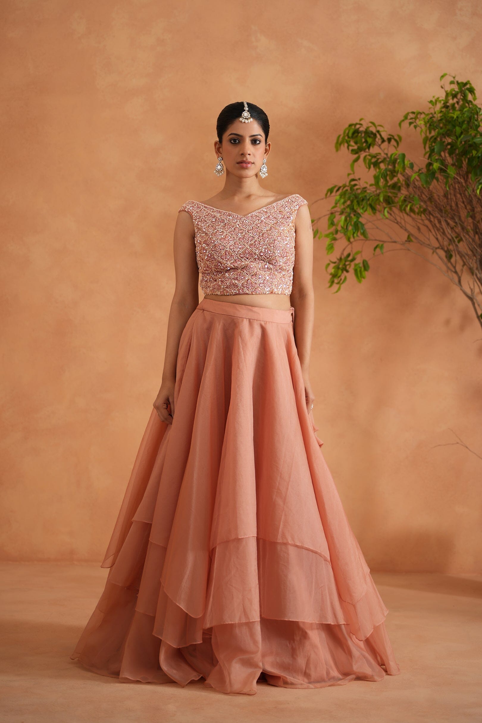 Deepika Chadha's stunning peach net fabric off shoulder blouse beautifully adorned with intricate pearls, sequins, cutdana and crystals embroidery. The flowy peach layered organza fabric lehenga which adds a touch of sophistication to your look. it is paired peach net dupatta with hand embroidered borders which keeps you comfortable all day long and is perfect for wedding and festive season.