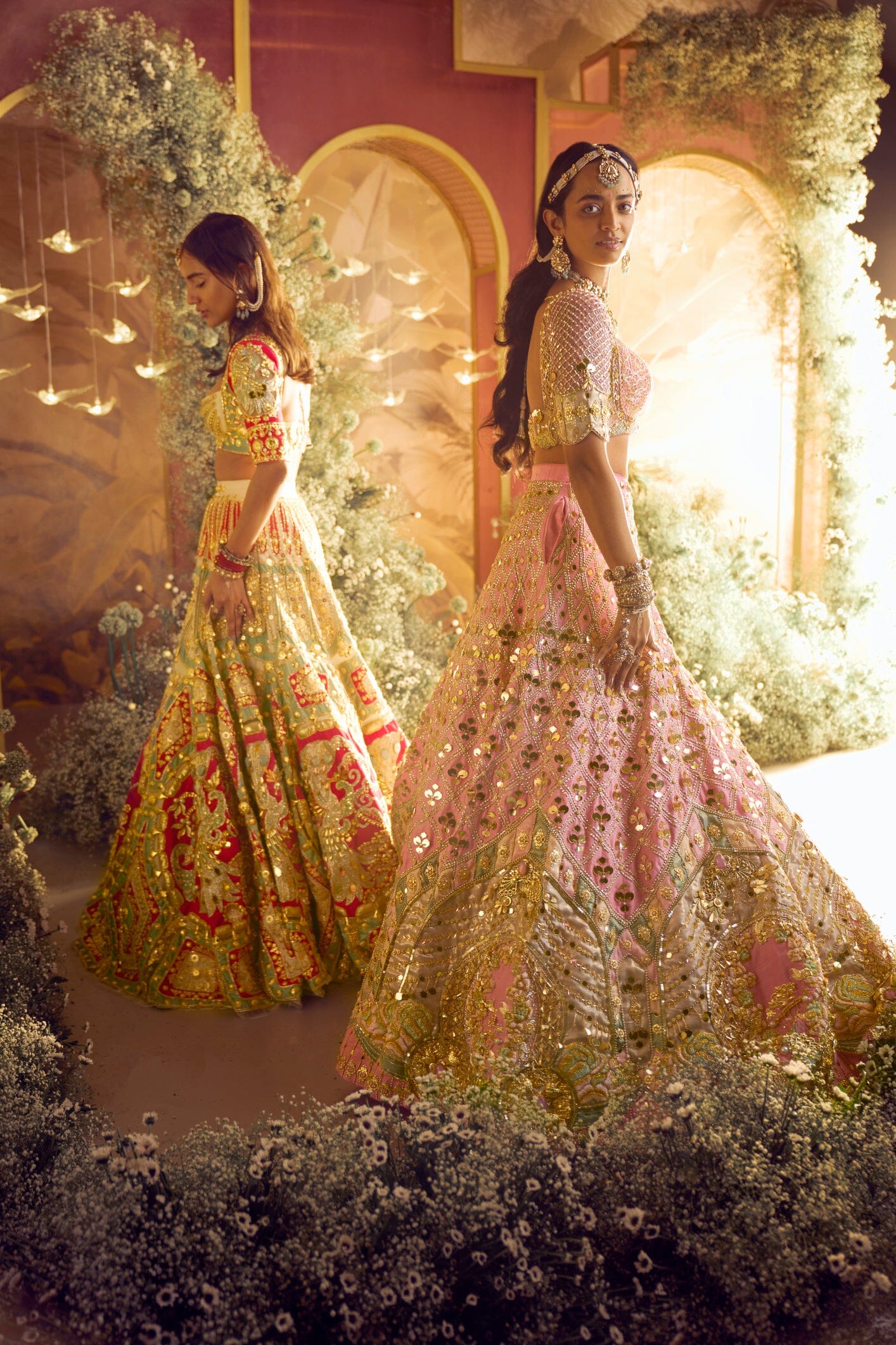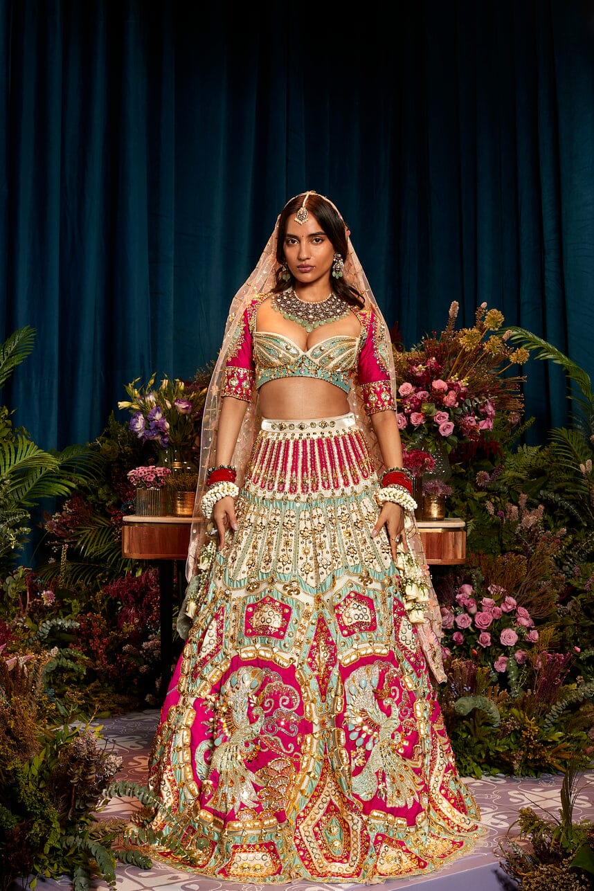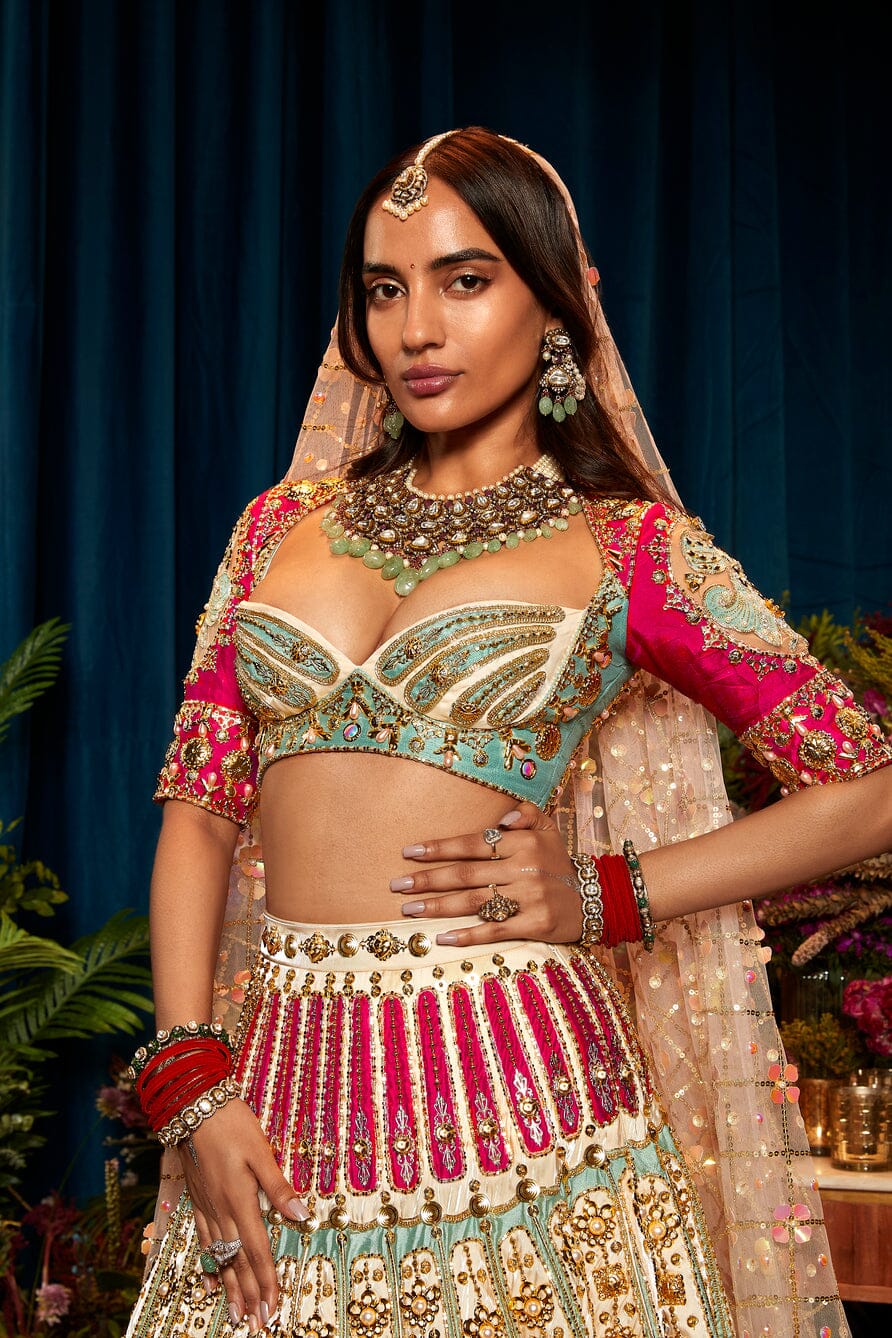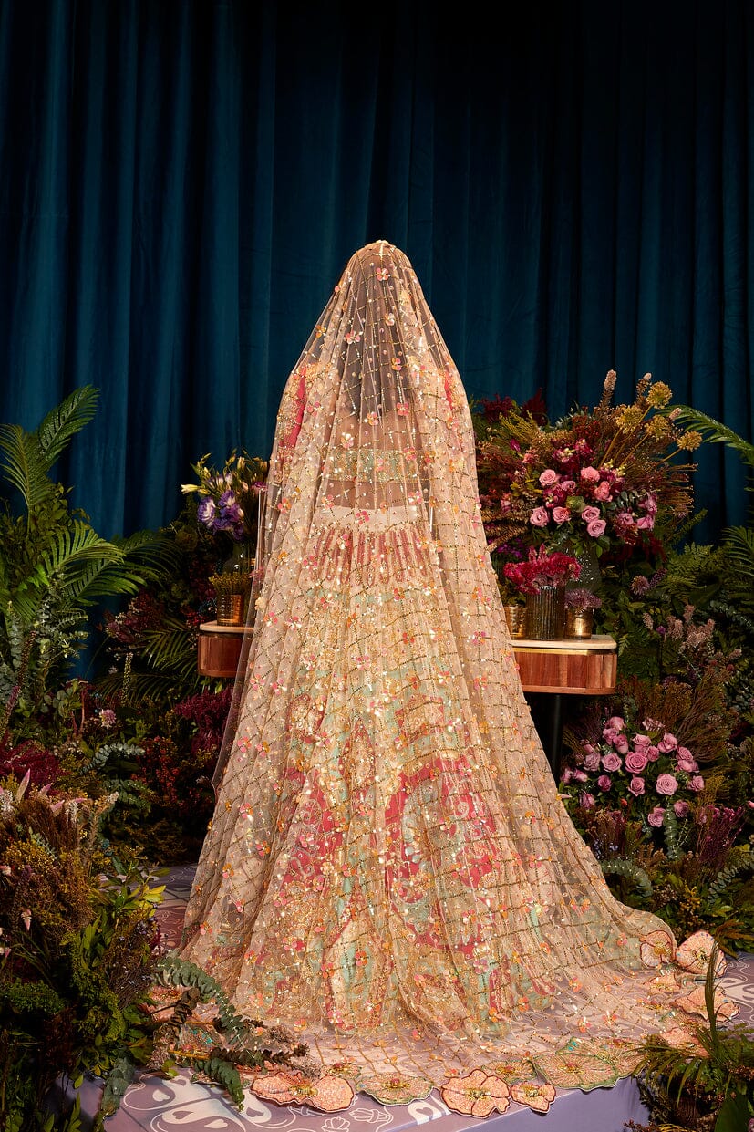 A breathtaking 3-piece ensemble in ivory tulle, adorned with appliqués of red, teal, and ivory silks. Gold metal 3D embellishments, precious stones, and reflective beads create a mesmerizing embroidered pattern. Paired with an elbow-sleeved blouse, appliquéd and embroidered with gold metal embellishments and precious stones. The look is perfected with a head dupatta in pink tulle, adorned with patchworked 3D flowers, metals, sequins, and crystals."