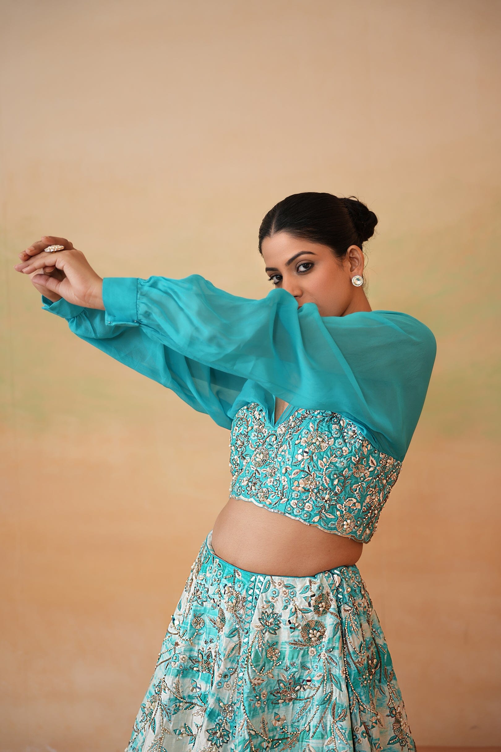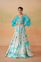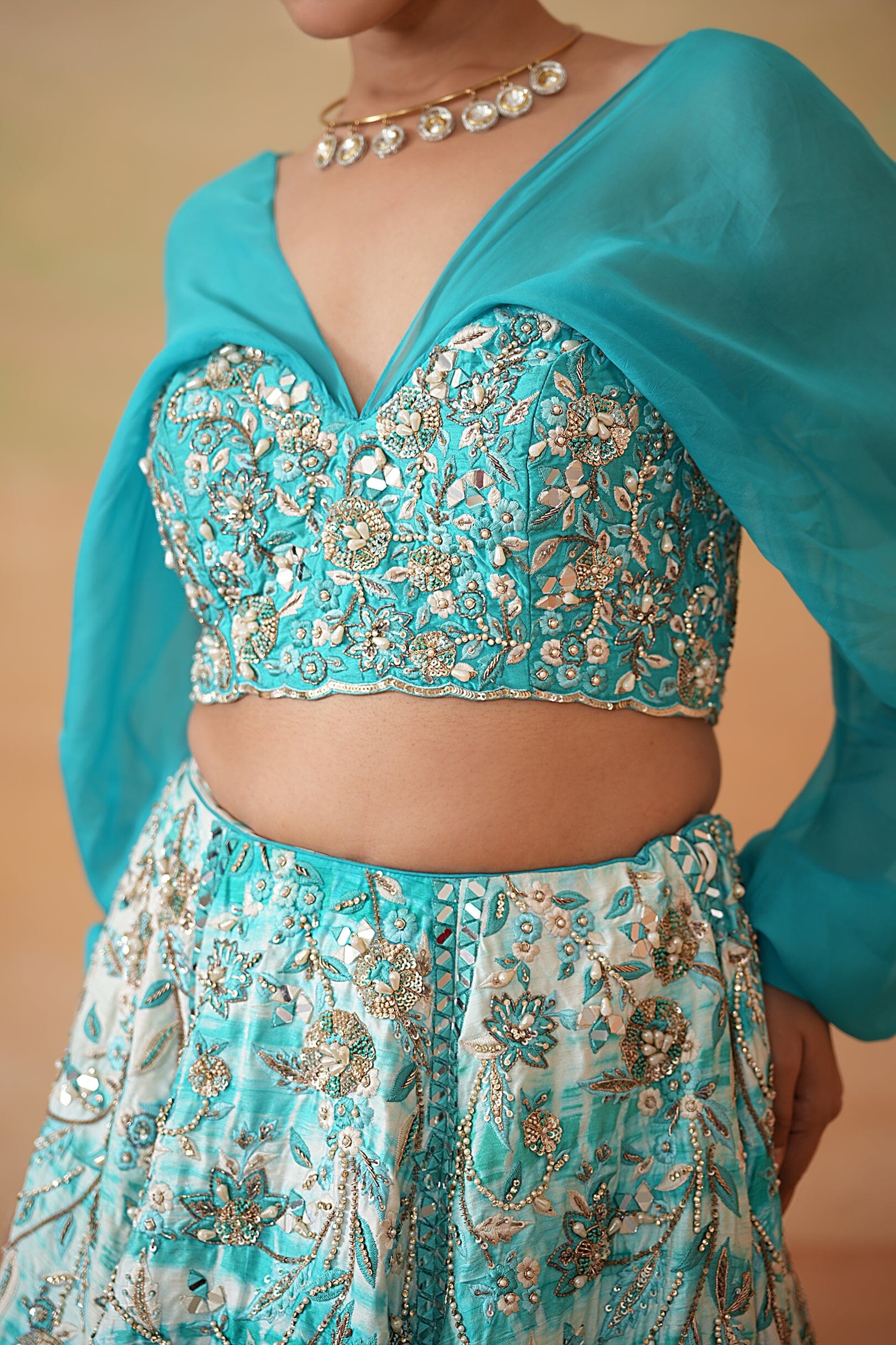 Deepika Chadha's stunning Sky blue organza fabric blouse is beautifully adorned with intricate sequins, pearls, cutdana embroidery. The flowy sky blue and Ivory dupion fabric tie and dye lehenga which adds a touch of sophistication to your look and keeps you comfortable all day long and is perfect for wedding and festive season.