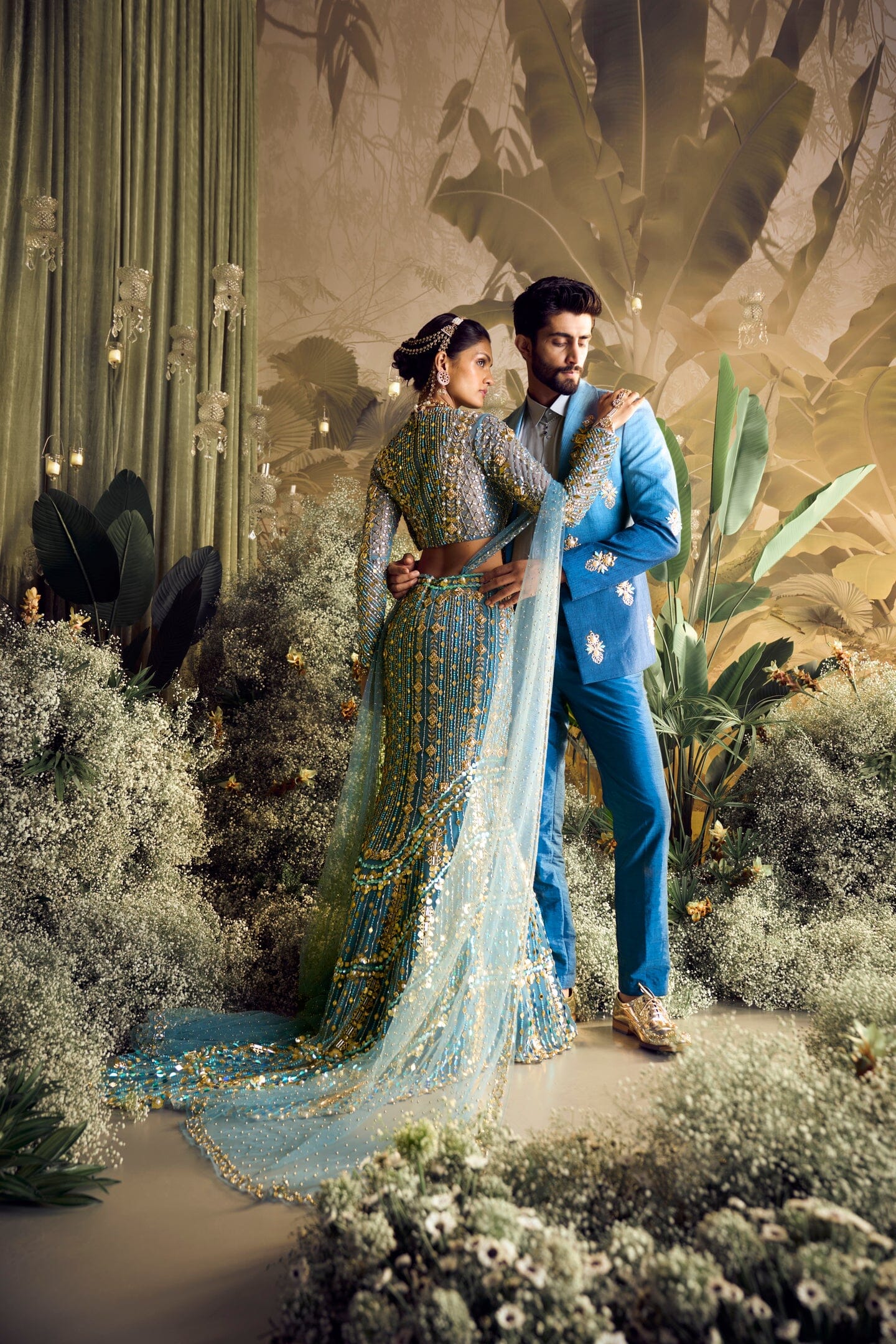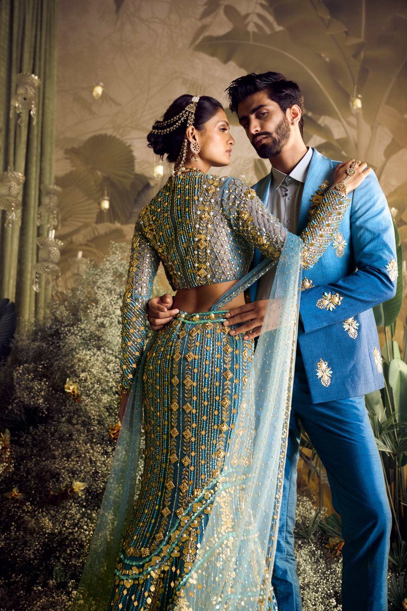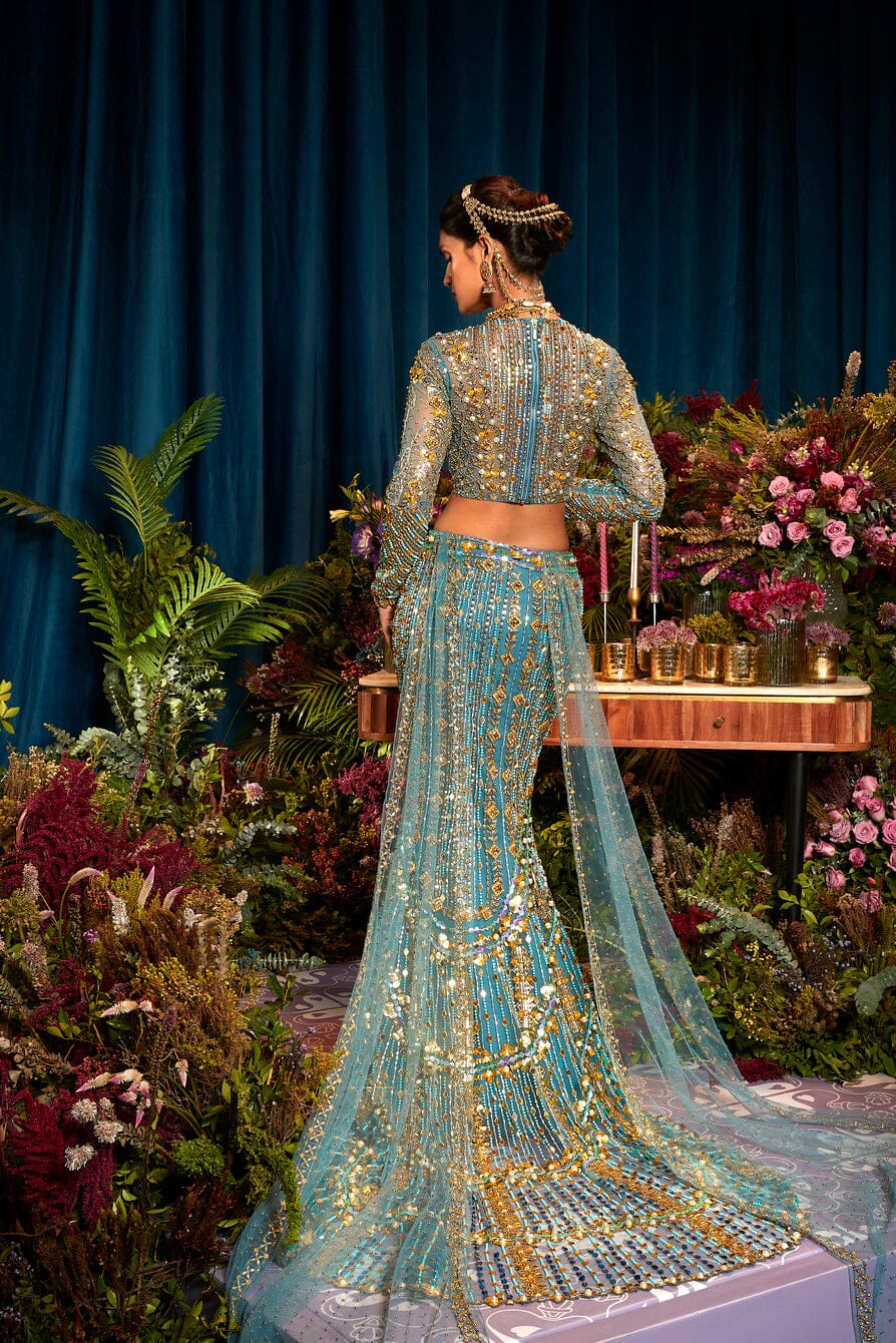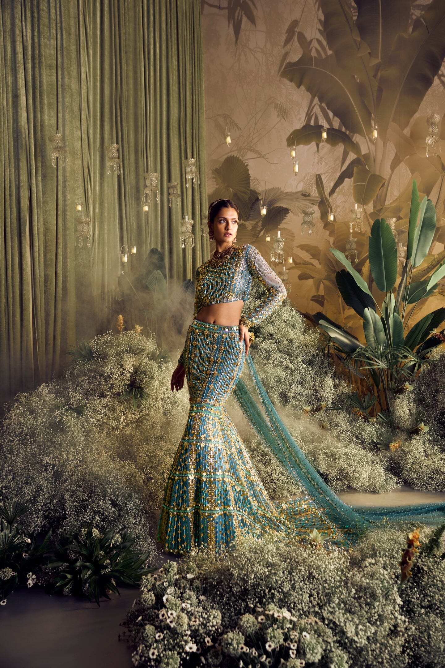 Discover elegance redefined with our Blue mermaid Lehenga. Golden metal and sequin embellishments, cut-outs at the waist, and dangling chains create an enchanting look. The asymmetrical dupatta attached at the waist and full-sleeve covered blouse add a touch of allure. Perfect for those seeking sophistication with a modern twist.