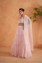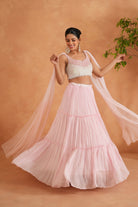 Deepika Chadha's stunning pink and white net fabric blouse beautifully adorned with pearl hangings embroidery. The flowy baby pink tired georgette fabric lehenga adds a touch of sophistication to your look, while the choker Dupatta is perfect for wedding and festive season.