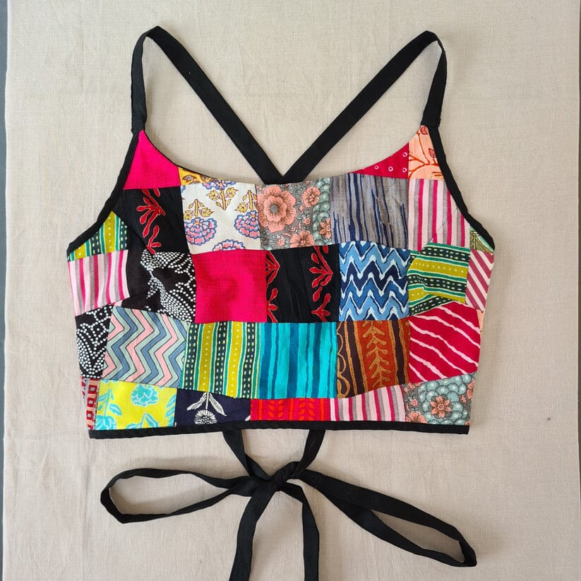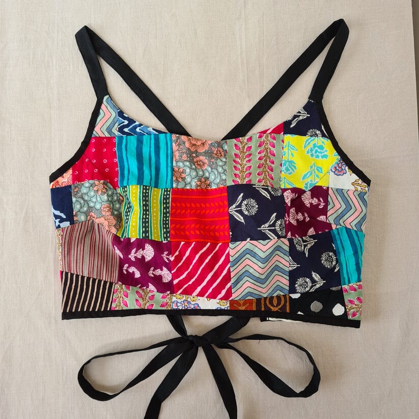 Introducing our must-have 🌞 "Patchwork Summer Top"! This trendy crop top is the perfect addition to your summer wardrobe. Made from colorful fabric scraps ♻️, this top is not only fashionable but also sustainable. The patchwork design adds a unique touch, making it a true statement piece. The top features shoulder straps and a back tie-up, allowing you to adjust it for the perfect fit