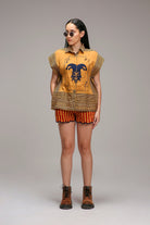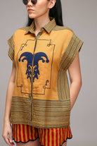 JOKER kaftan shirt features detailed hand applique work and intricate hand thread embroidery, adding a unique artisanal touch. It comes paired with a matching handwoven cotton bralette for a coordinated look. You can complete the outfit with our hand block-printed shorts, finished with delicate embroidered scallop detailing.