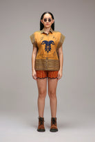 The Joker Kaftan Shirt showcases detailed hand-appliqué work and intricate hand-thread embroidery, bringing a unique artisanal charm to your wardrobe. It comes paired with a matching handwoven cotton bralette for a coordinated look. The set includes our signature hand block-printed shorts, featuring two front pockets and two back patch pockets, finished with delicate scalloped embroidery for an elegant touch.