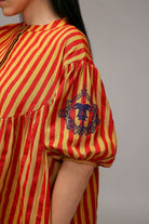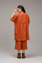 The Classic Acra Tunic is a loose, OVERSIZED comfortable kaftan-style outfit made from handspun cotton. It features hand-block printed stripes and beautifully hand-embroidered sleeves with joker thread work. With a front button opening and handy side pockets, it blends ease with style. Pair it with the matching striped pants for a complete and modern look.