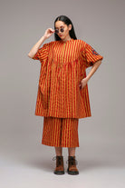 The Classic Acra Tunic Set features a relaxed, an OVESIZED kaftan-style tunic crafted from soft, handspun cotton with hand-block printed stripes. The sleeves are beautifully detailed with intricate joker thread hand embroidery, adding a touch of artisanal charm. Designed with a front button opening and side pockets, it offers both comfort and functionality. The set comes with matching striped capri pants featuring a full elasticated waist and side pockets making it a complete and effortlessly stylish look.
