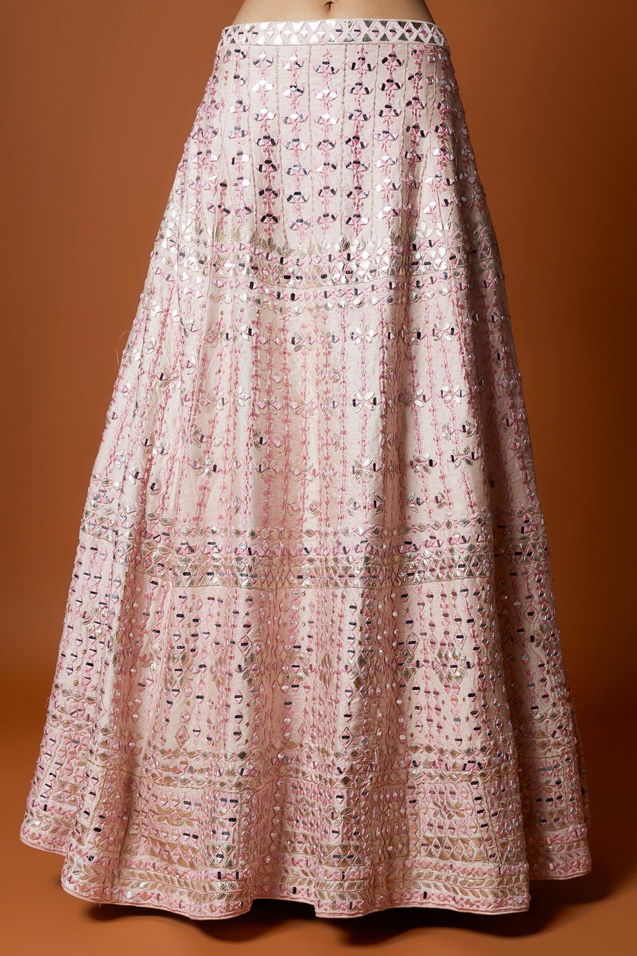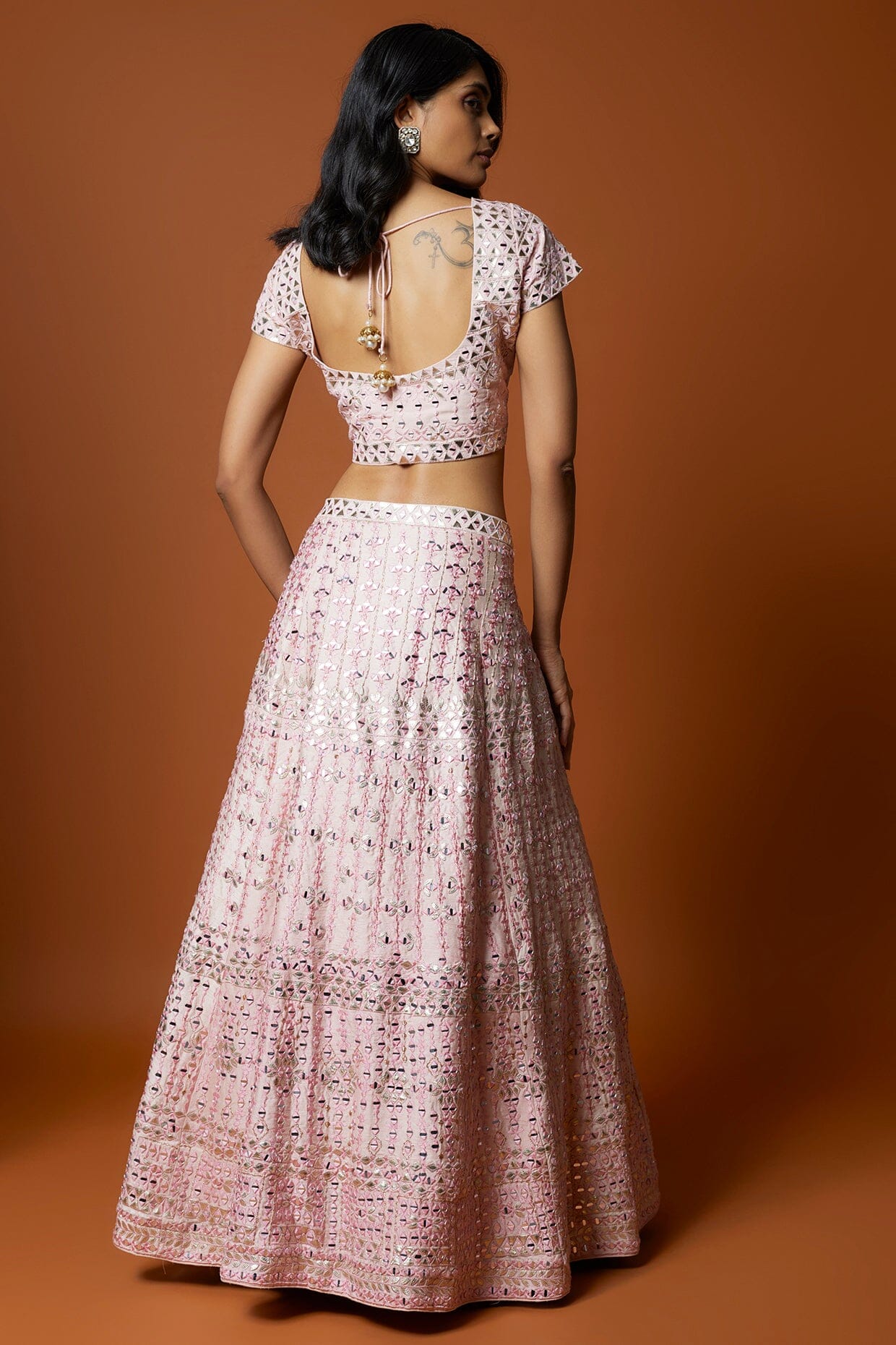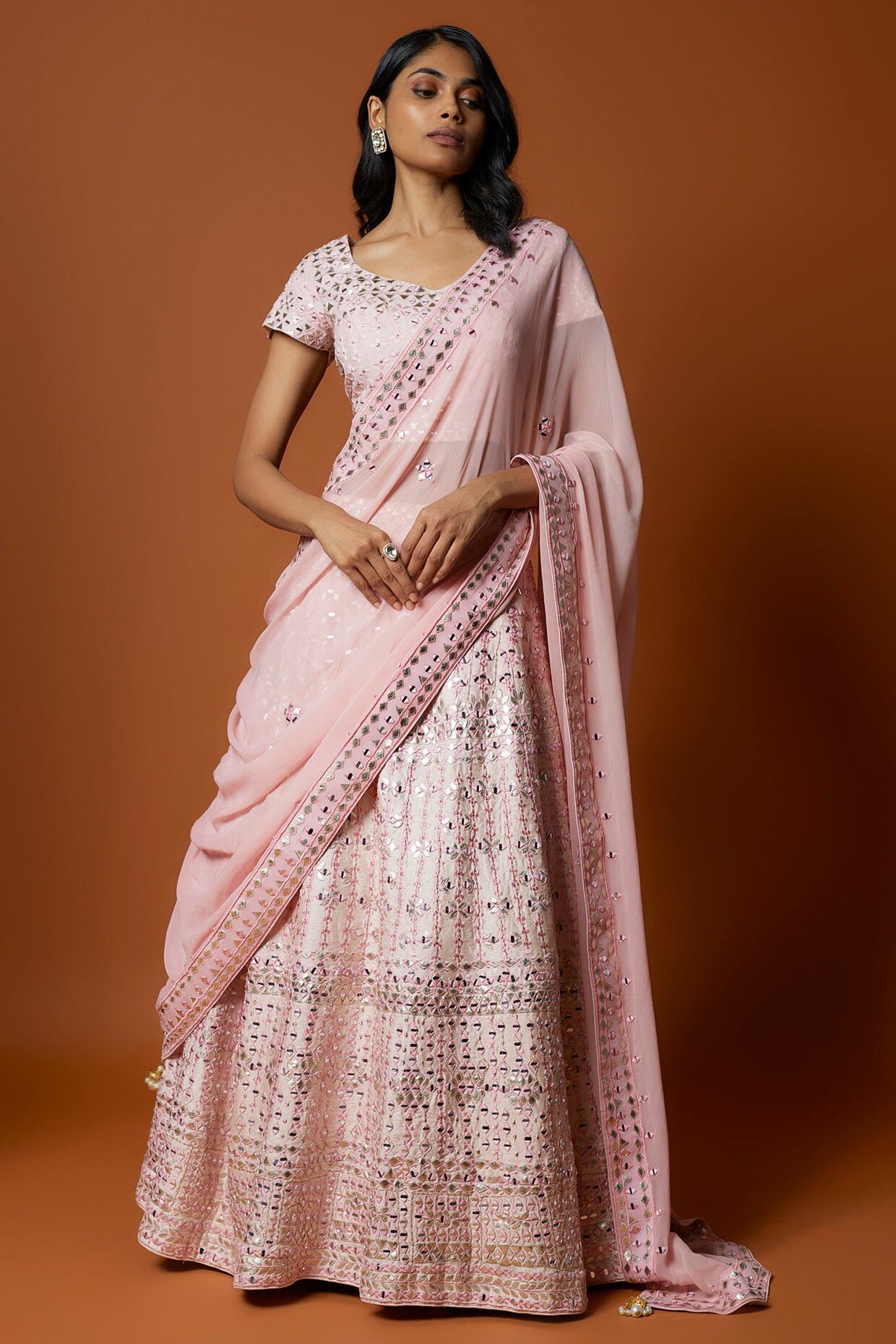 The Baby Pink Choli, Lehenga, and Dupatta set offer timeless elegance with intricate thread and mirror embroidery, accentuated by delicate gota work. The chic georgette dupatta adds versatility, allowing it to be draped as a sari for a contemporary look or worn traditionally as a classic dupatta, making it a perfect choice for any special occasion.