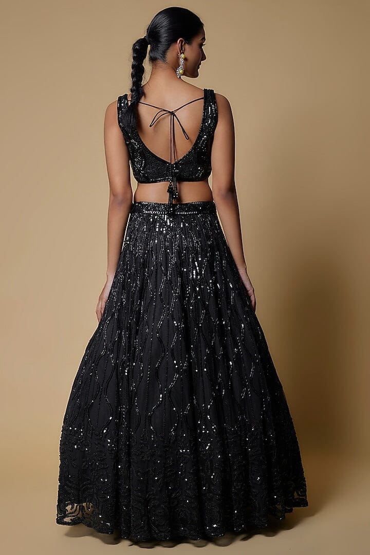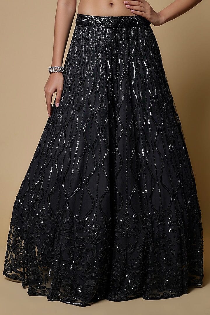 Dazzle at sangeet and cocktail nights in our glamorous black lehenga set, adorned with intricate beads, tubes and sequins embroidery all over. Paired with a beautiful organza dupatta featuring rose cutwork design, it exudes elegance and shine.