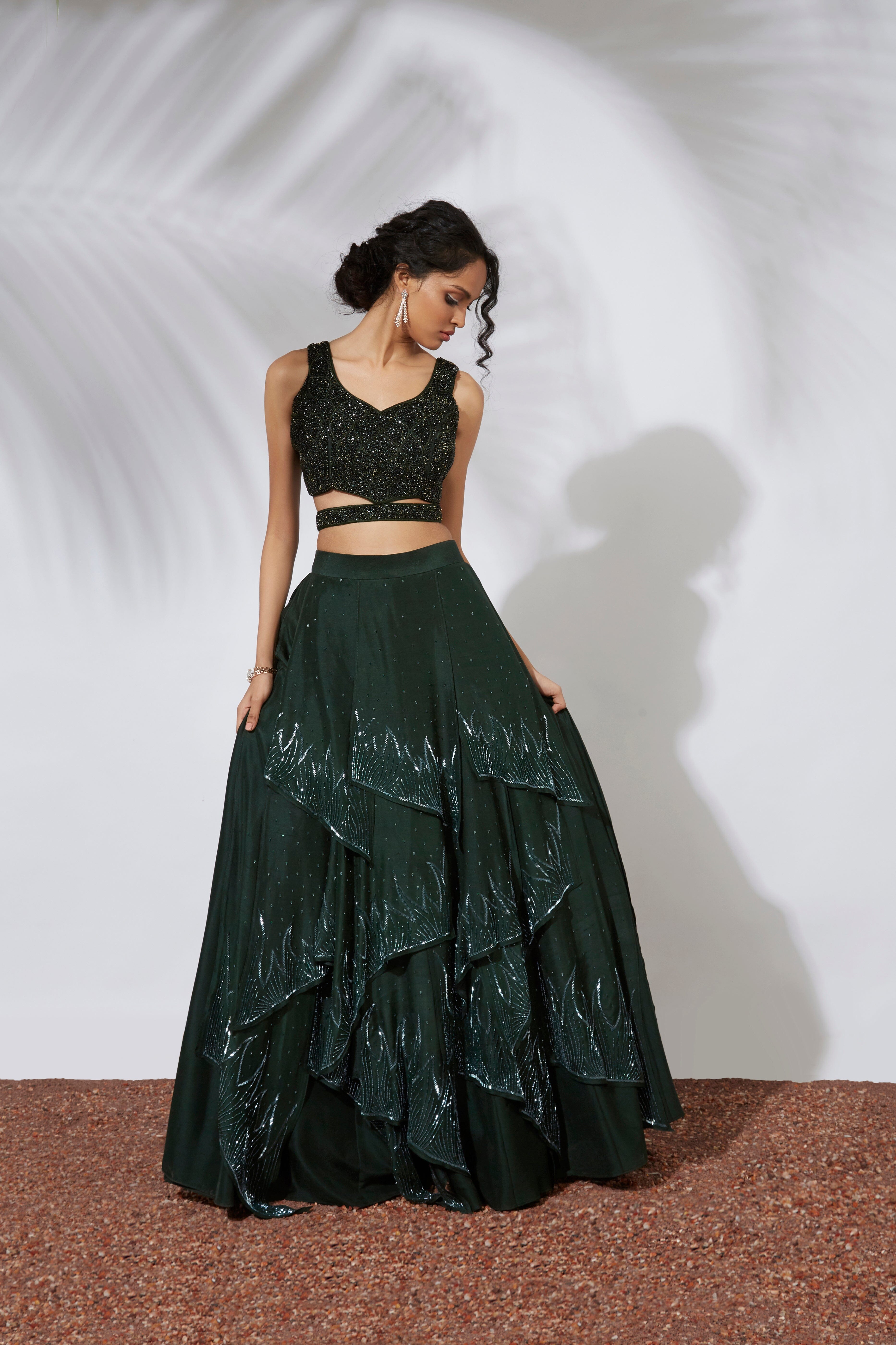 Indulge in the mystical emerald hues of this 32-panel lehenga and delight in the elaborate embellishments of beads, tubes, thread and sequins that grace the cropped top. Embrace your inner forest fairy as you gracefully glide through the day in this luxurious and refined ensemble.