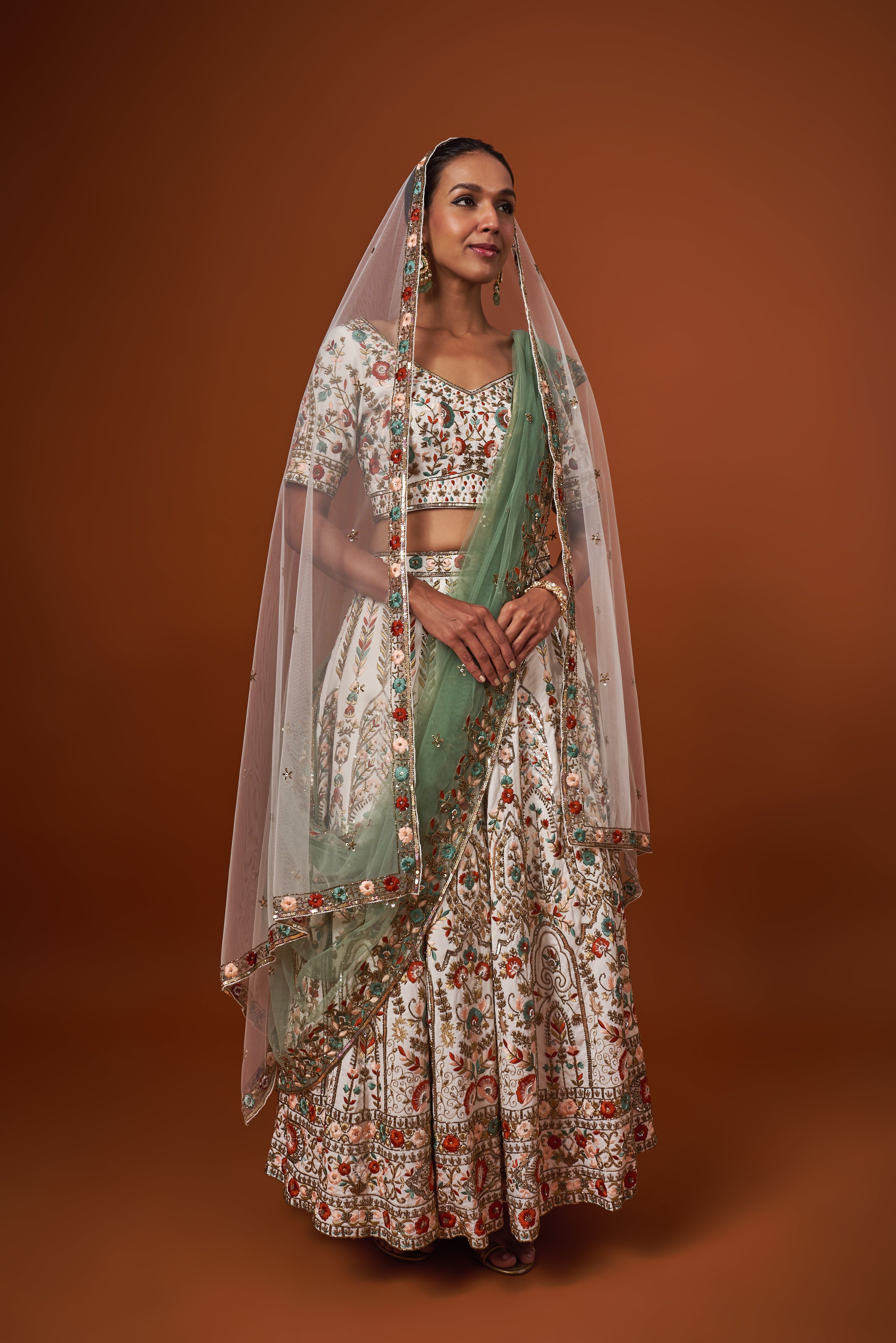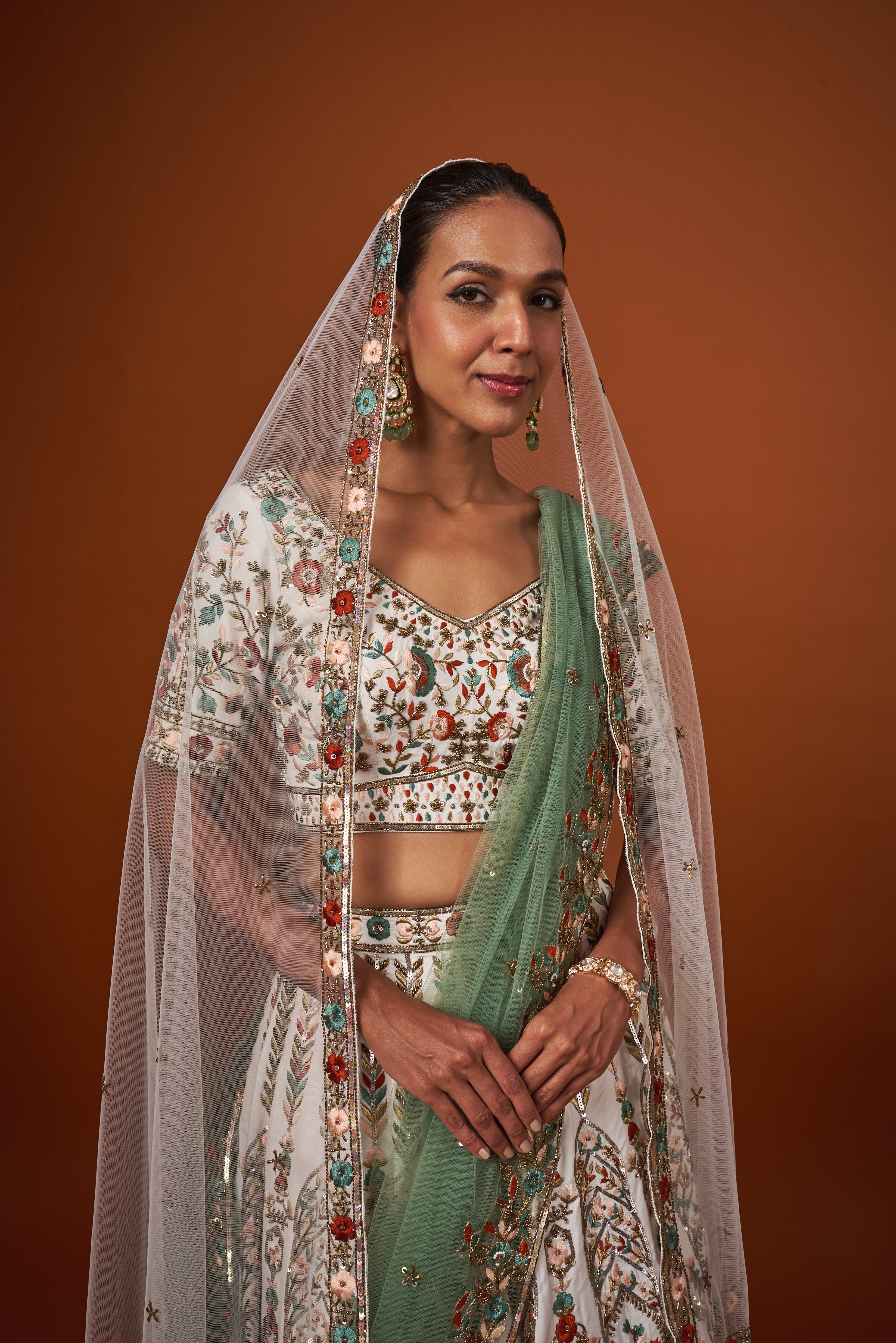 Elevate your bridal elegance with our ivory lehenga choli set, adorned with equisite dull gold detailing and thread embroidery in shades of baby pink, rust and green. Complete the look with dual dupattas - one in ivory and one in stunning sea green, for a captivating bridal ensemble.