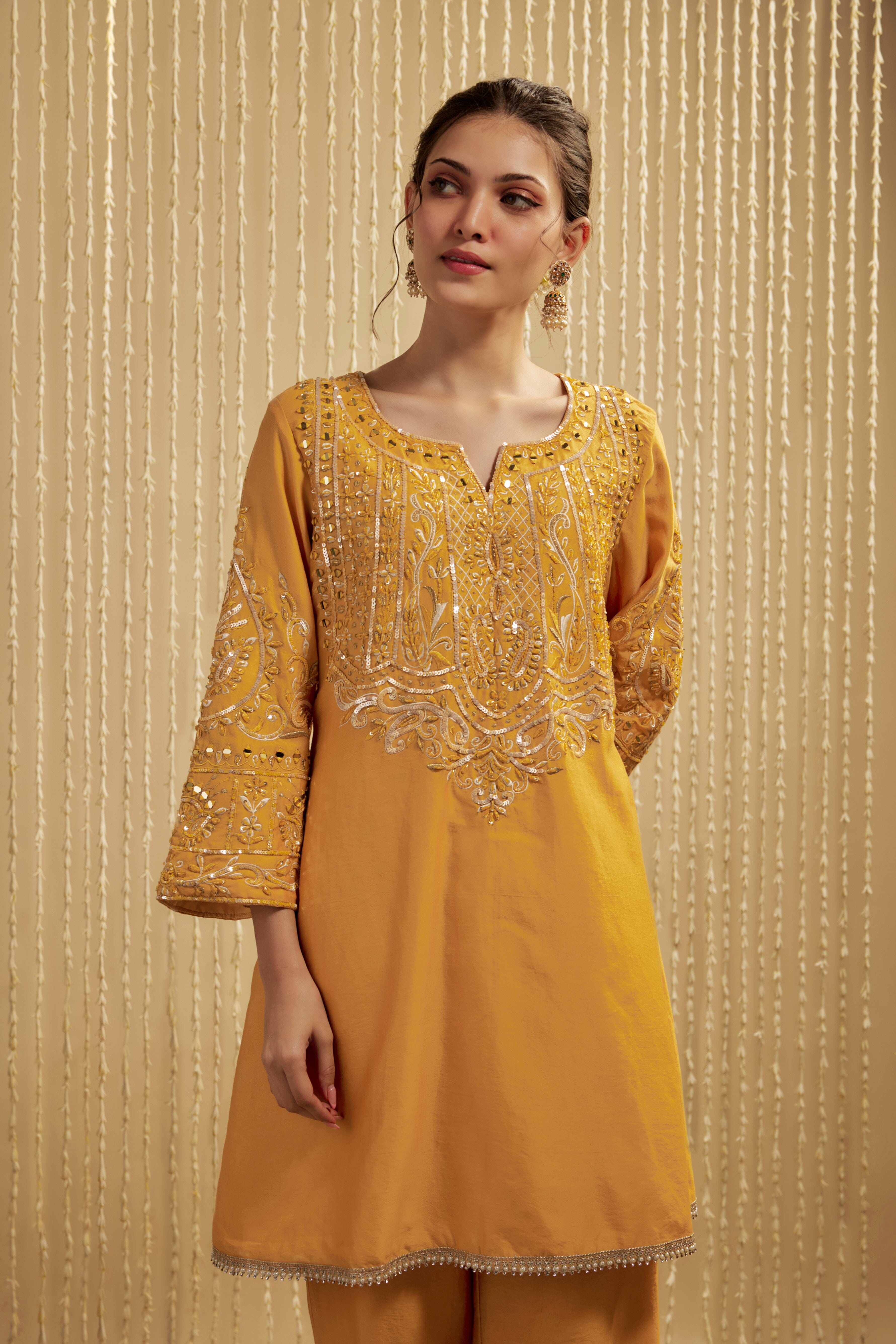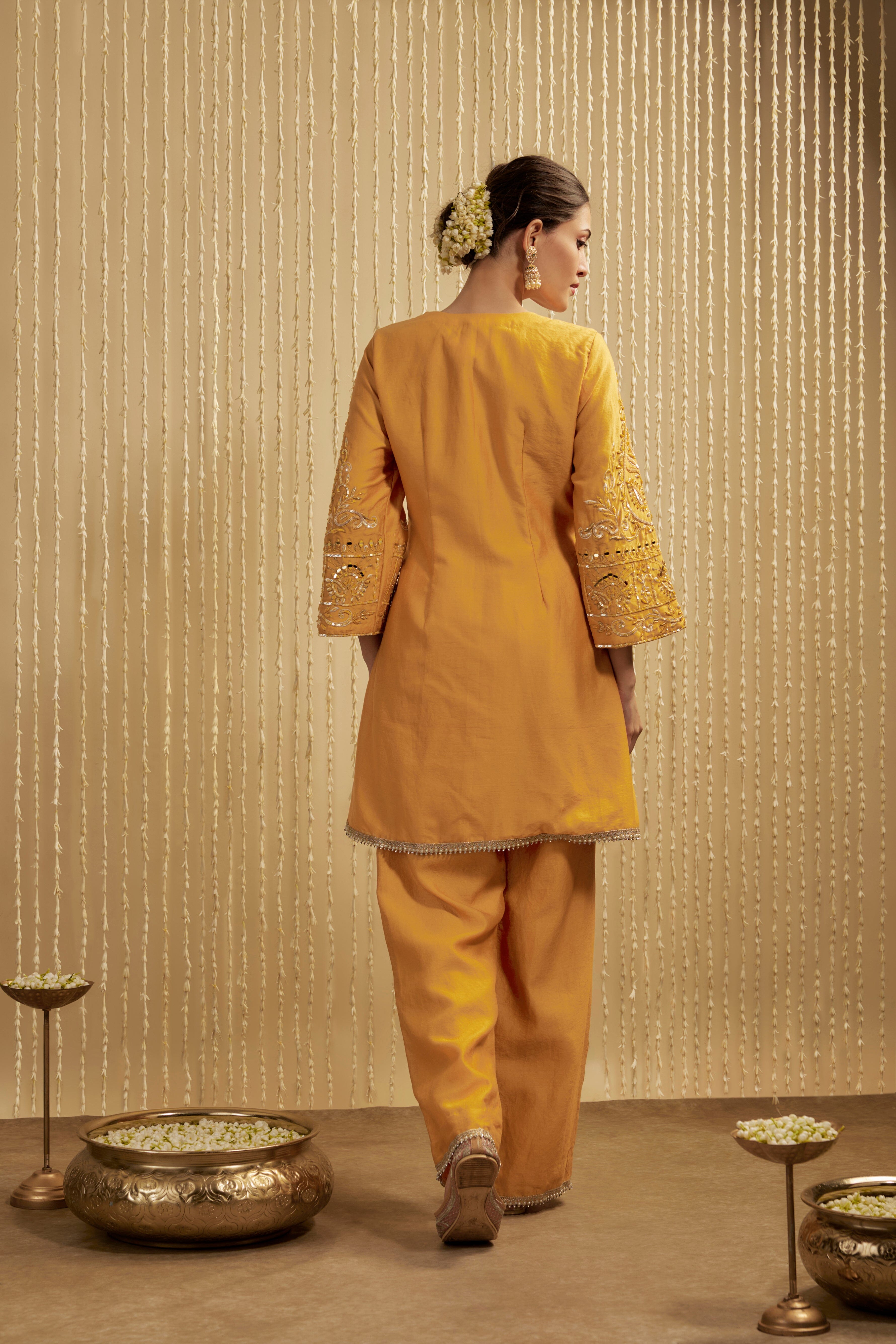 This mustard yellow Chanderi short kurta pants set exudes a perfect blend of dressy comfort. Delicately embroidered with gold detailing, it’s ideal for wedding functions like Mehendi and Haldi. Style it up or down for a versatile, elegant look that’s both festive and refined. The vibrant color and intricate embroidery make it a standout choice for formal occasions.