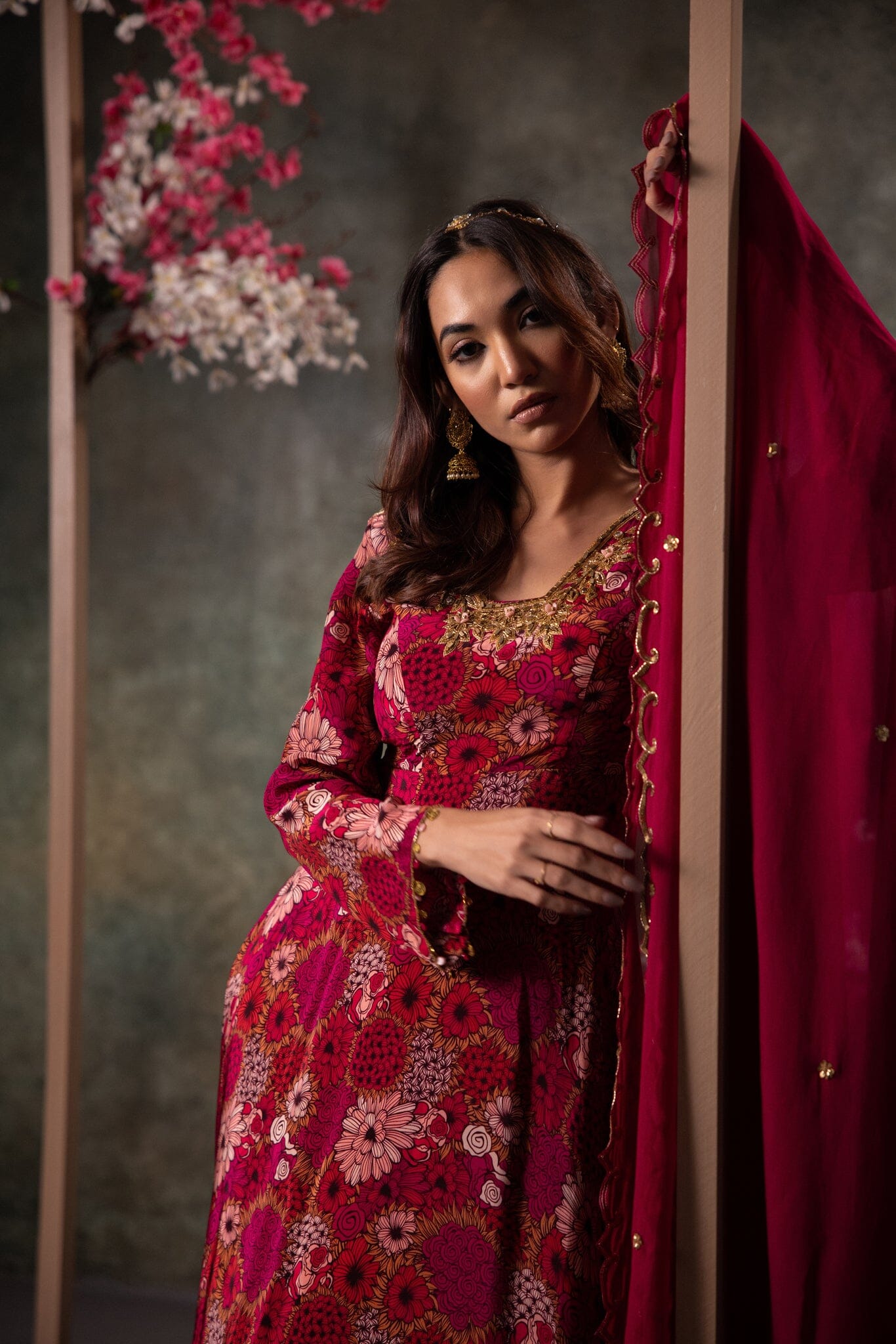 Pink Printed Anarkali And Dupatta Set With Embroidery