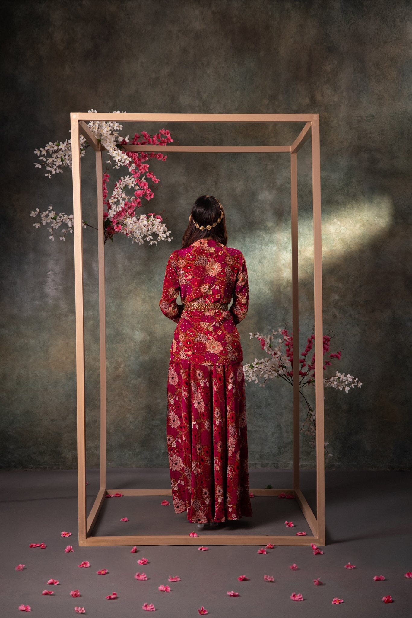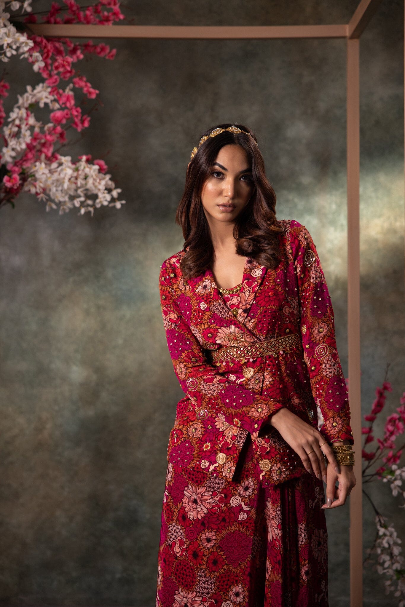 Elevate your style with this stunning pink floral draped skirt paired with a bold, waist-cutout choli adorned in gold embroidery. Complete with a blazer and belt featuring intricate detailing, this ensemble blends modern flair with traditional charm, perfect for the fashion-forward youth.