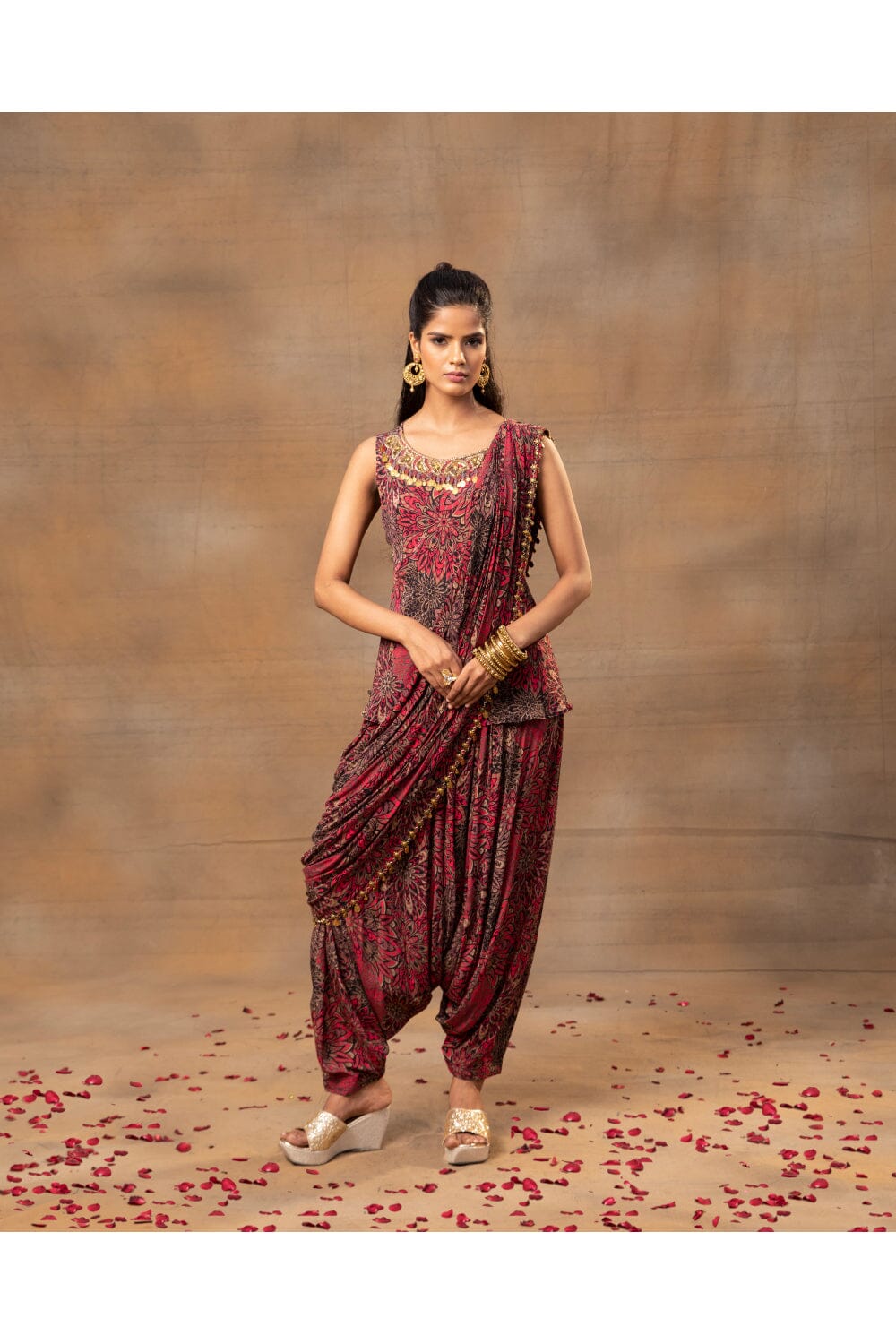 Introducing our stunning Pink Floral Printed Short Sleeveless Top, exquisitely adorned with intricate embroidery along the neckline for an elegant touch. This captivating ensemble is paired with comfortable Low Crotch Dhoti Pants that fuse style with ease, offering a contemporary twist to traditional attire. The ensemble is completed by a detachable pre-pleated Drape with exquisite hanging embroidery at the edges, elevating your look to new heights of sophistication. Embrace the charm of this unique outfit and make a bold fashion statement at any special occasion.