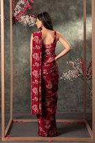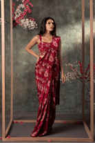 This pink floral printed pre-draped saree offers effortless elegance—just zip up and you're ready to go. Paired with a sexy choli featuring a chic waist cut-out and gold embroidery, it's perfect for daytime wedding festivities.