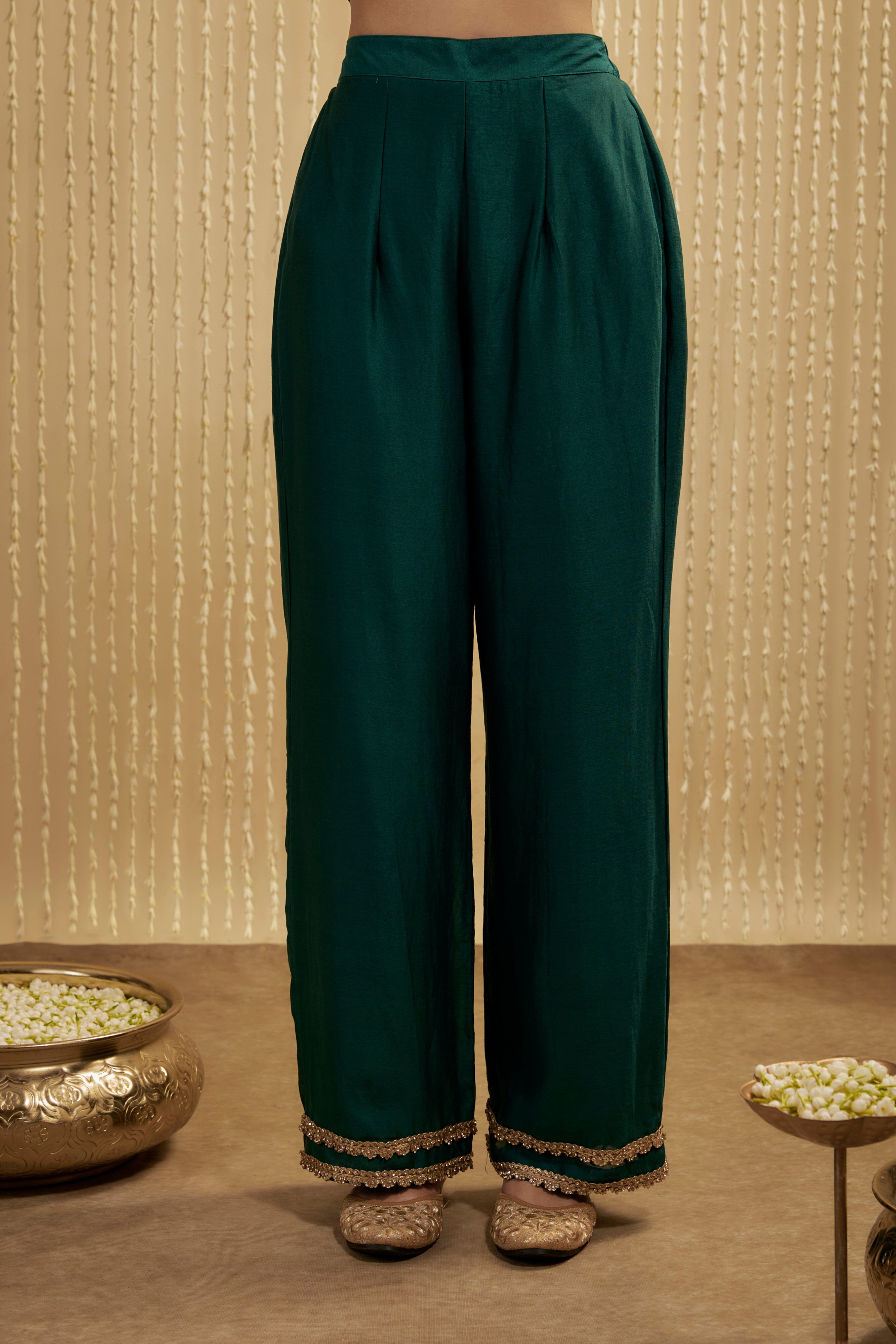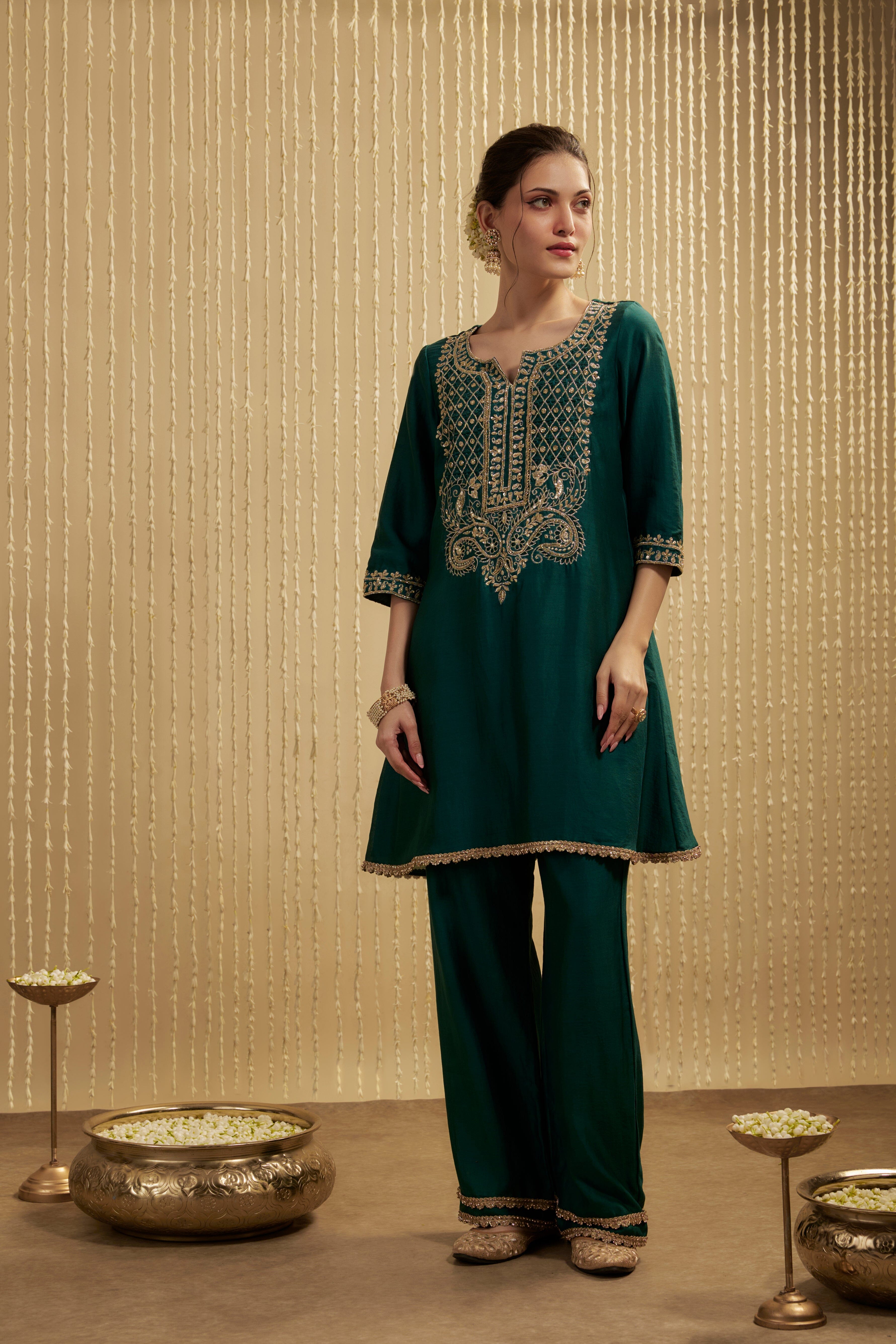 This teal green Chanderi short kurta-pants set exudes dressy comfort, perfect for any occasion. Delicately embroidered with intricate details and formal gold accents, it effortlessly transitions from casual to elegant. Ideal for wedding functions, this set blends traditional charm with modern versatility.