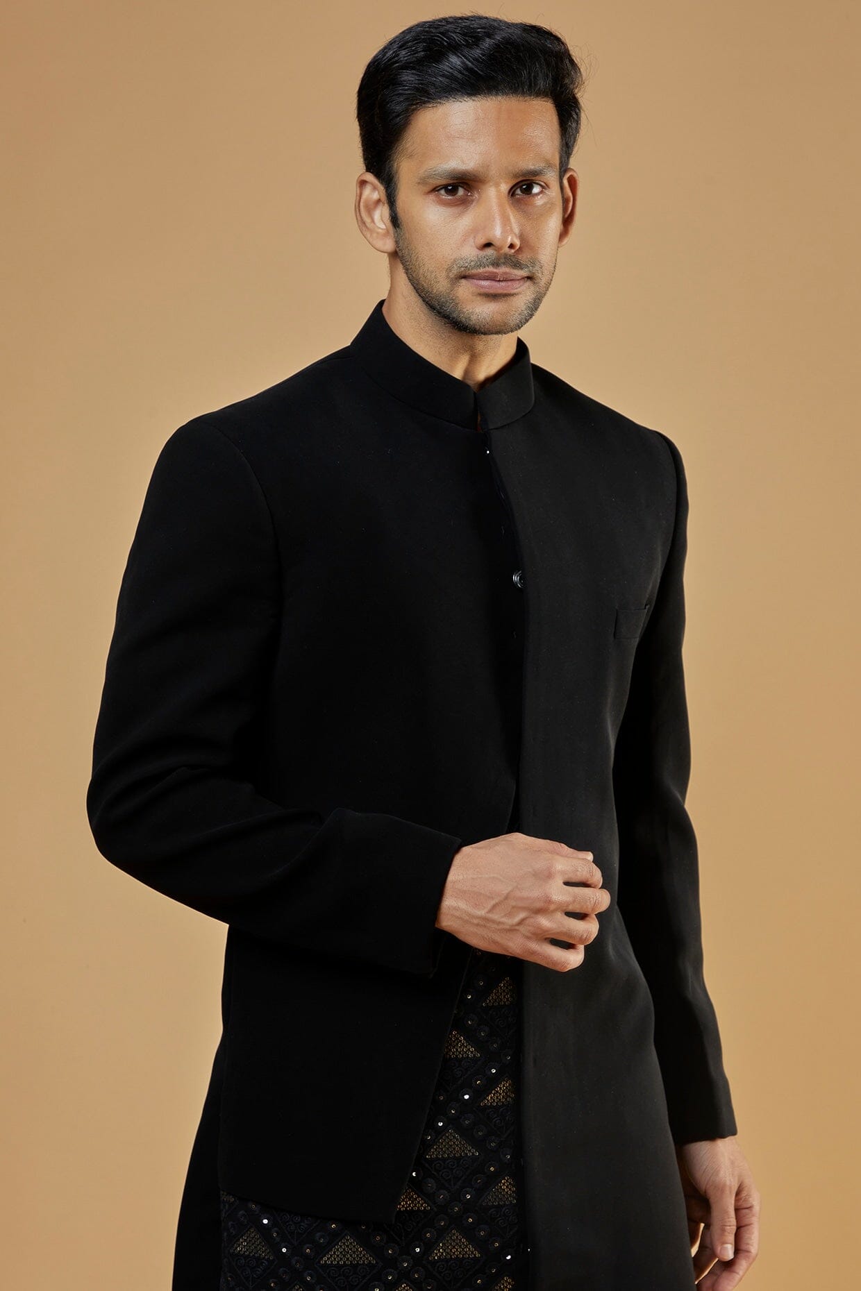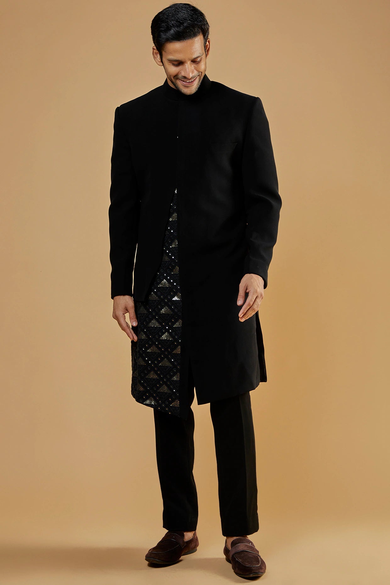 Featuring a black panelled indowestern jacket in viscose base with machine embroidery. It is paired with matching pants.