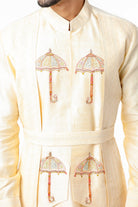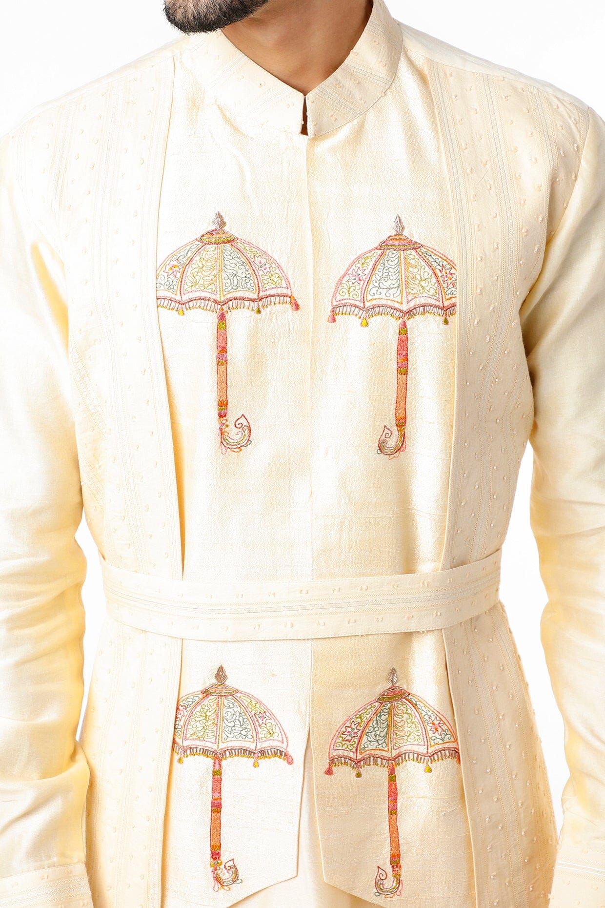A very unique 3 paneled kurta with embroidery of an umbrella inspired from a chariot. Same color cotton lycra churidar Fabric- cotton chanderi, raw silk.