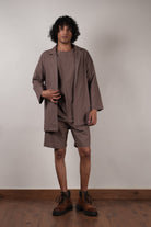 A half sleeve t-shirt and shorts with jacket set all in handwoven cotton. This set comes in 3 pcs.