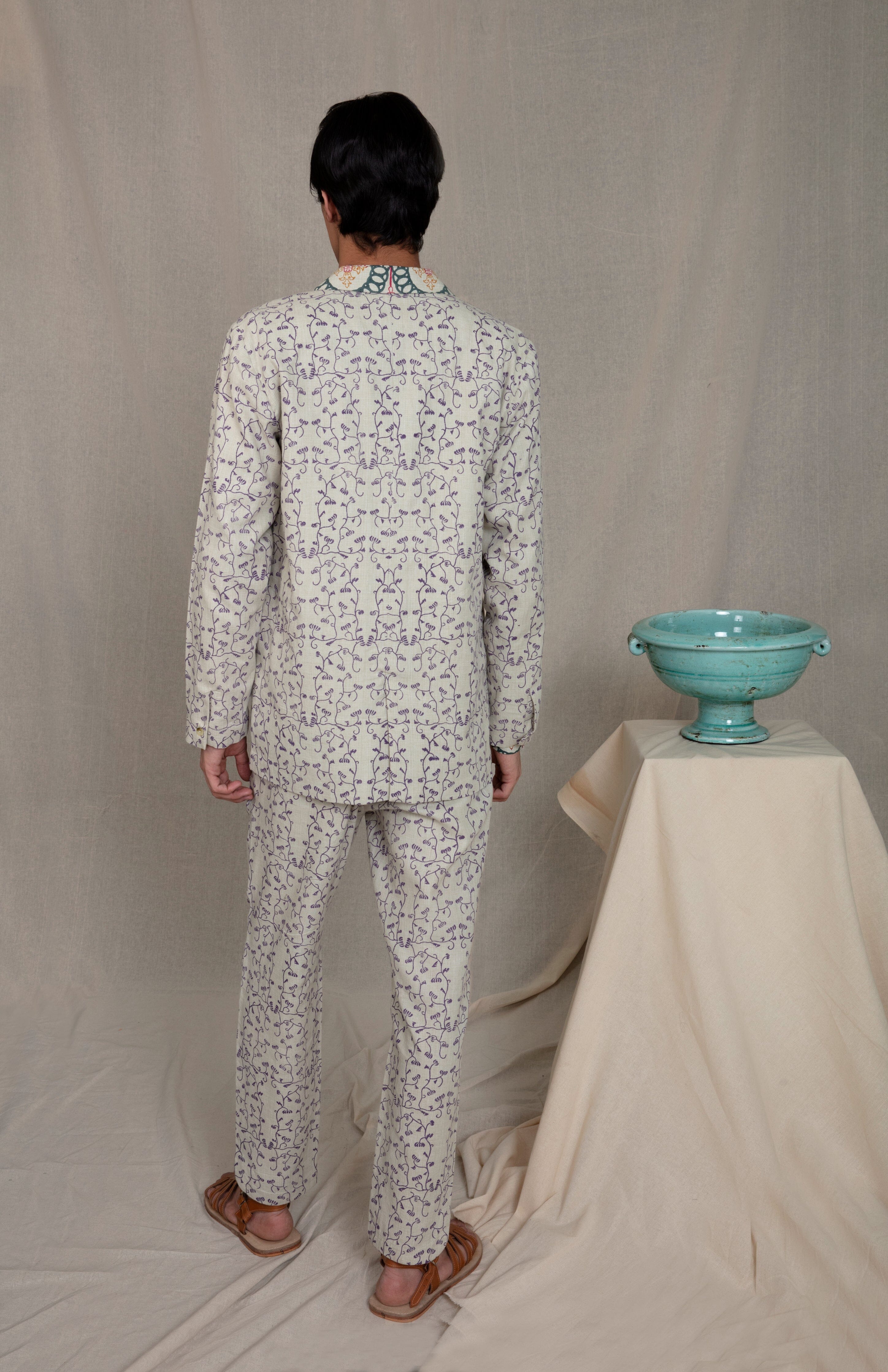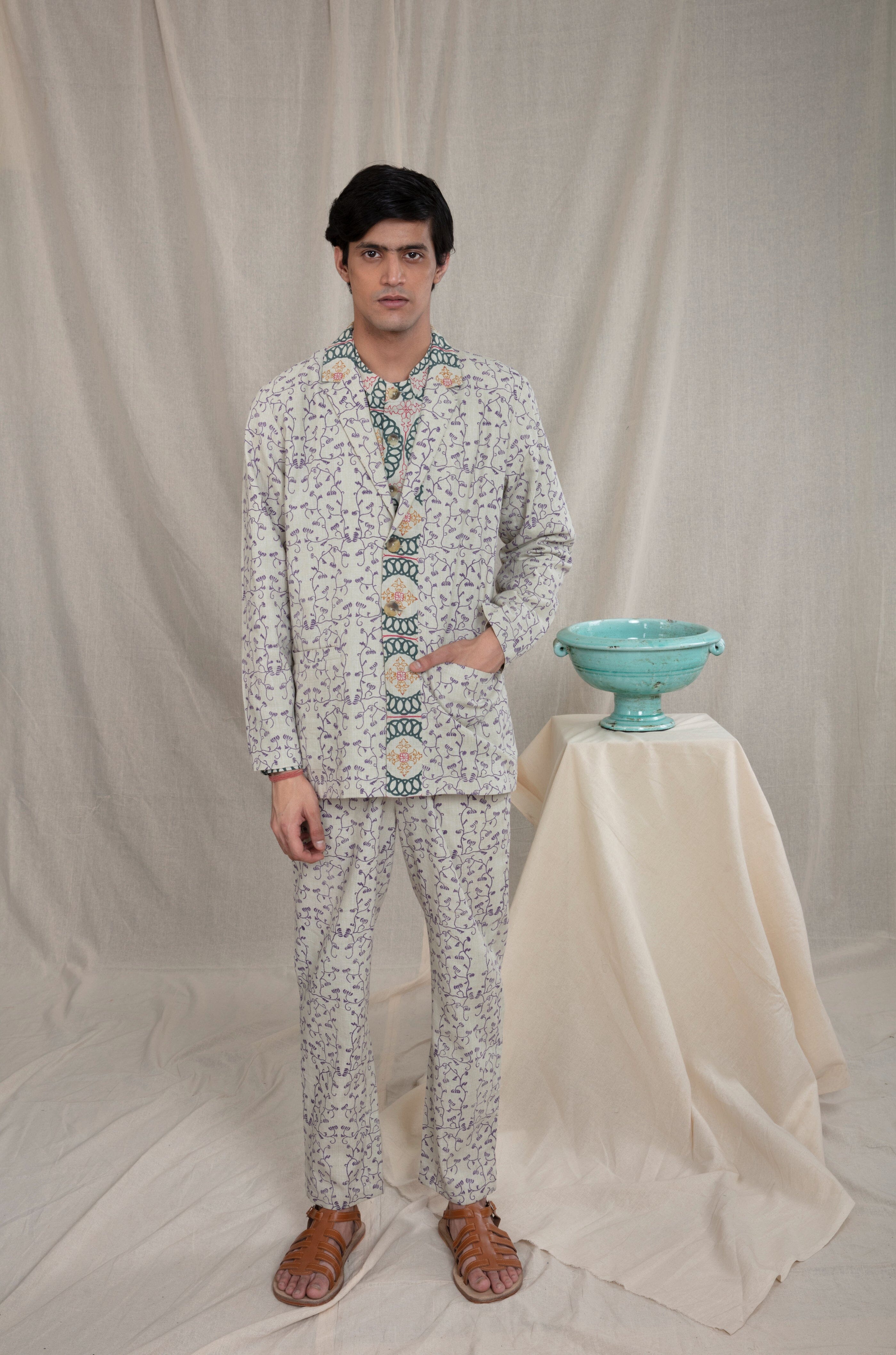 This lightweight jacket is elegant yet eclectic. It features a notch lapel, contrasting print detail, welt pockets and is finished with two buttons. Pair it with our cropped pants to complete the look.