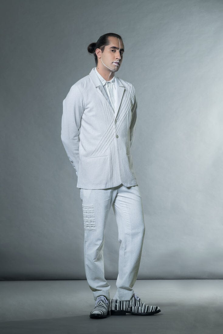 A crisp white jacket constructed of handwoven jute cotton with welt pockets and pin tucks to give it minimal details.