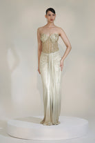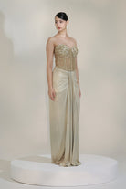 Command attention in this exquisite ensemble. A subtle gold embroidered corset, rich with intricate detailing, pairs perfectly with a flowing drape dhoti skirt, crafting a look that's both opulent and effortlessly chic. Unleash your inner goddess."