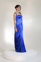 Minimal yet striking, this Armani satin corset saree is elegance redefined. The corset blouse features a pleated bust with structured boning for a perfect cinch, creating a sculpted fit. Paired with a fluid pre-draped saree, the ensemble blends modern sophistication with timeless charm — a true statement in understated luxury.