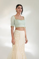 Graceful and commanding, this organza satin lehenga set is crafted for modern celebrations. The blouse is edged with delicate hand embroidery, mirrored on the dupatta borders for refined detail. The skirt blooms with intricately embroidered flowers placed in soft intervals, finished with an elegant trail that adds drama and movement.