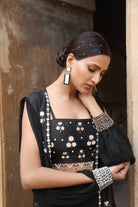 Featuring Black silk bustier with dabka, nakshi, mirror, zari, beads embroidered paired with silk cape with georgette balloon sleeves and georgette gharara with detailings.