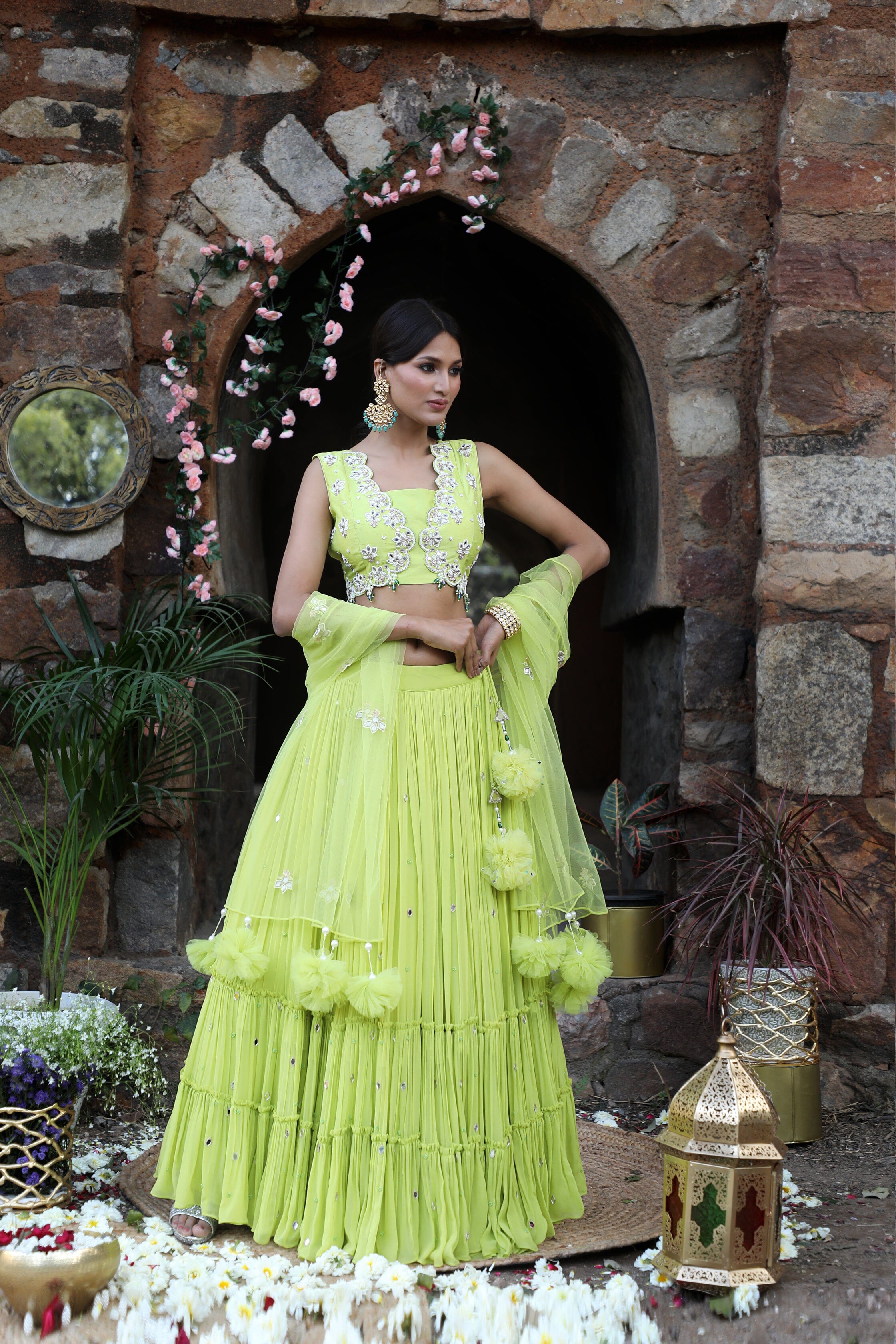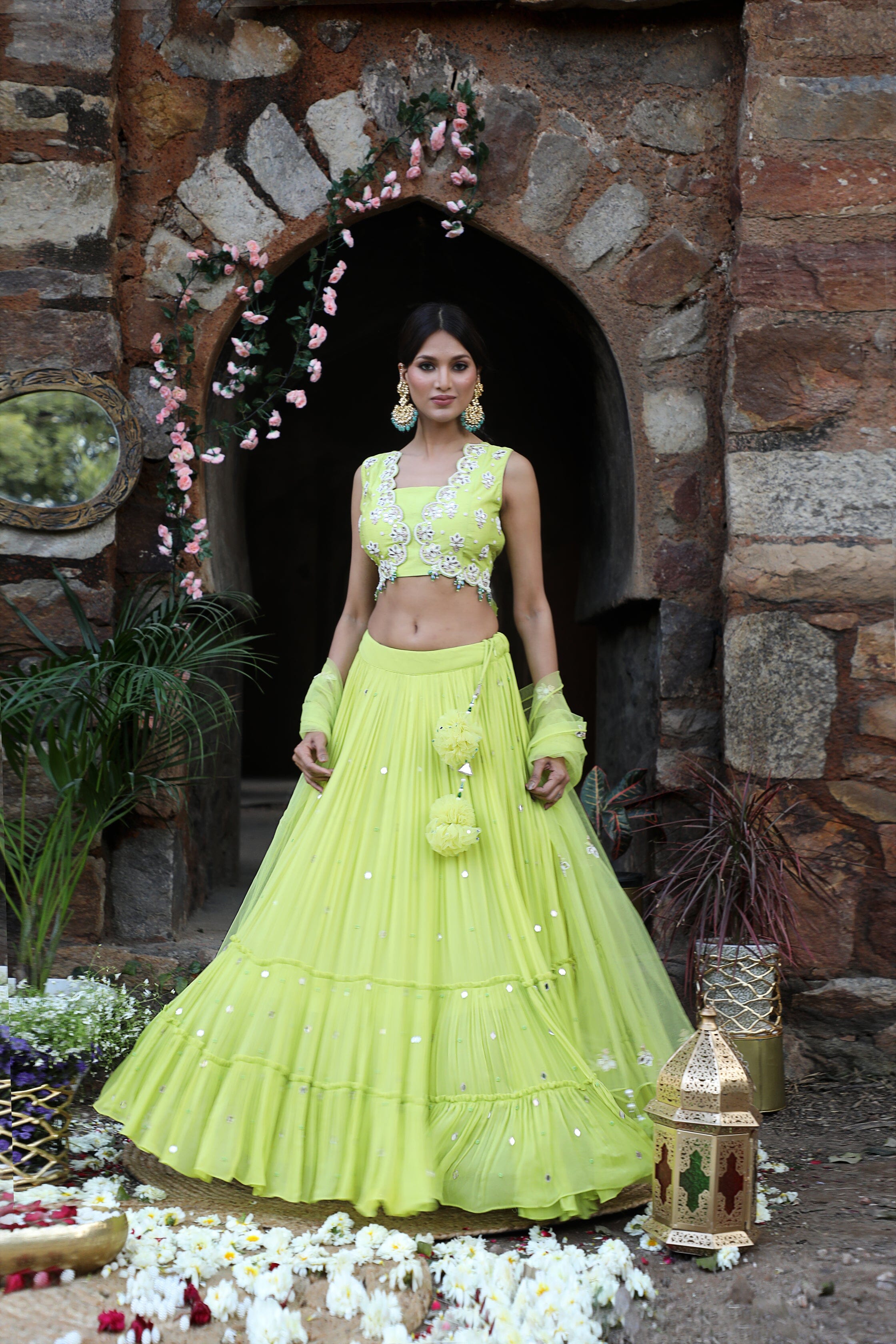 Featuring here neon green flared Lehenga Set with mirror, bead, zari work paired with net dupatta & mirror work blouse