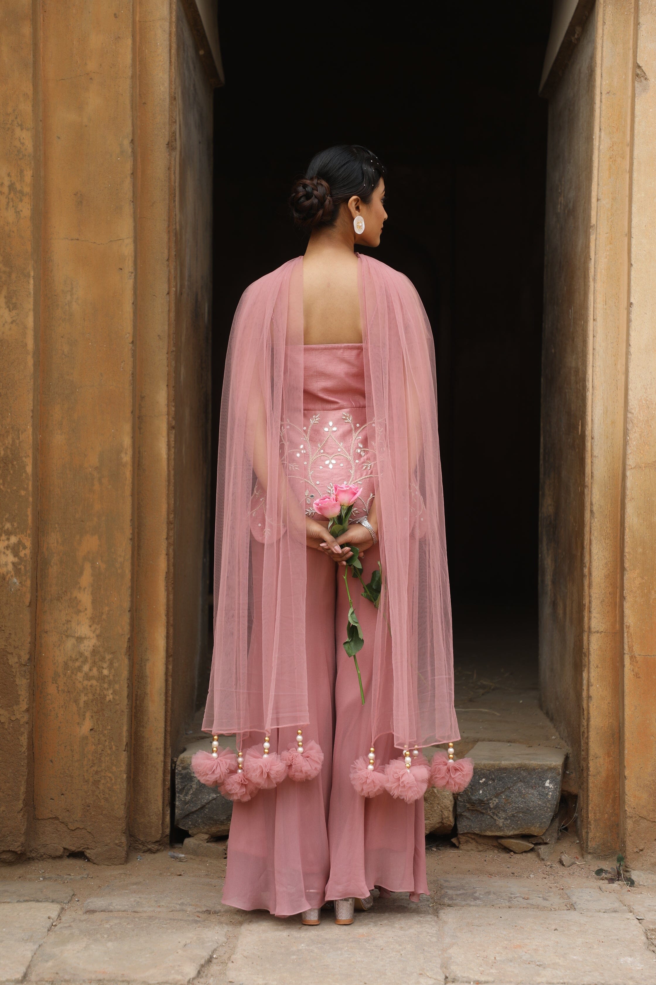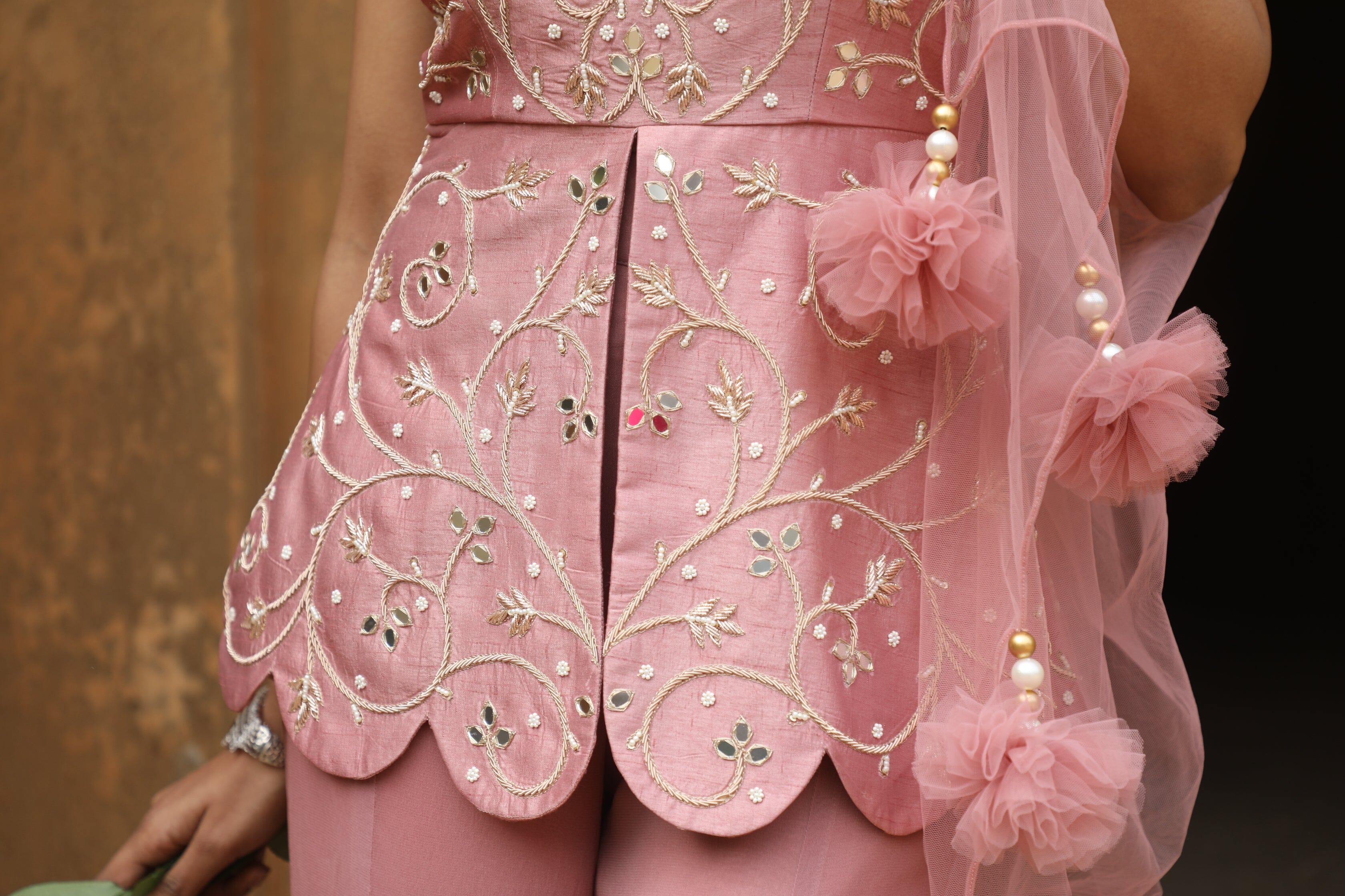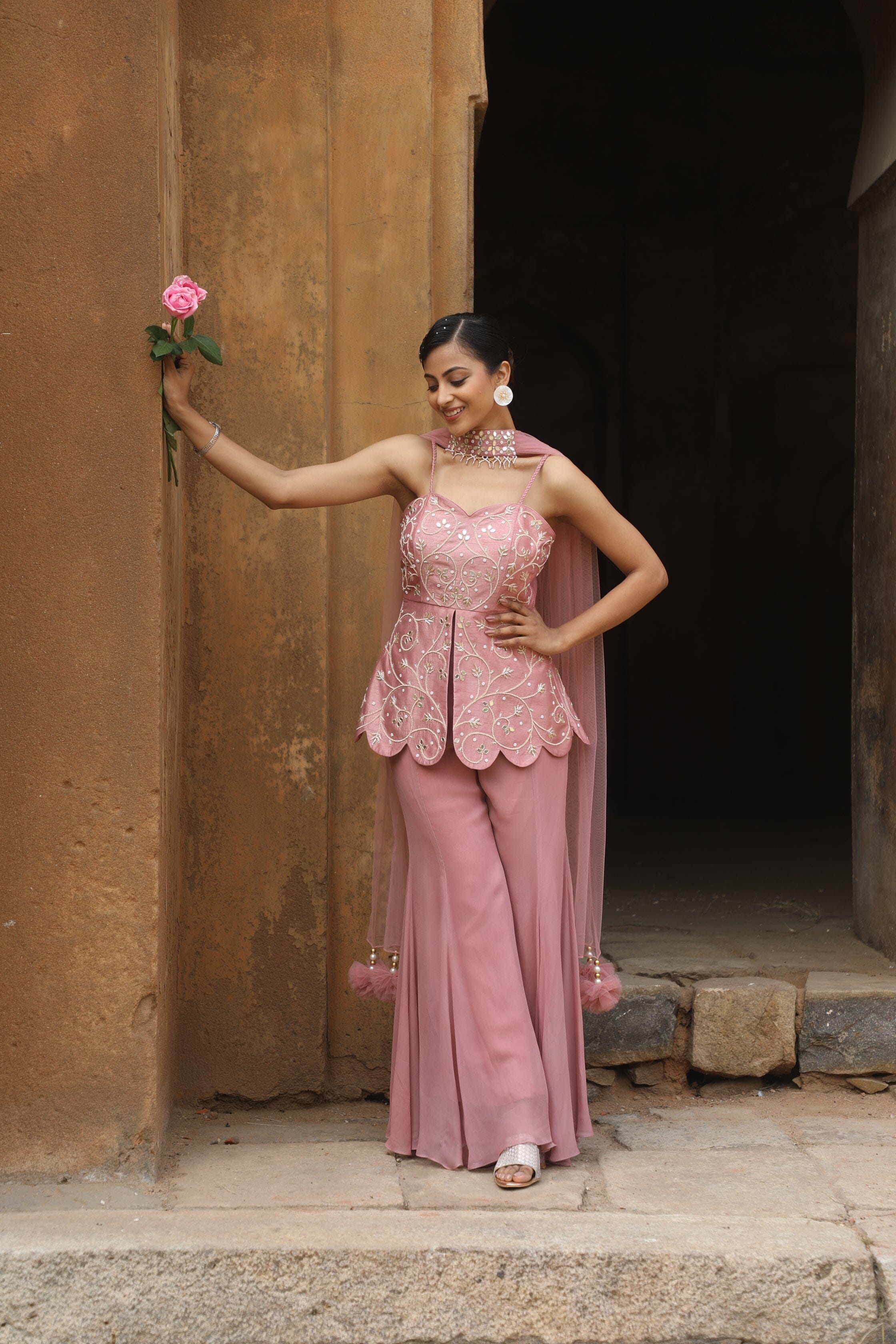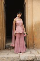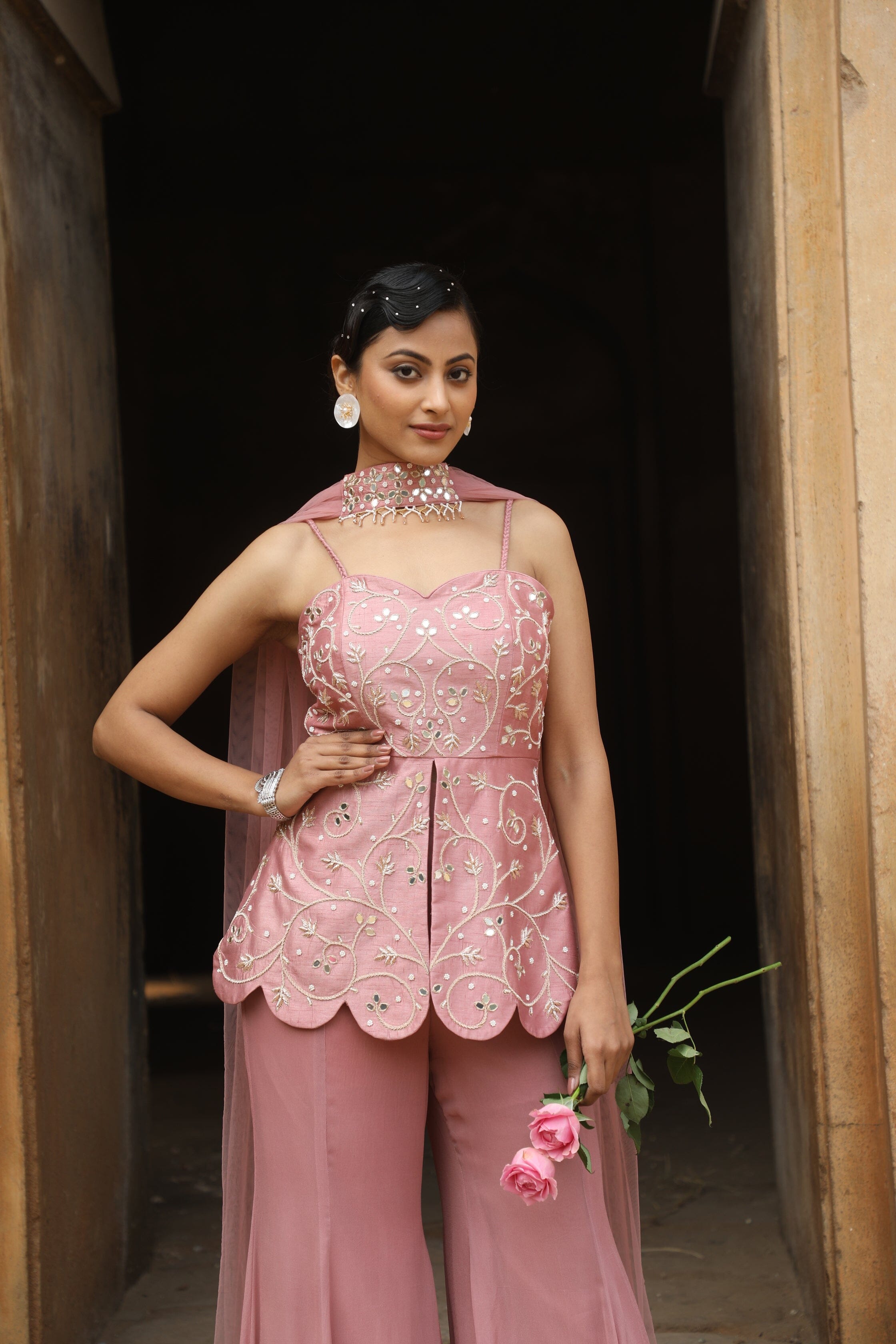 Featuring Onion Pink silk peplum with mirror, zardozi embroidered, paired with georgette inserted sharara and net choker dupatta with our signature hangings.