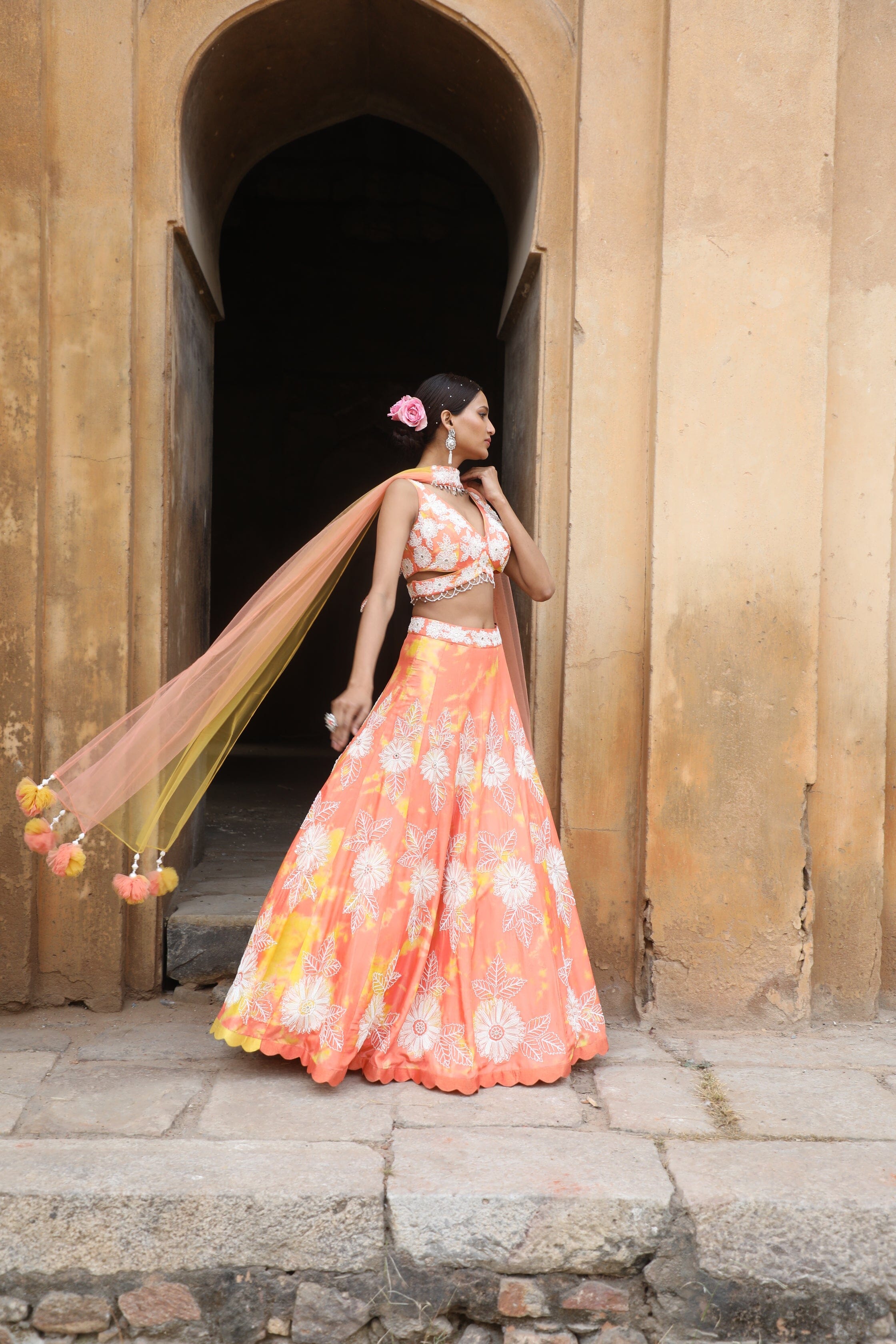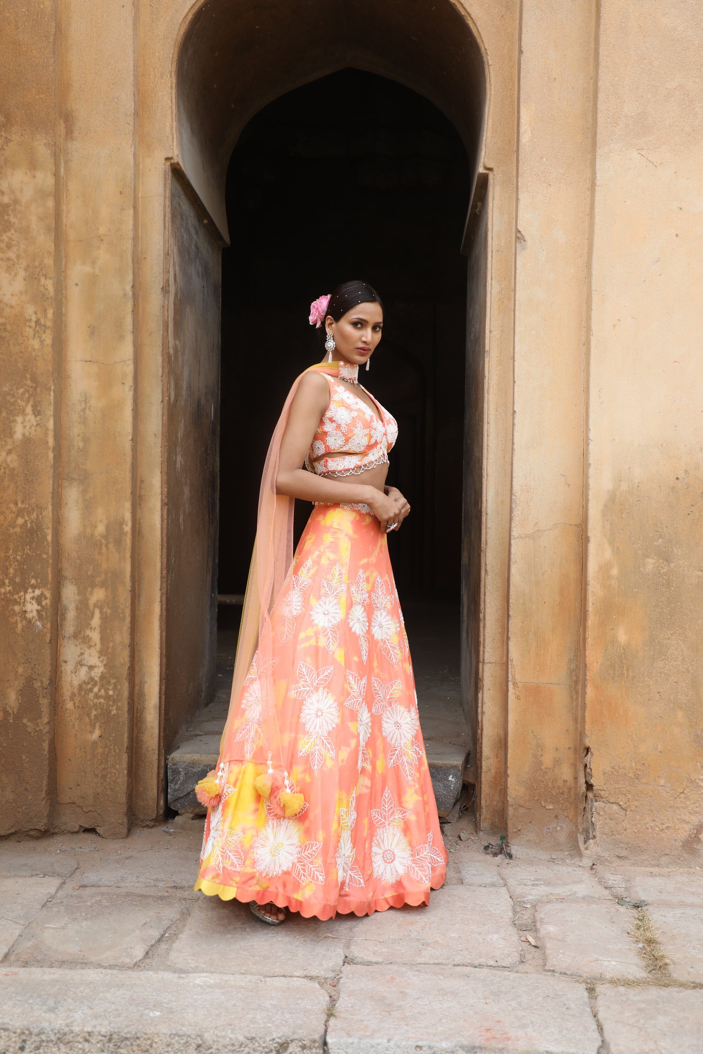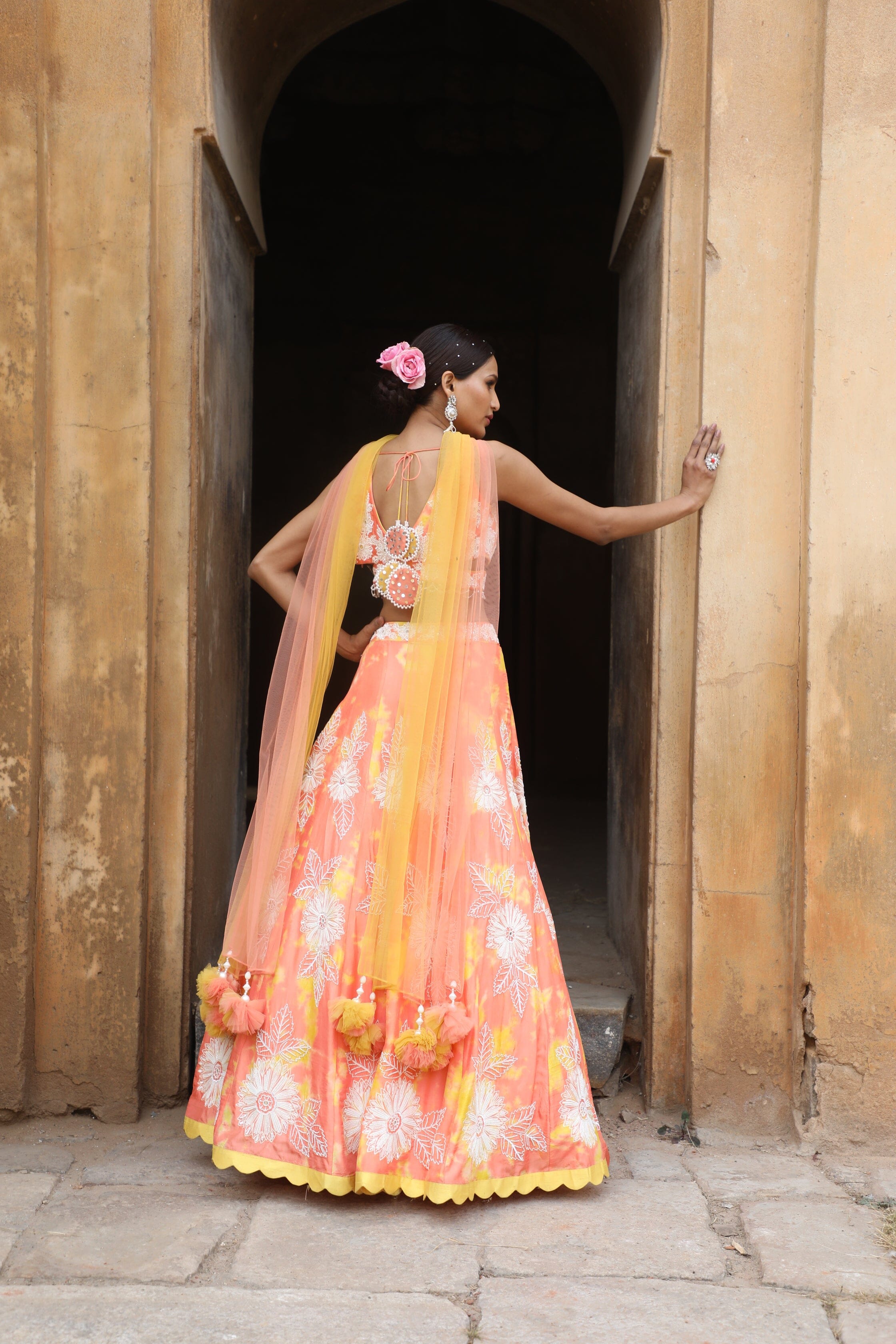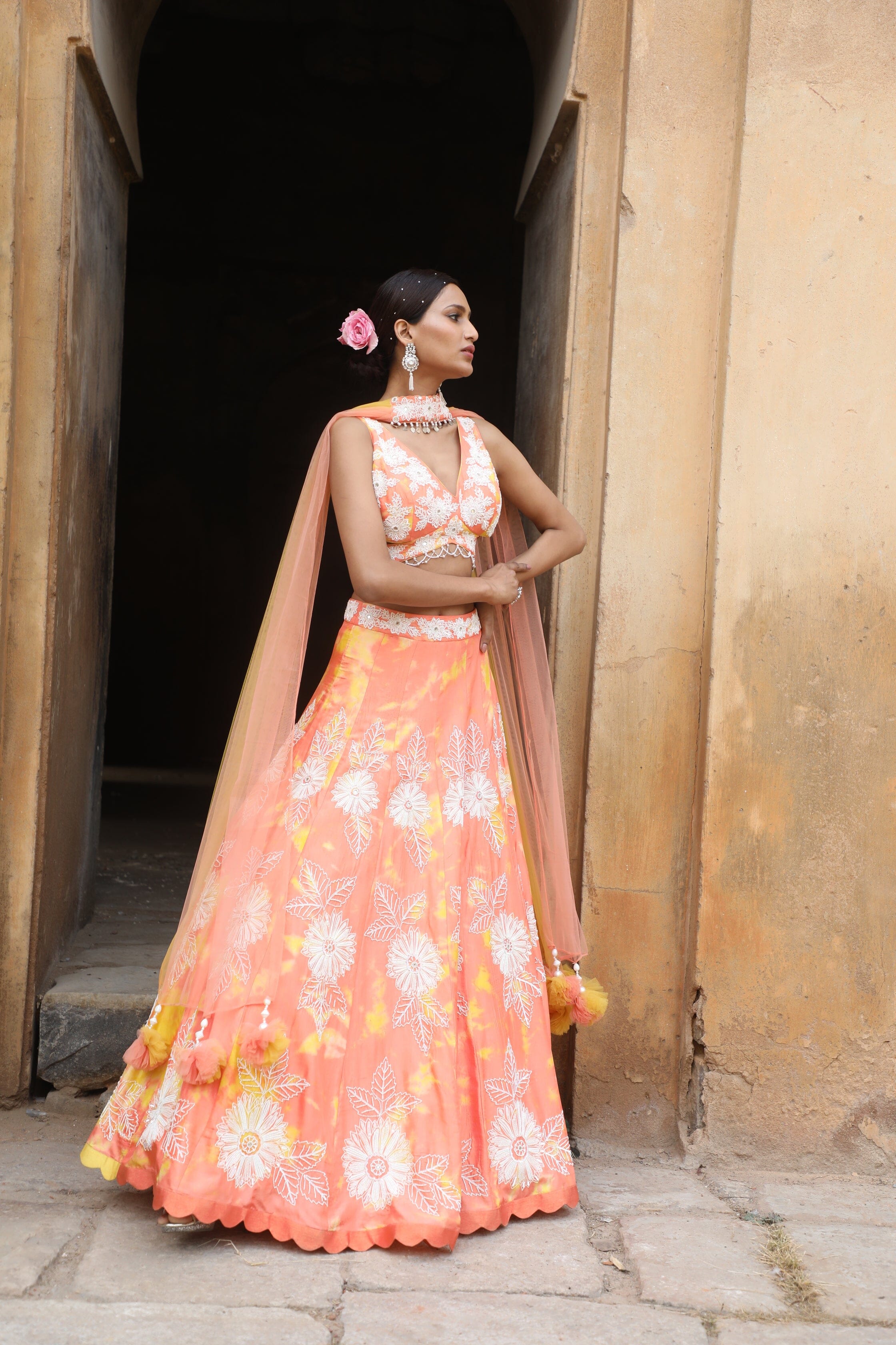 Featuring Peach yellow tie-dye silk blouse with thread, cutdana, sequence, mirror, zari, beads embroidered paired with silk detailed lehenga with choker dupatta.