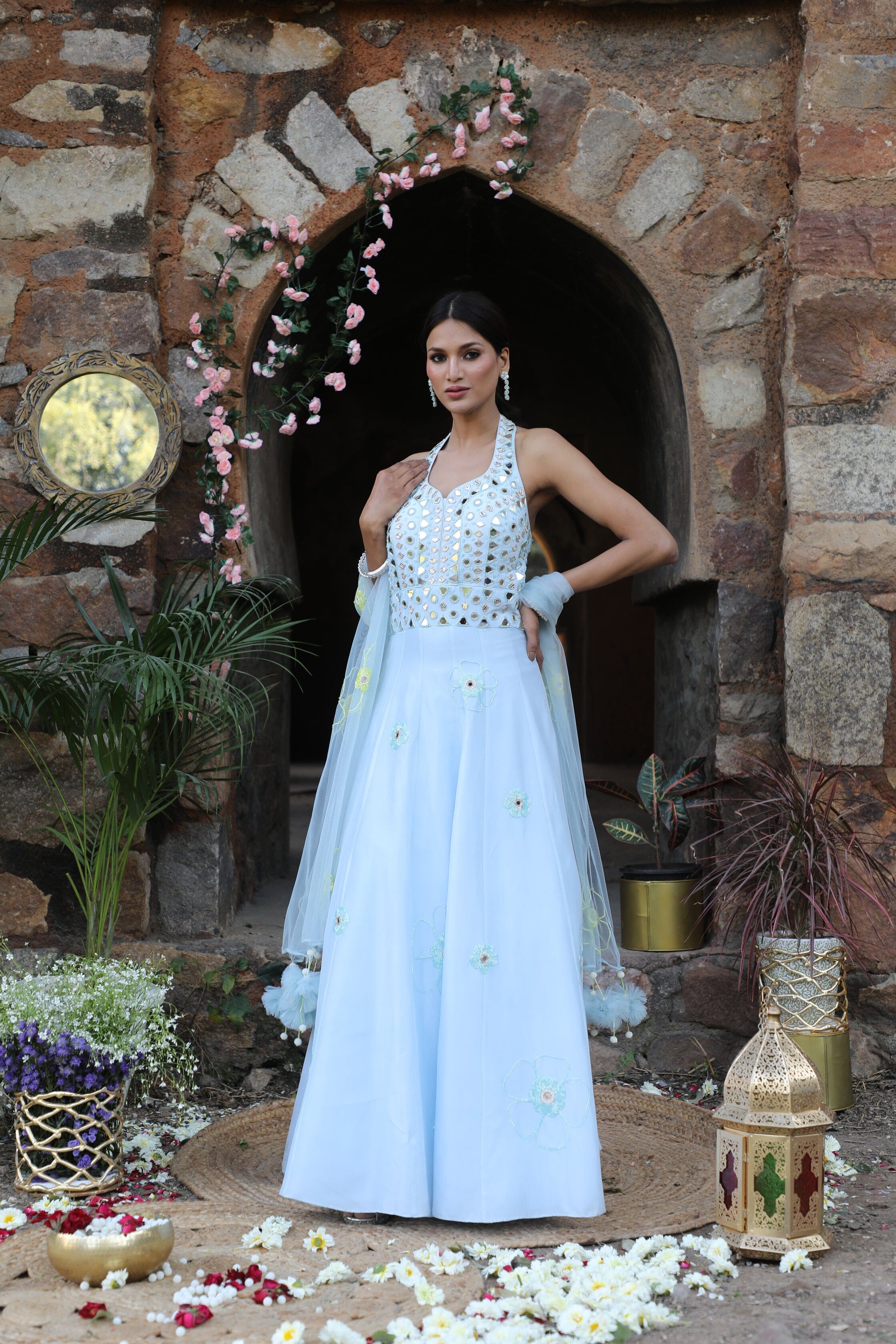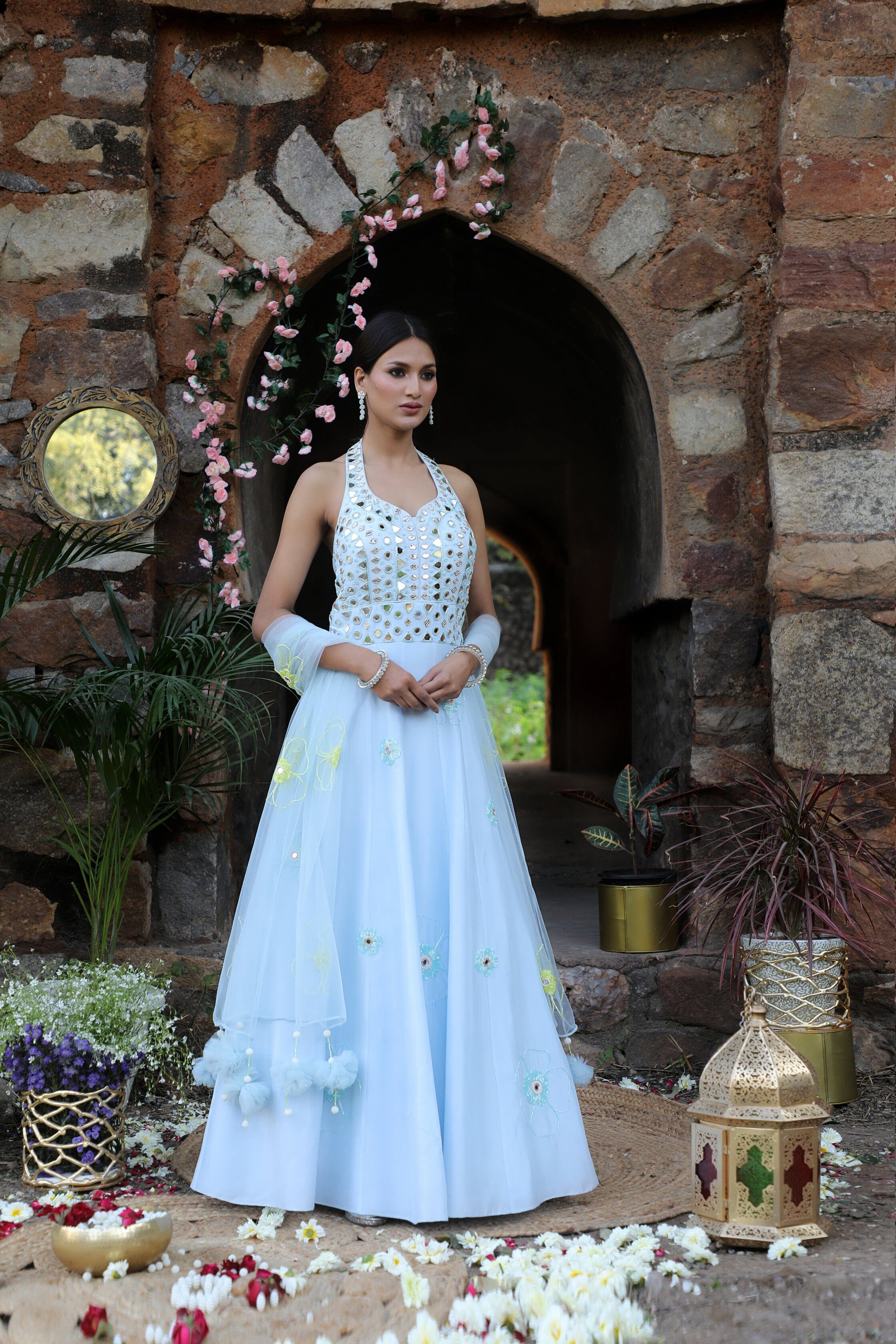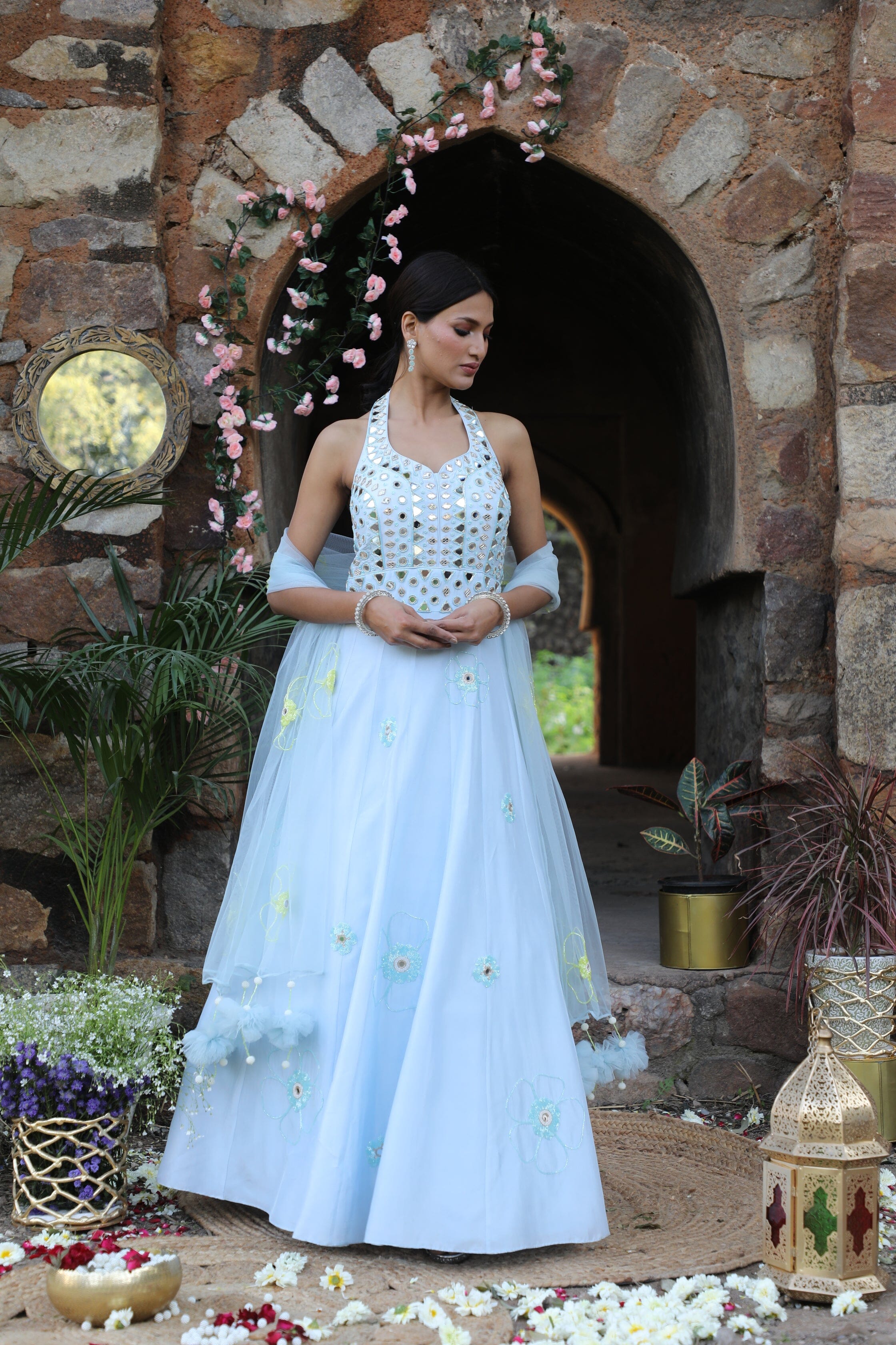 Featuring here powder blue halter neck anarkali Set with mirror, bead,cutdana zari work paired with net dupatta.