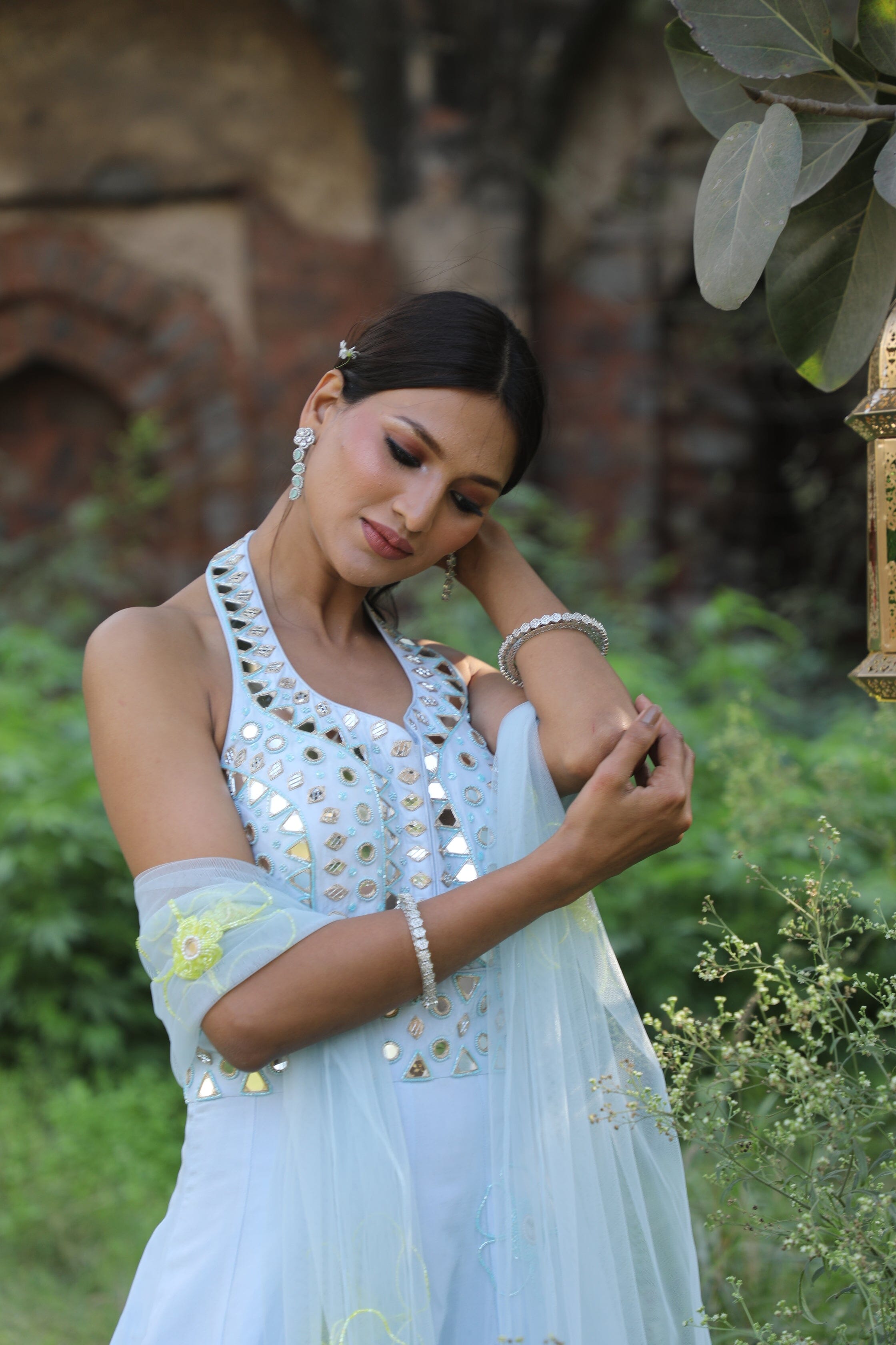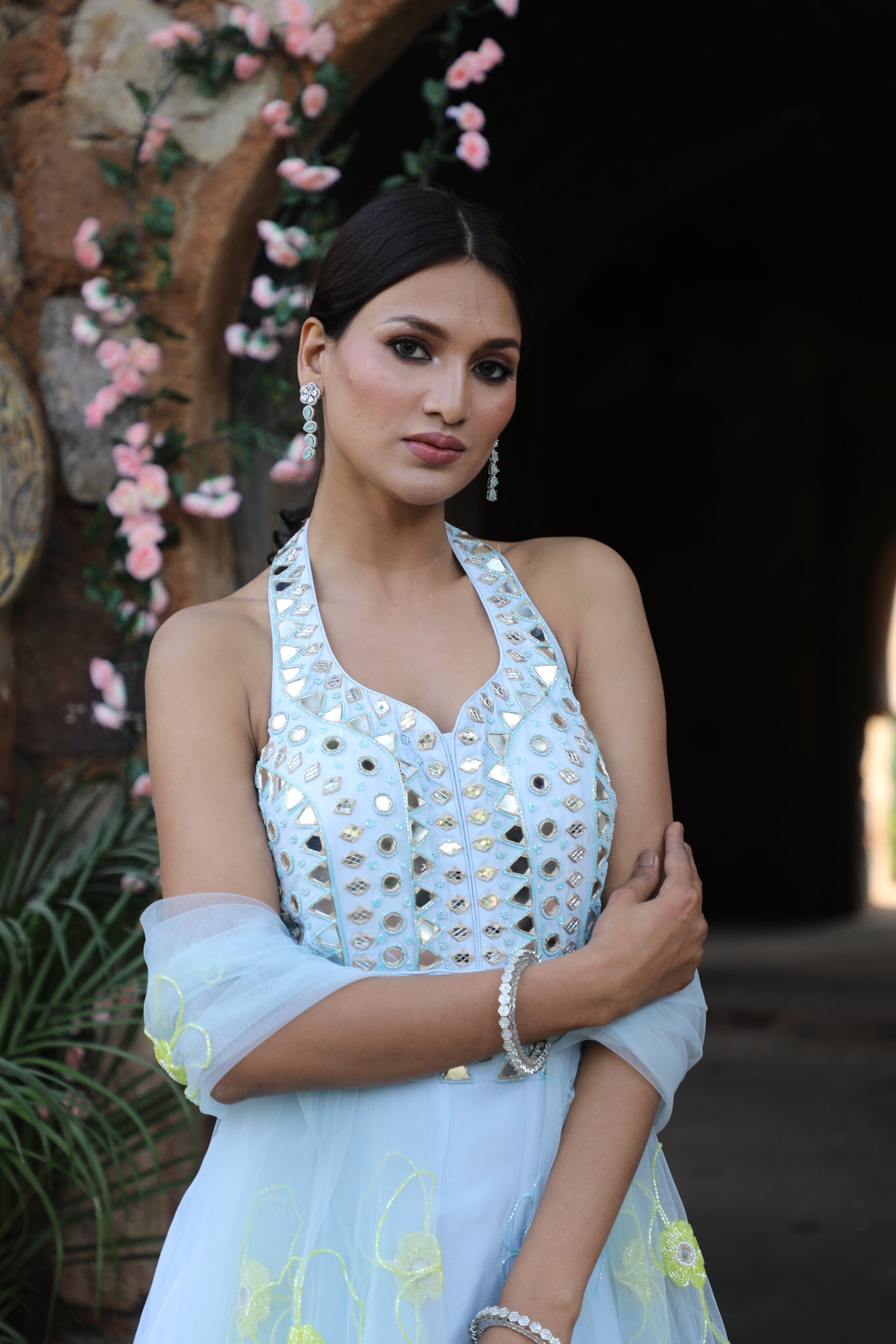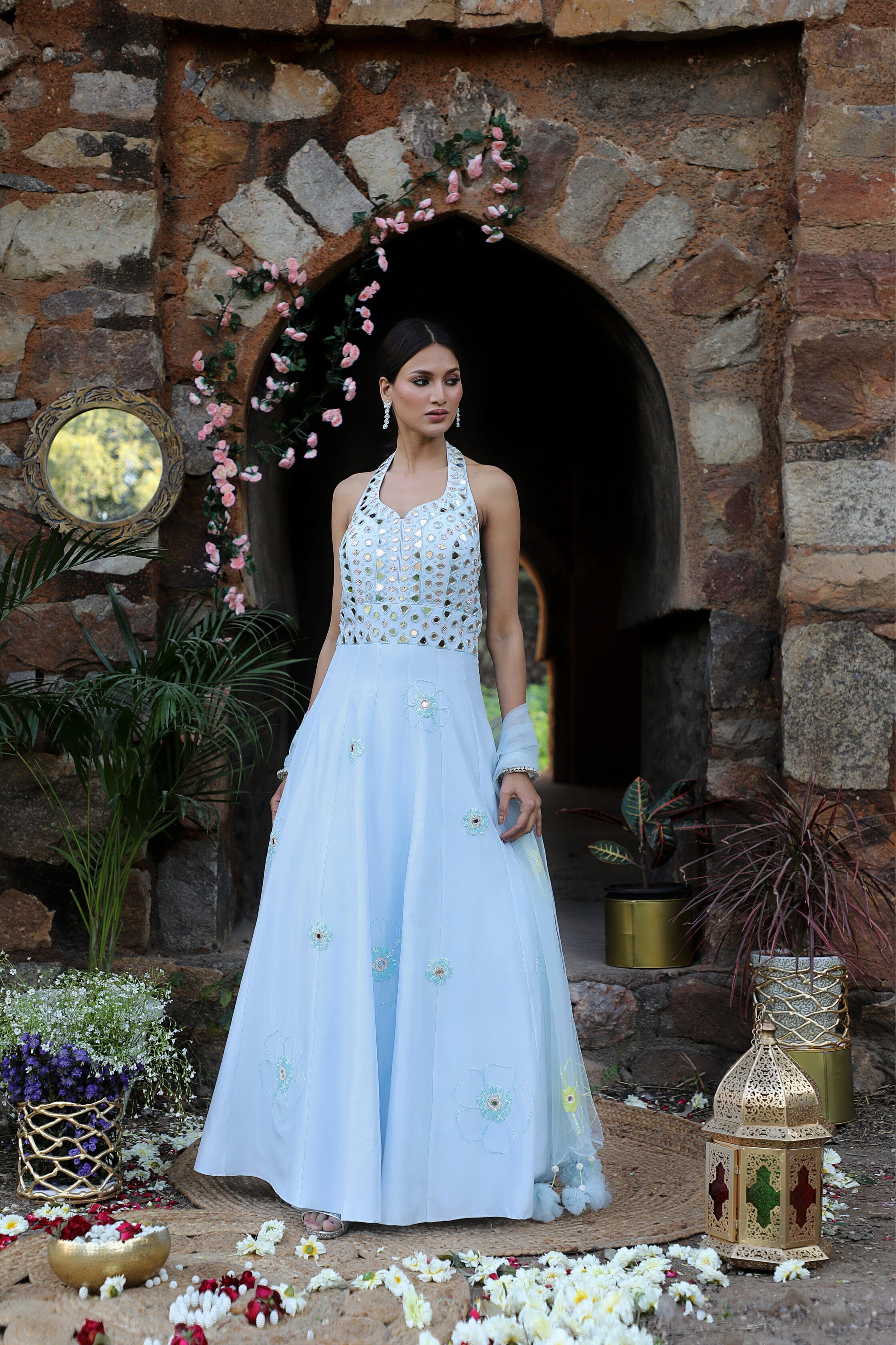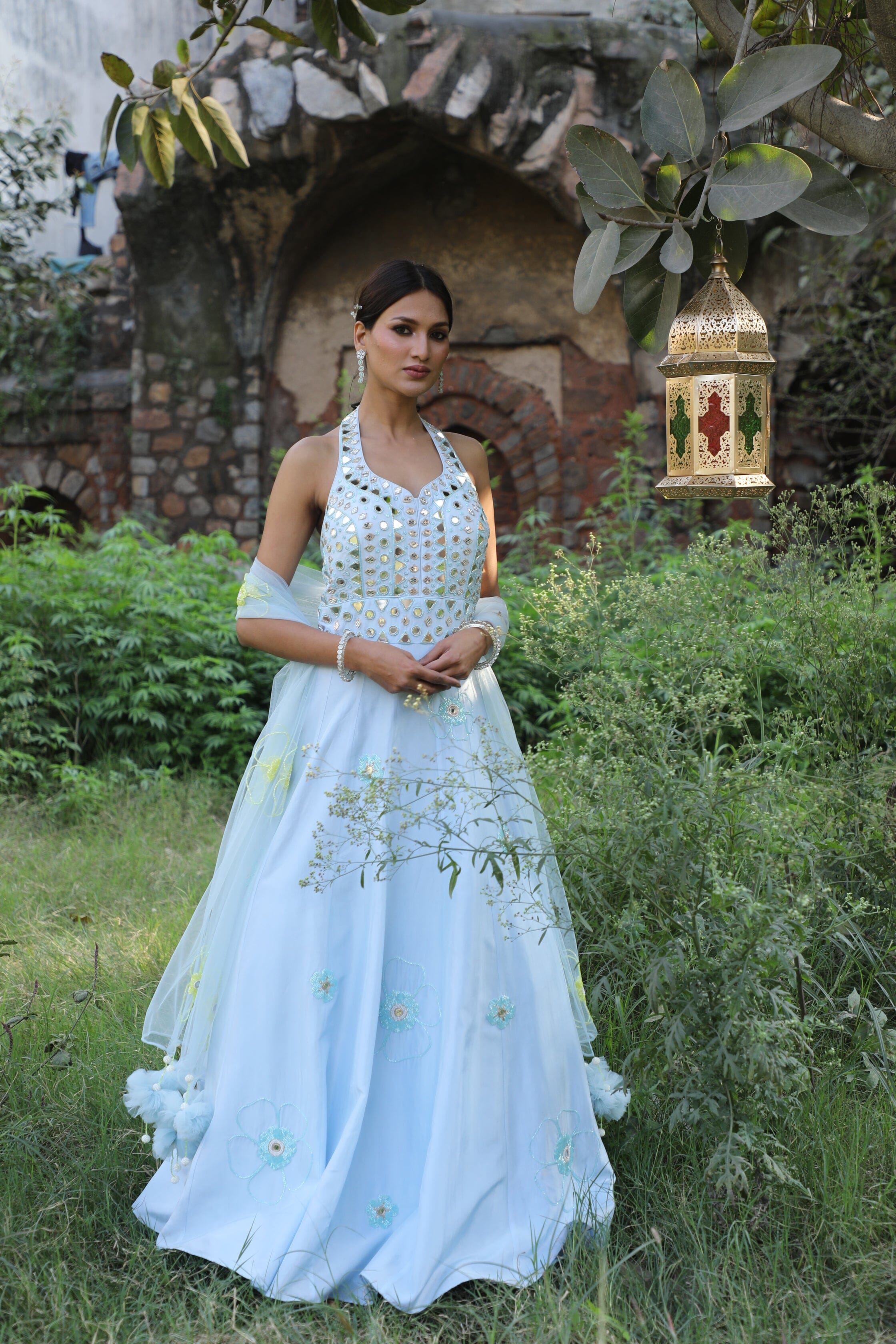 Featuring here powder blue halter neck anarkali Set with mirror, bead,cutdana zari work paired with net dupatta.