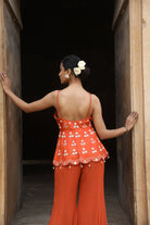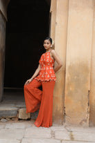 Featuring Rust silk peplum with nakshi, mirror, zari, beads embroidered on bodice, paired with georgette inserted sharara.