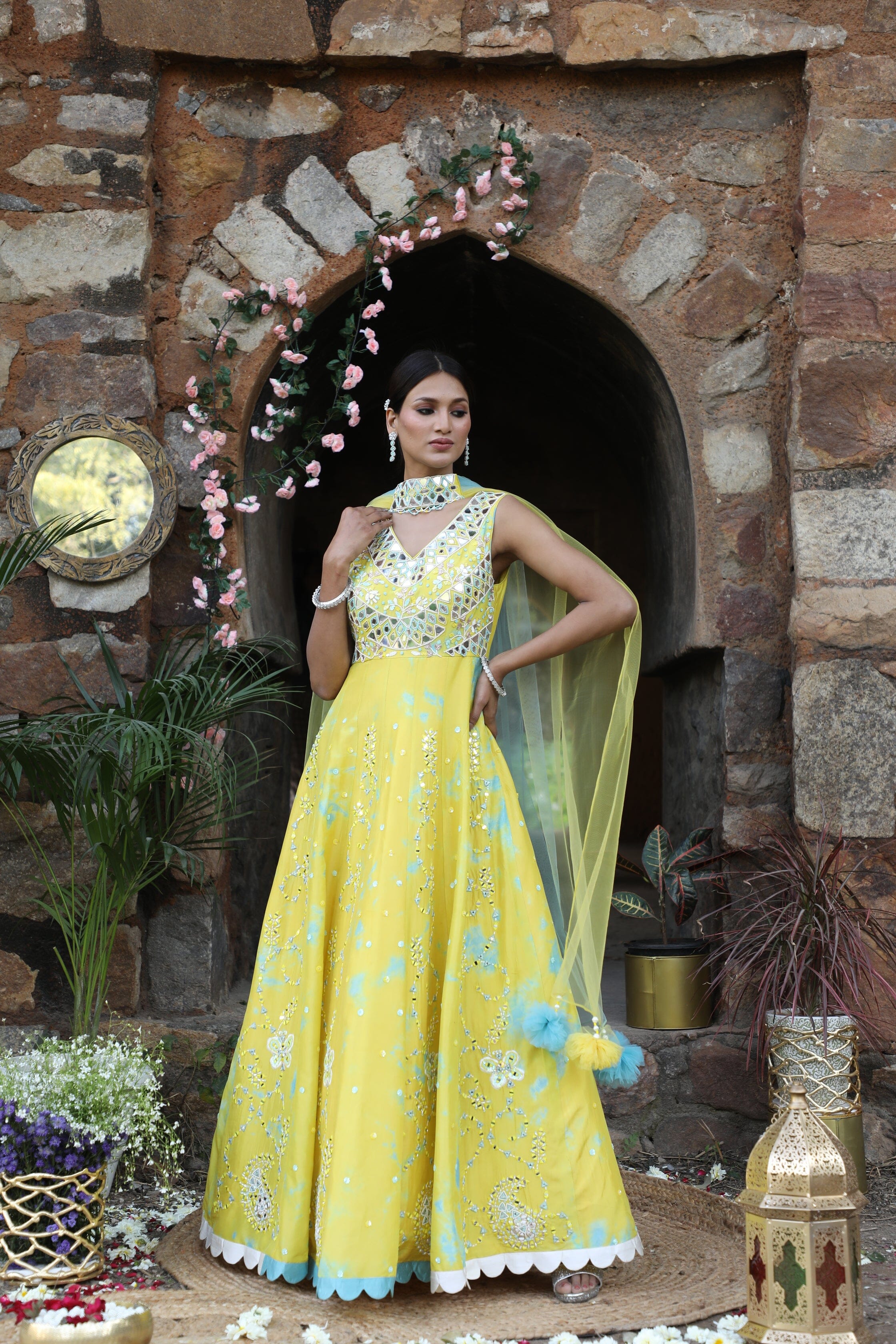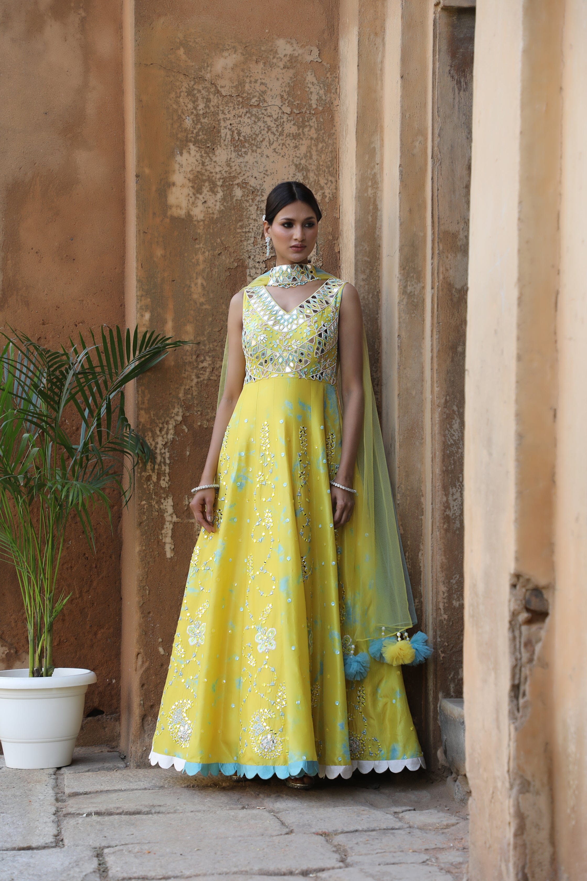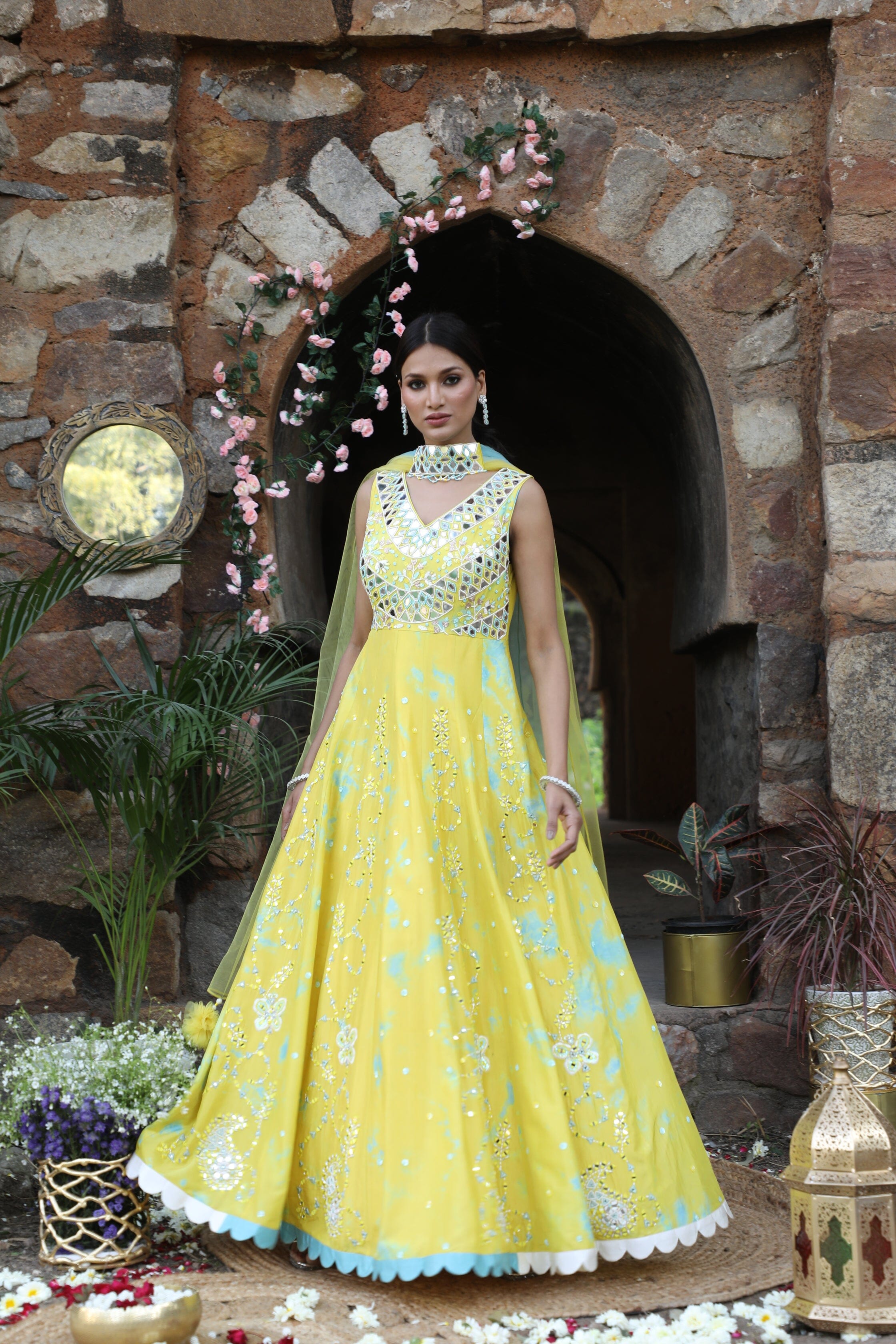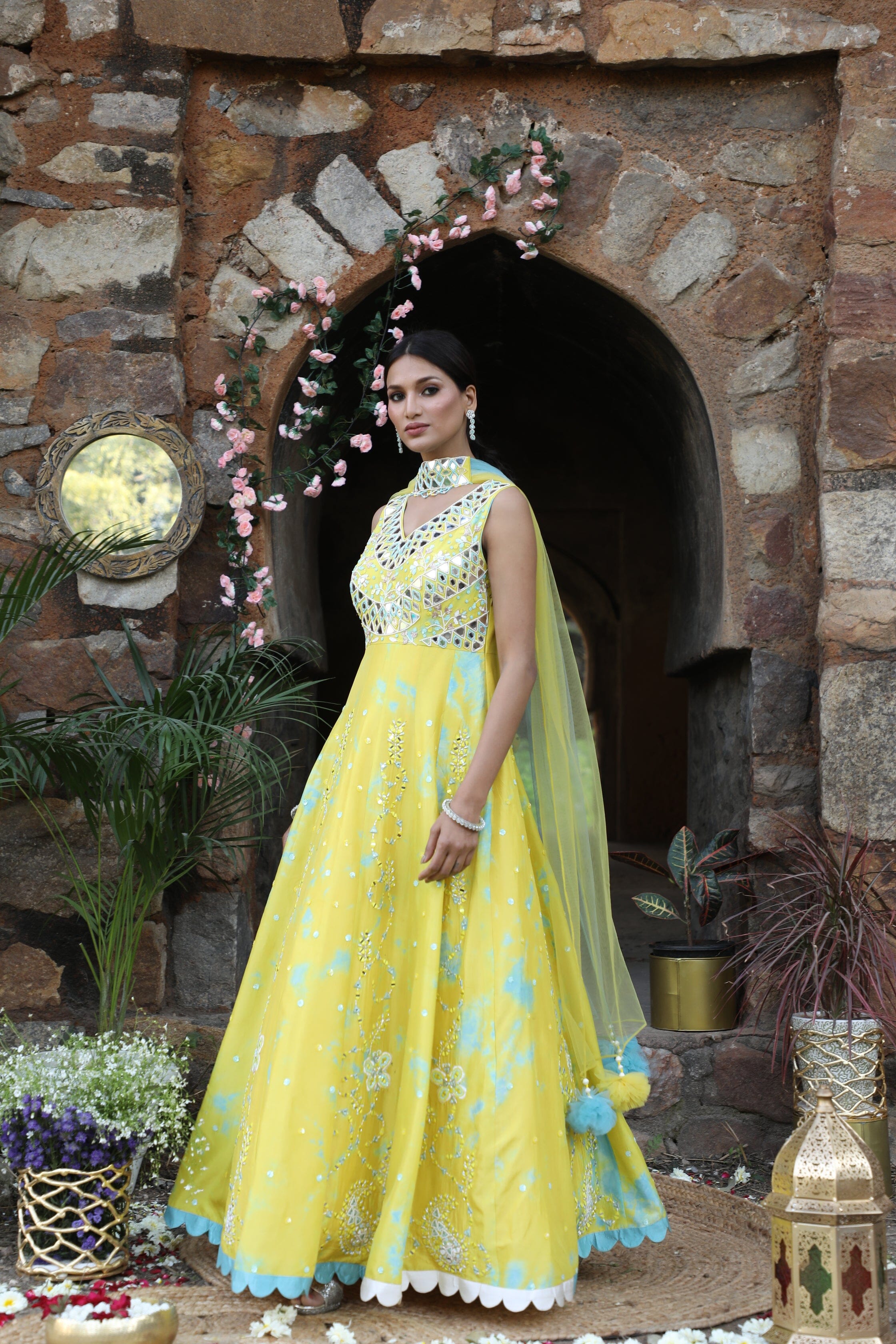 Featuring here Yellow, blue tie dye anarkali Set with mirror, bead,cutdana zari work paired with net choker dupatta.