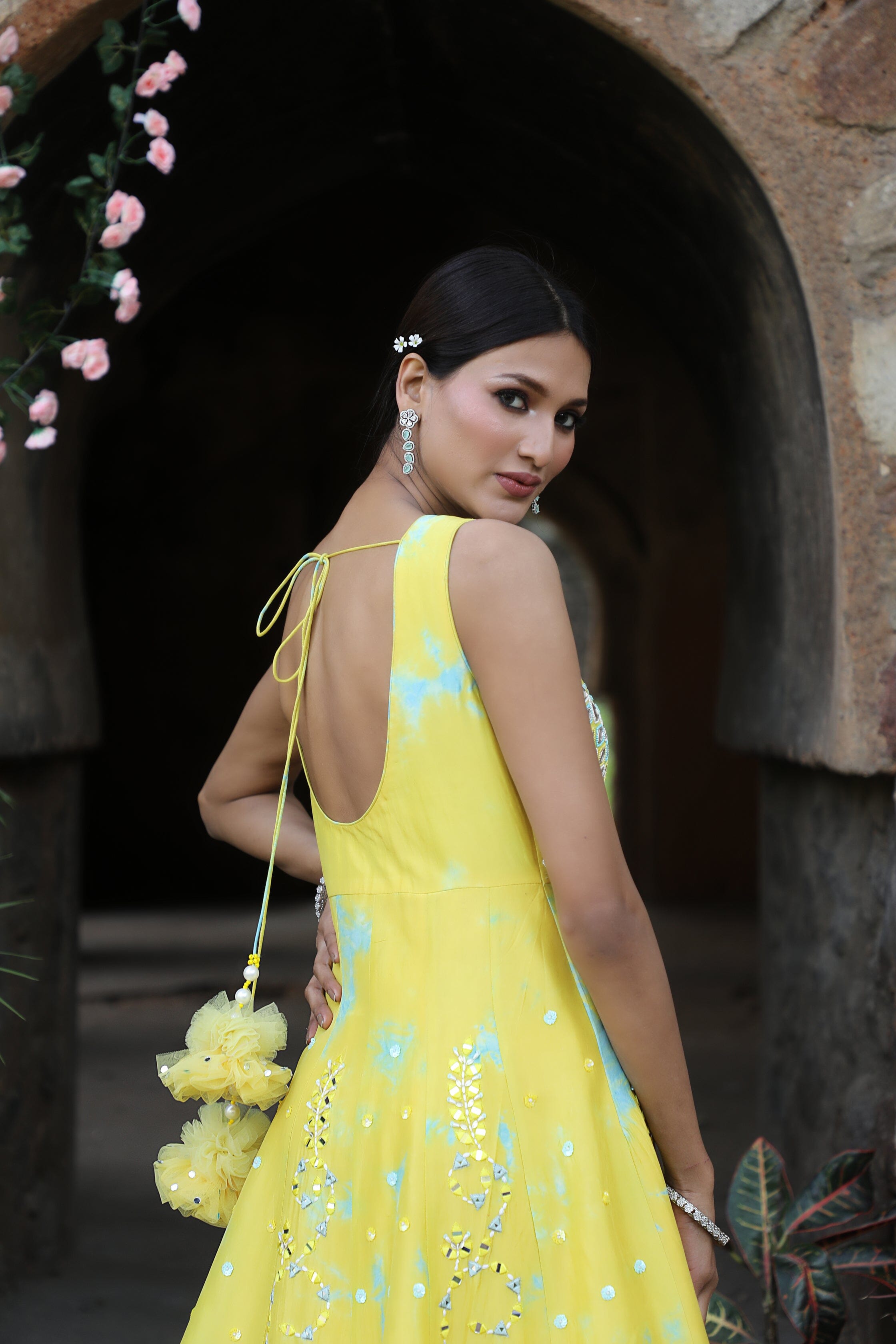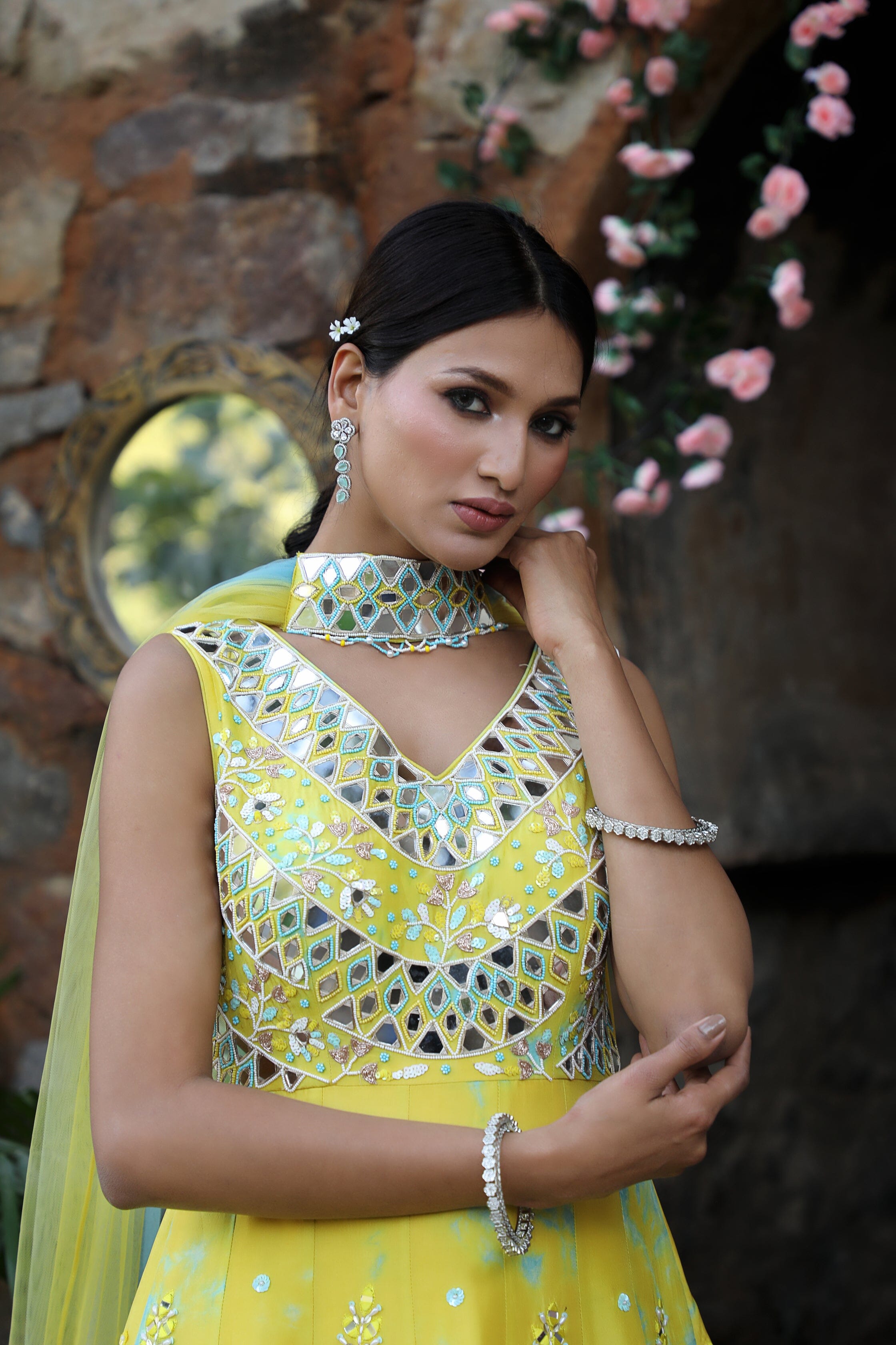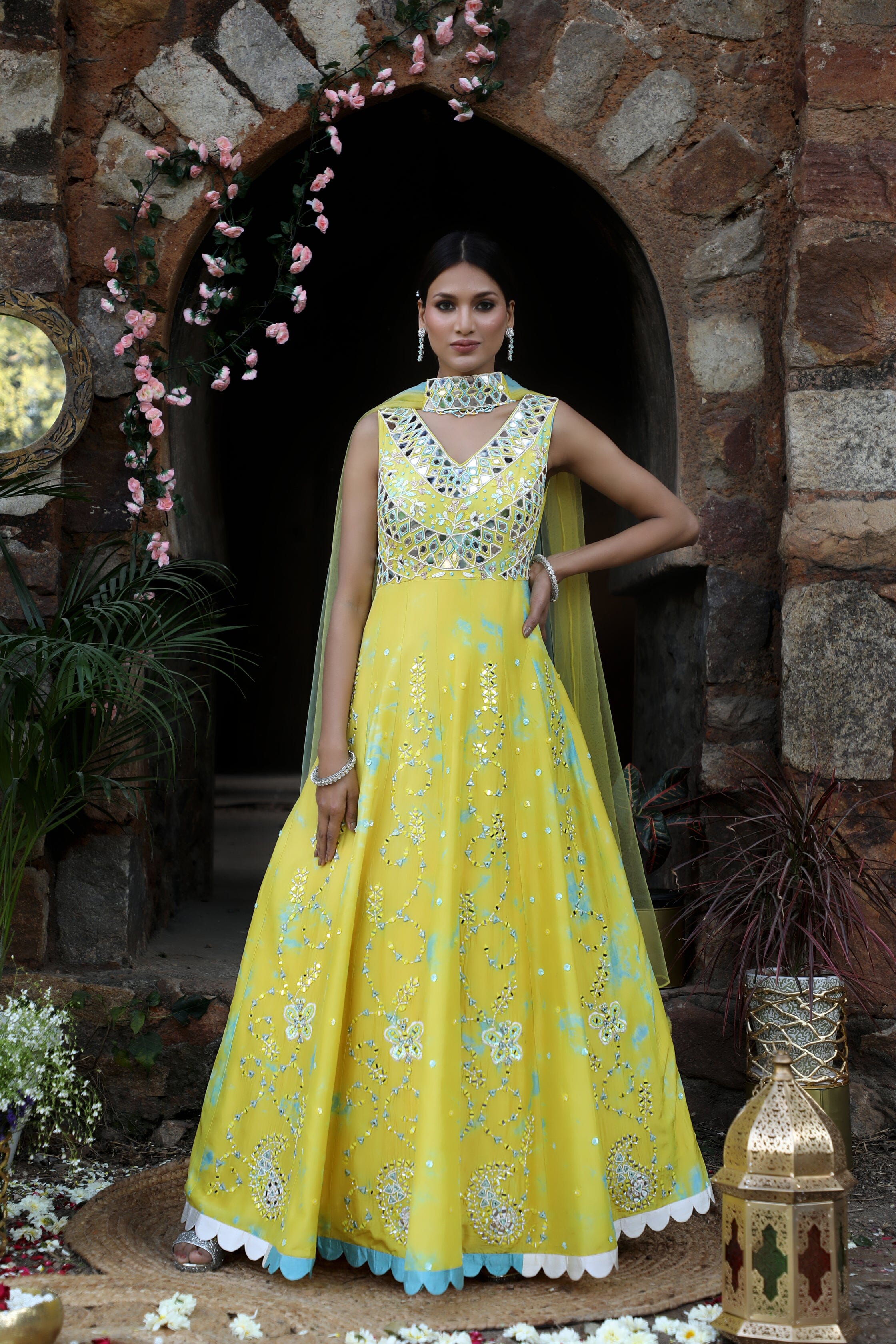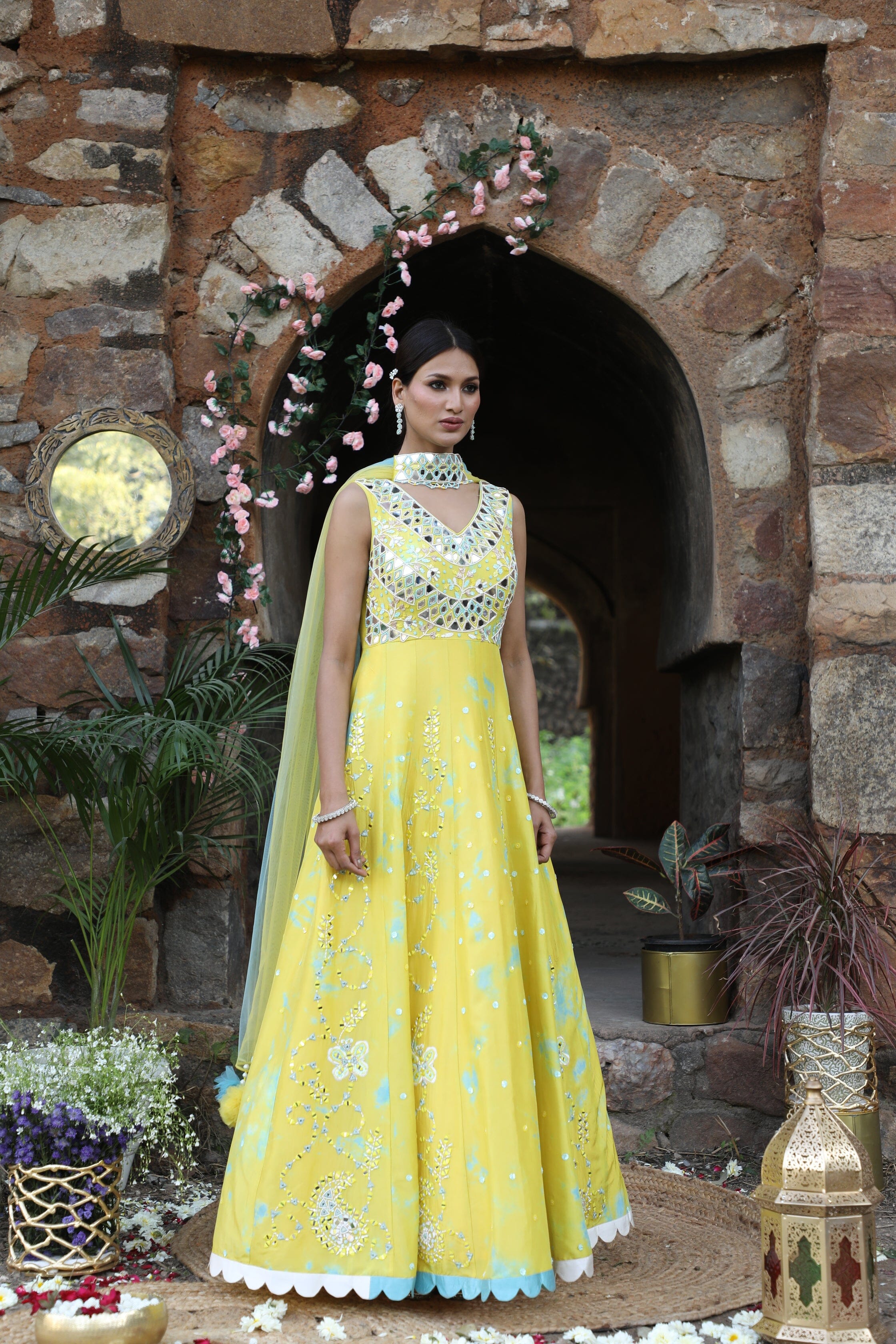 Featuring here Yellow, blue tie dye anarkali Set with mirror, bead,cutdana zari work paired with net choker dupatta.