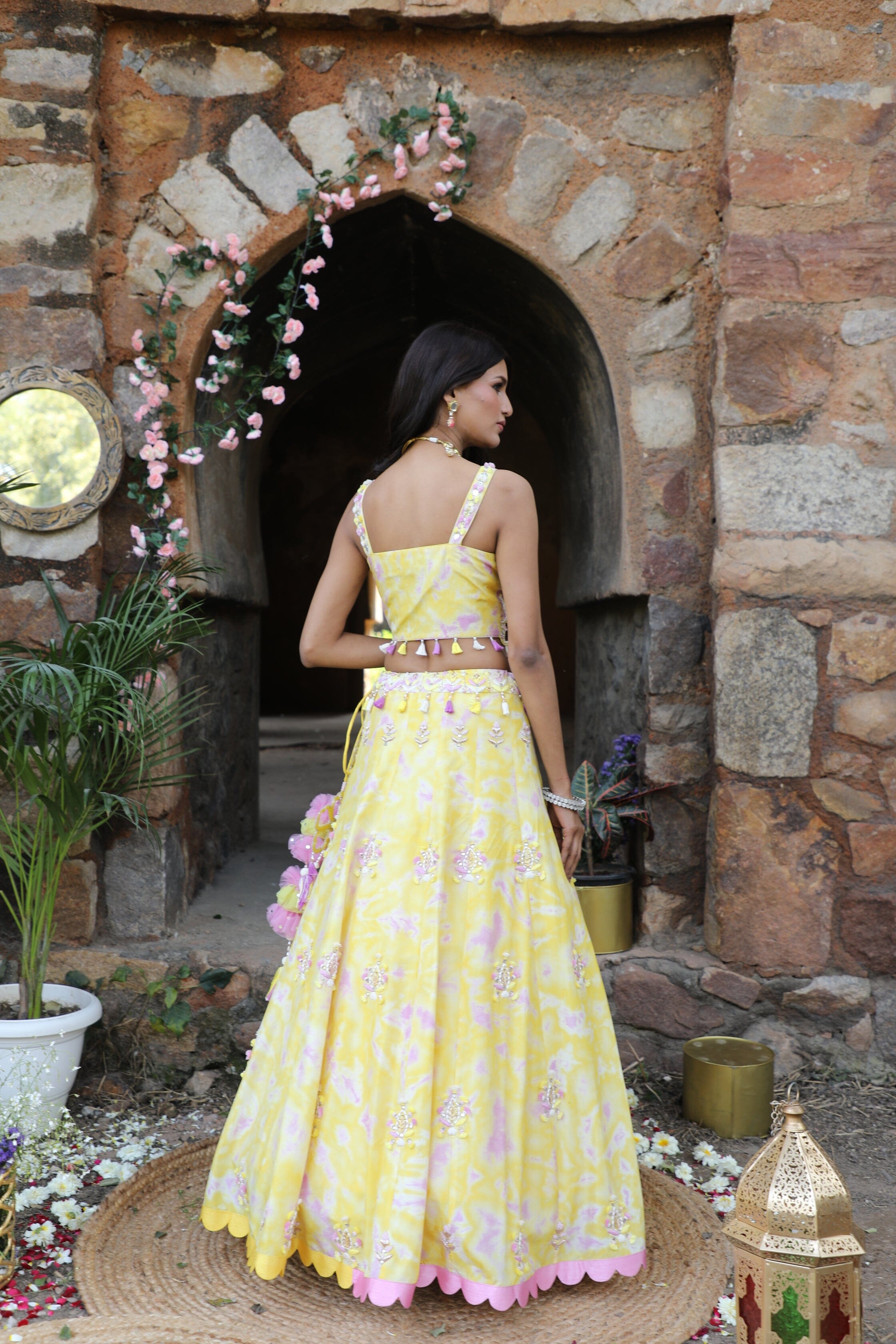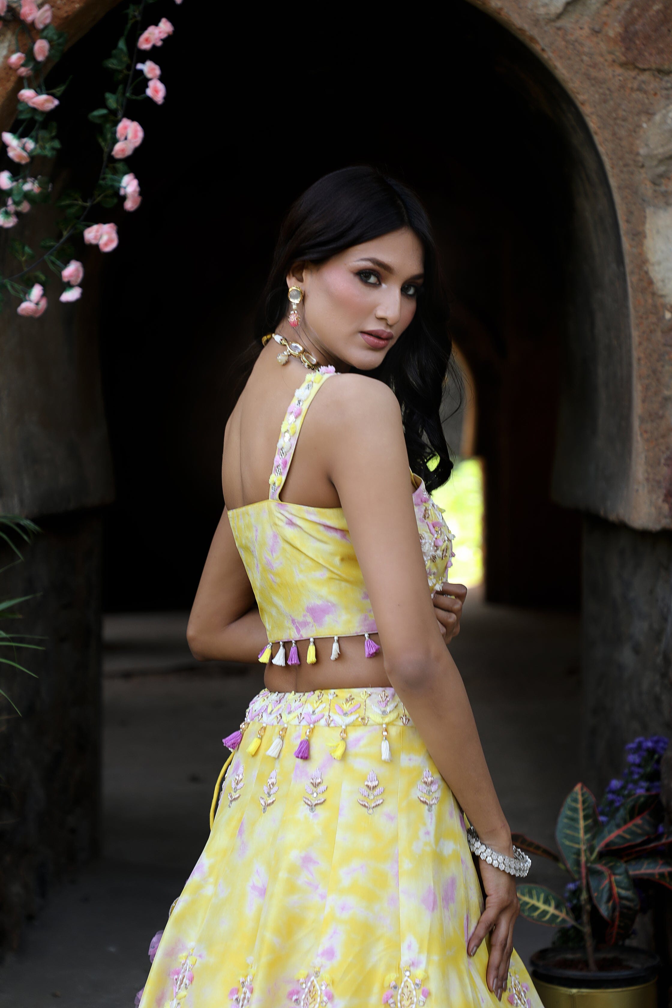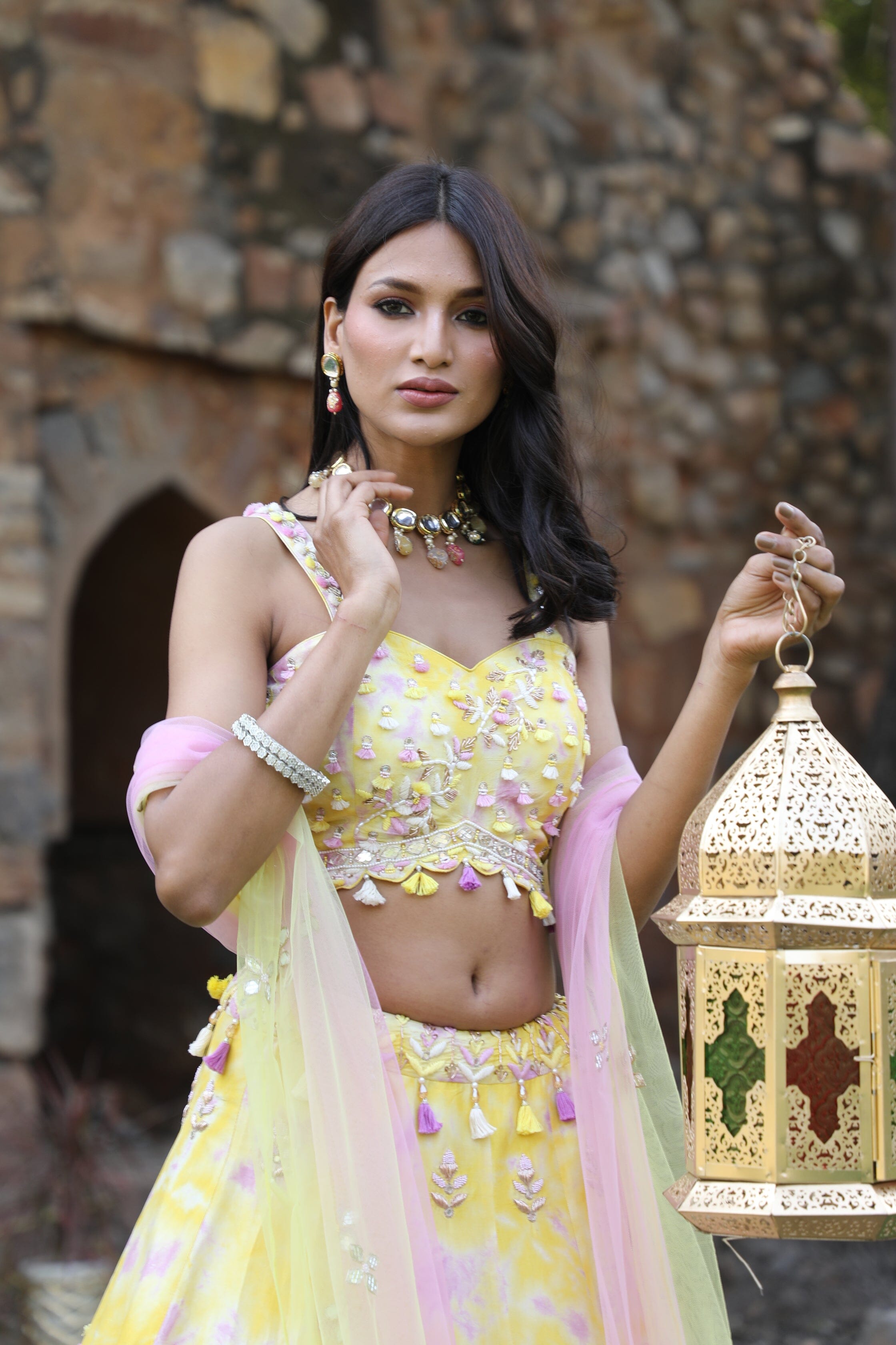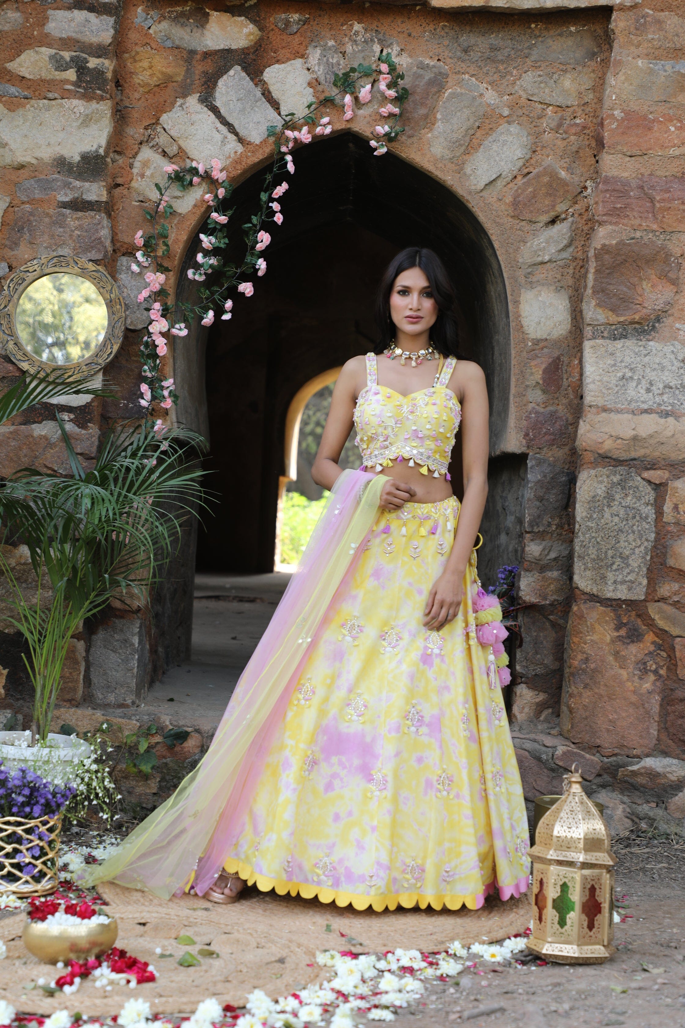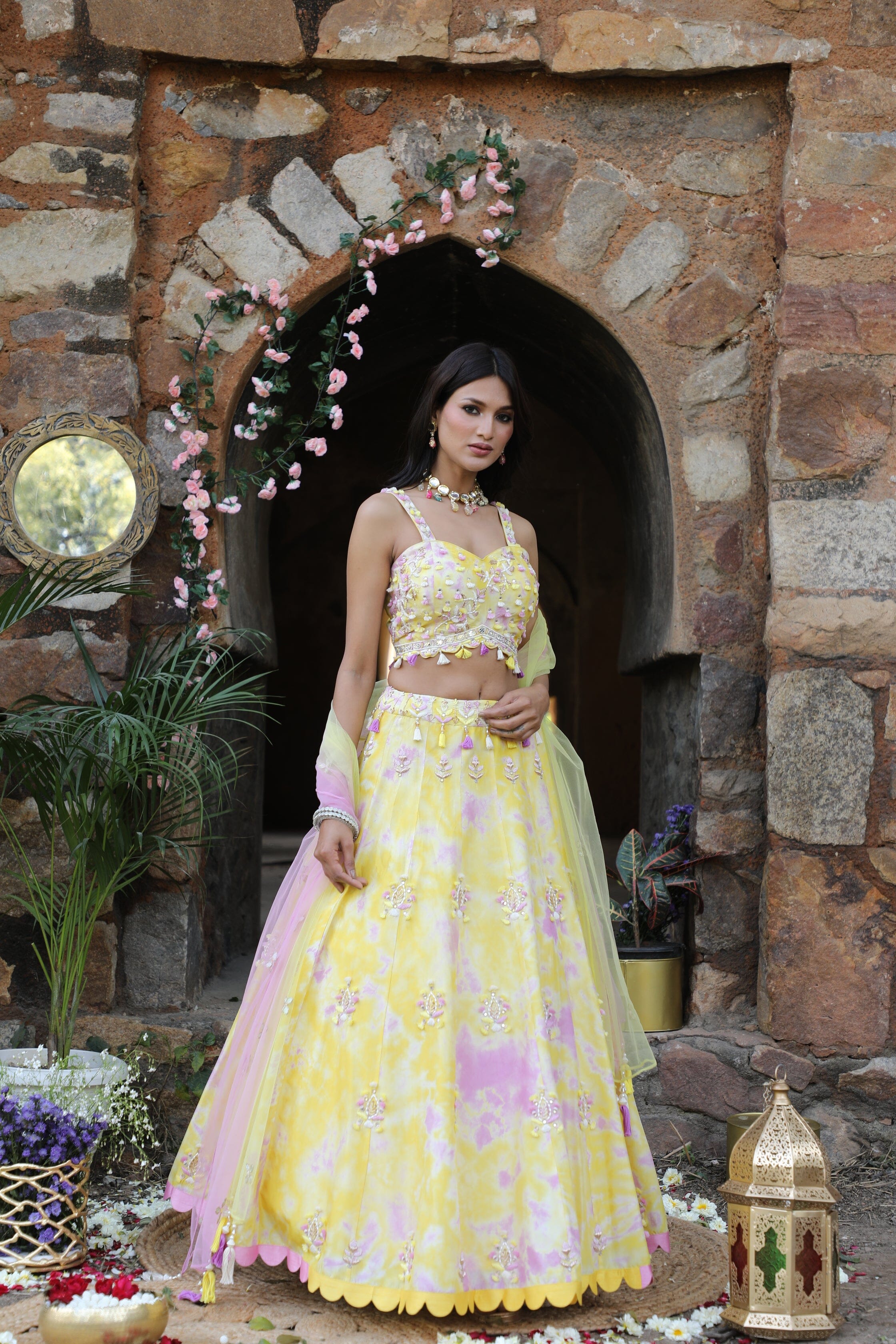 Featuring here Yellow and lilac tie-dye Lehenga Set with mirror,thread , bead , nakshi, zari work , paired with net dupatta & mirror work blouse