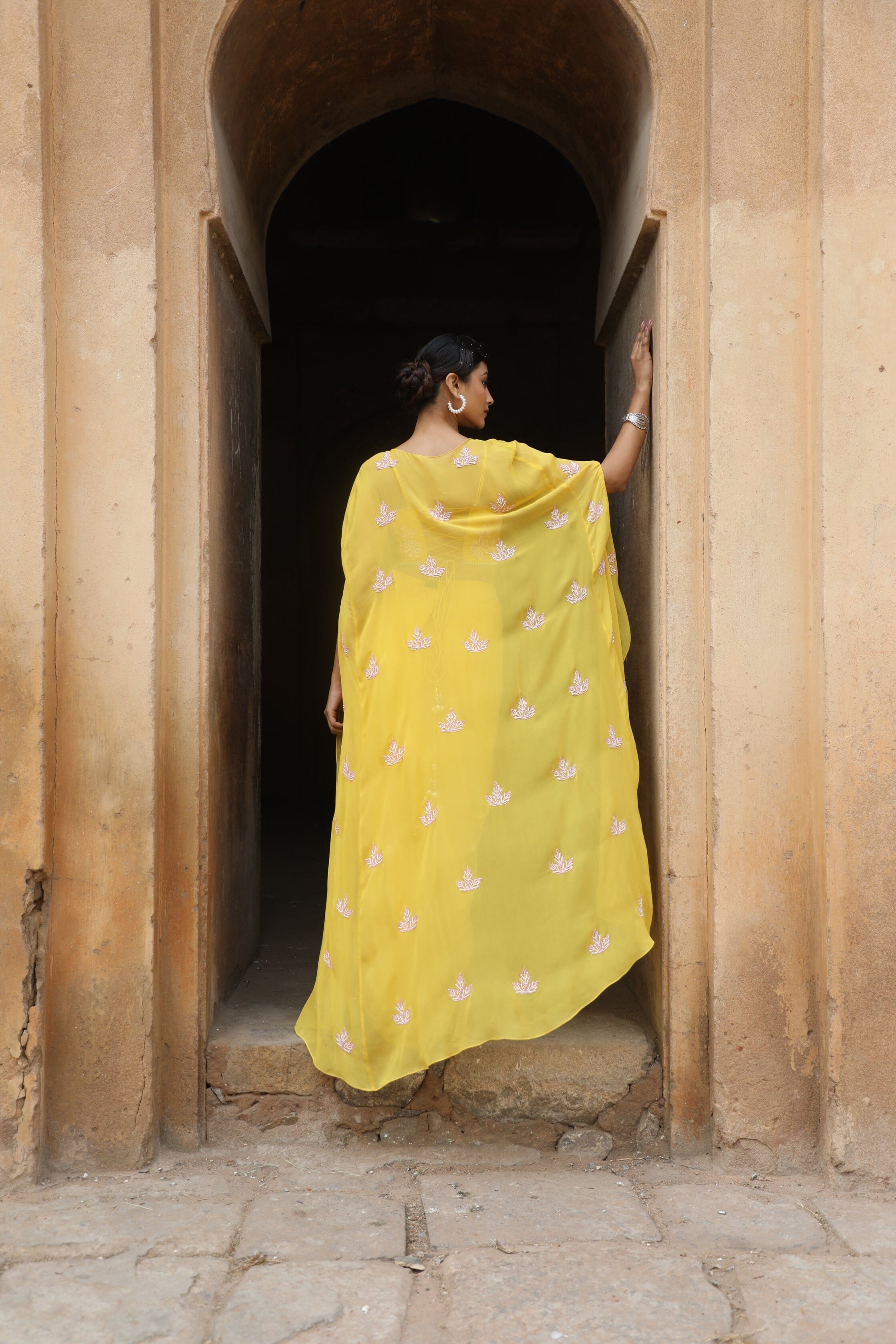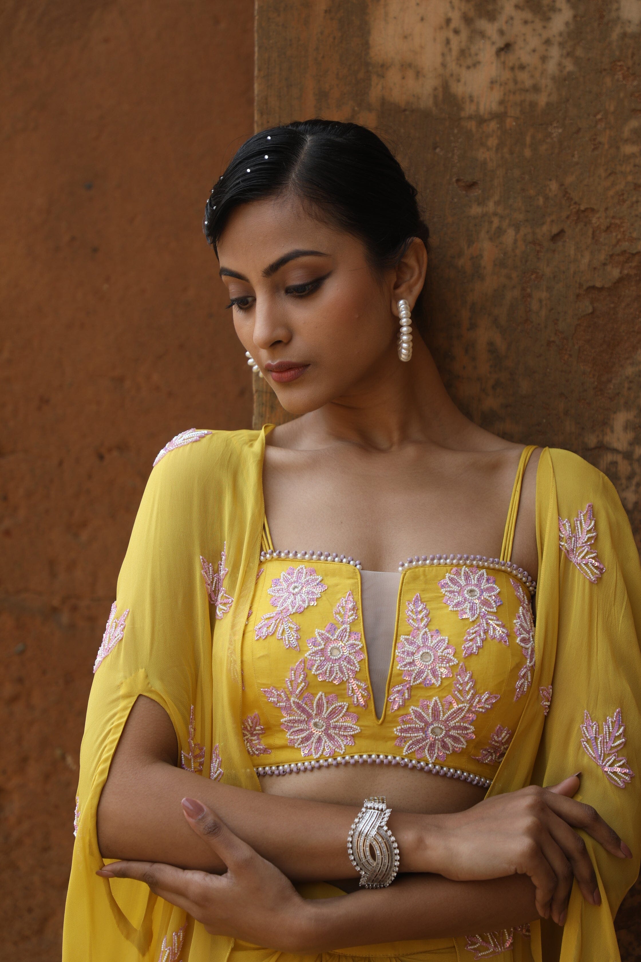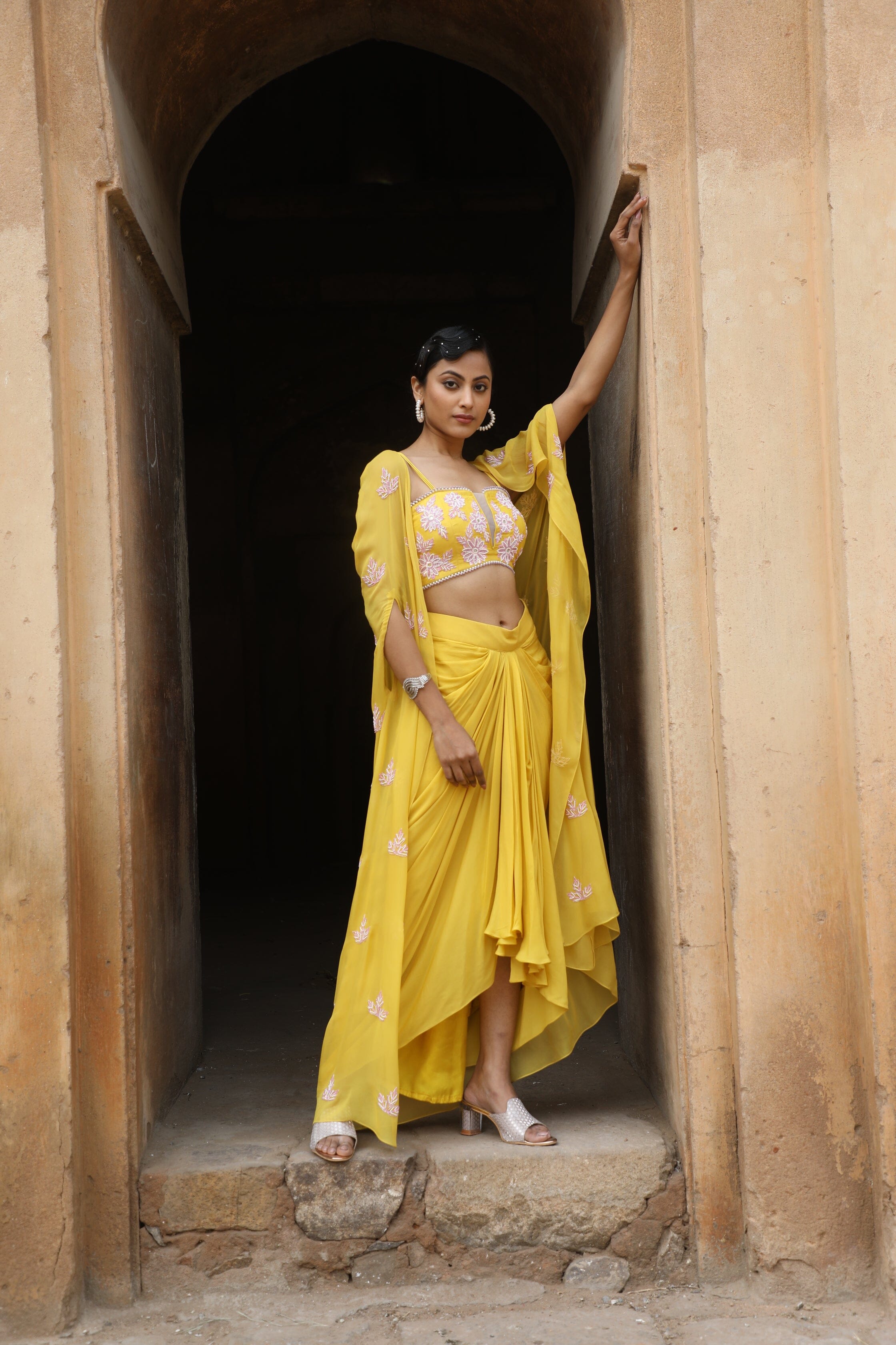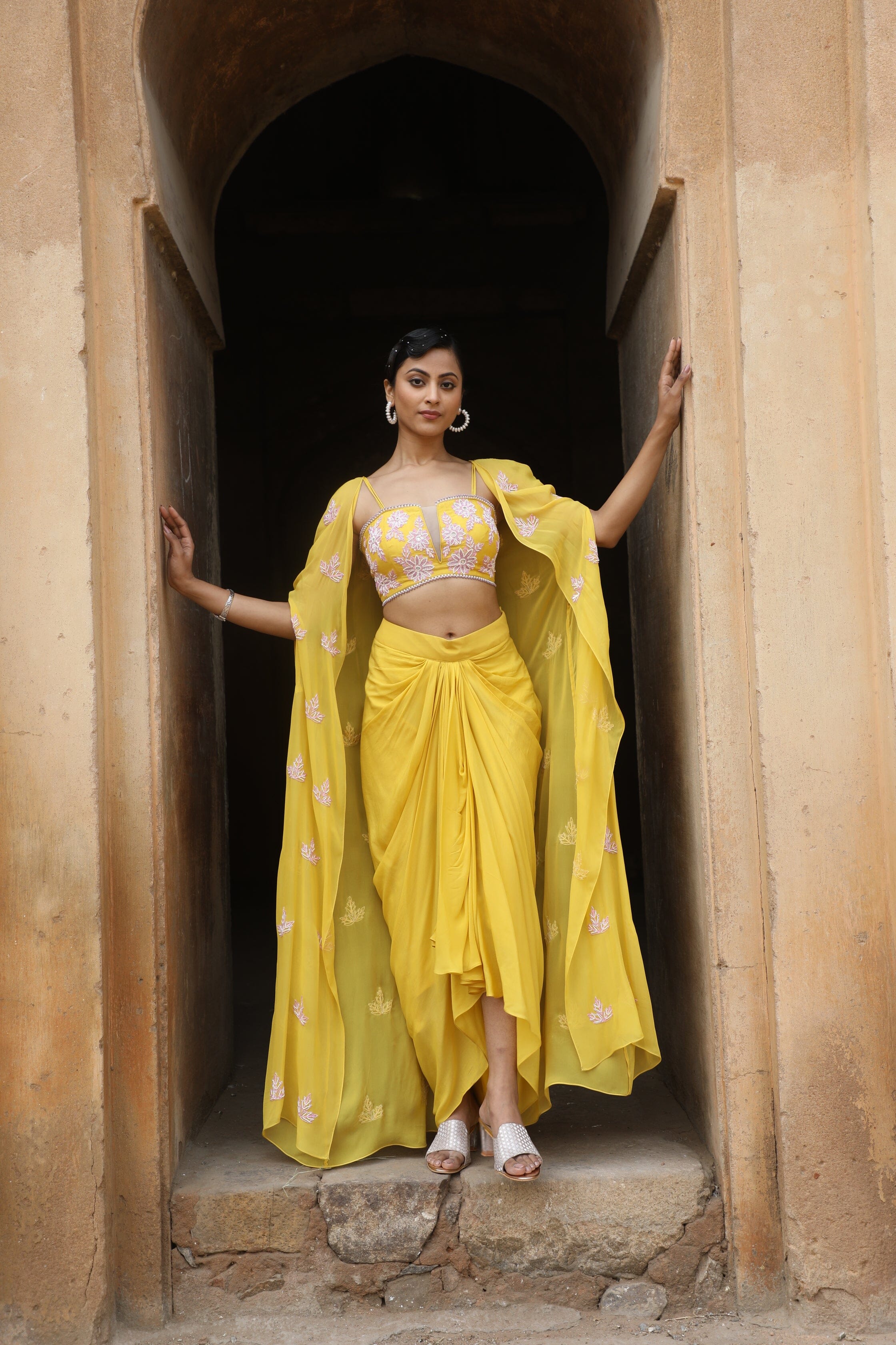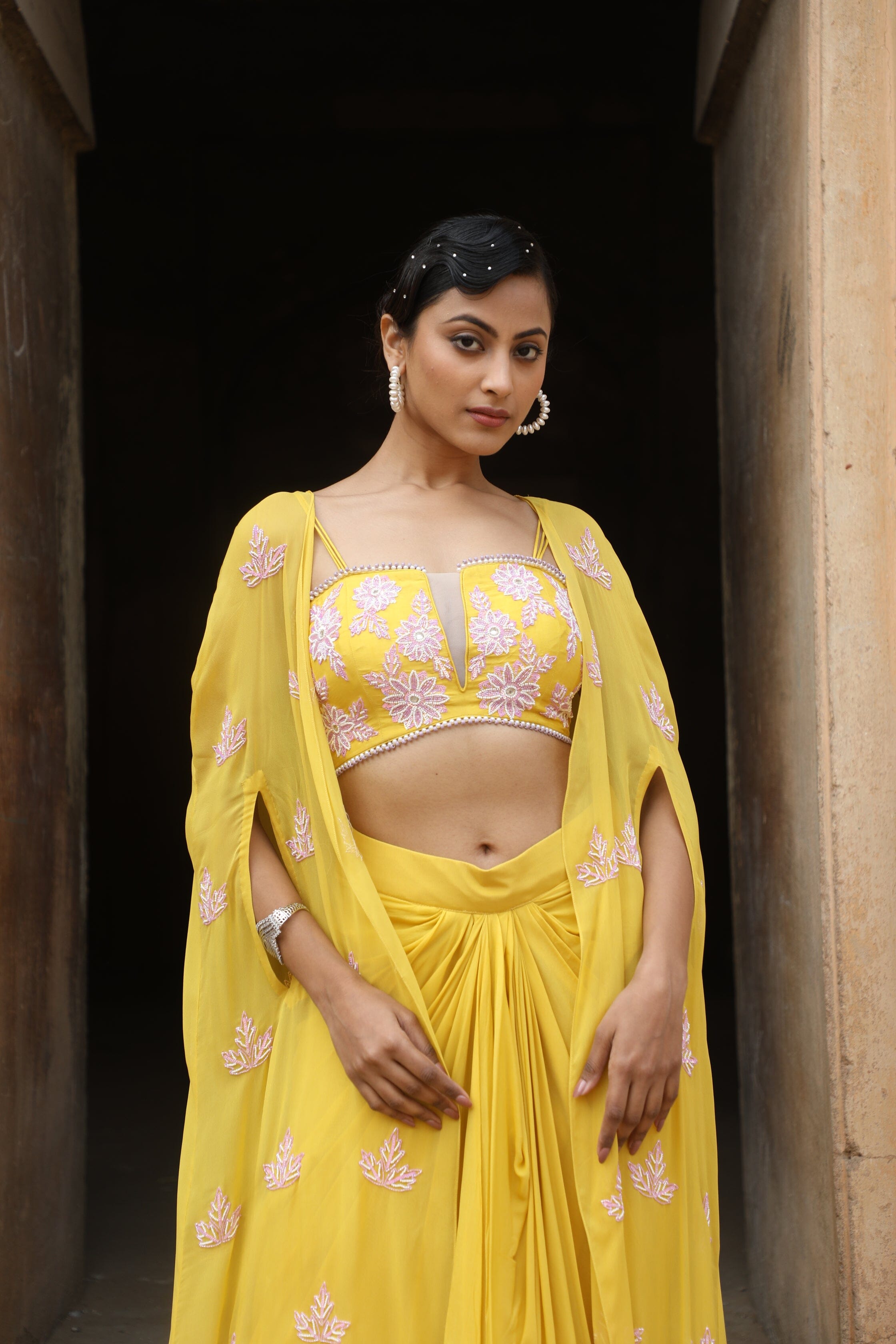 Featuring Yellow silk bustier with sequence, cutdana, beads embroidered, paired with crepe drape skrit and georgette cape.