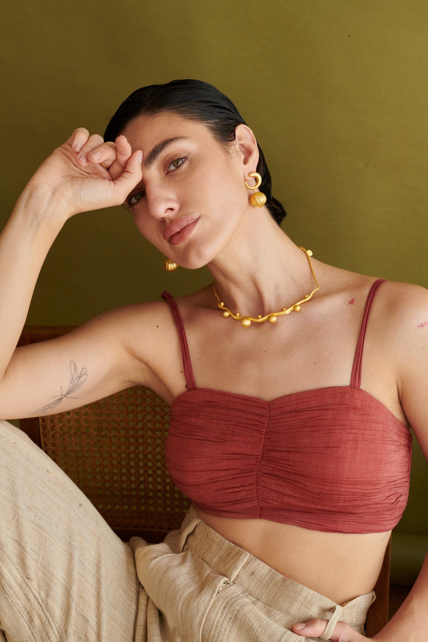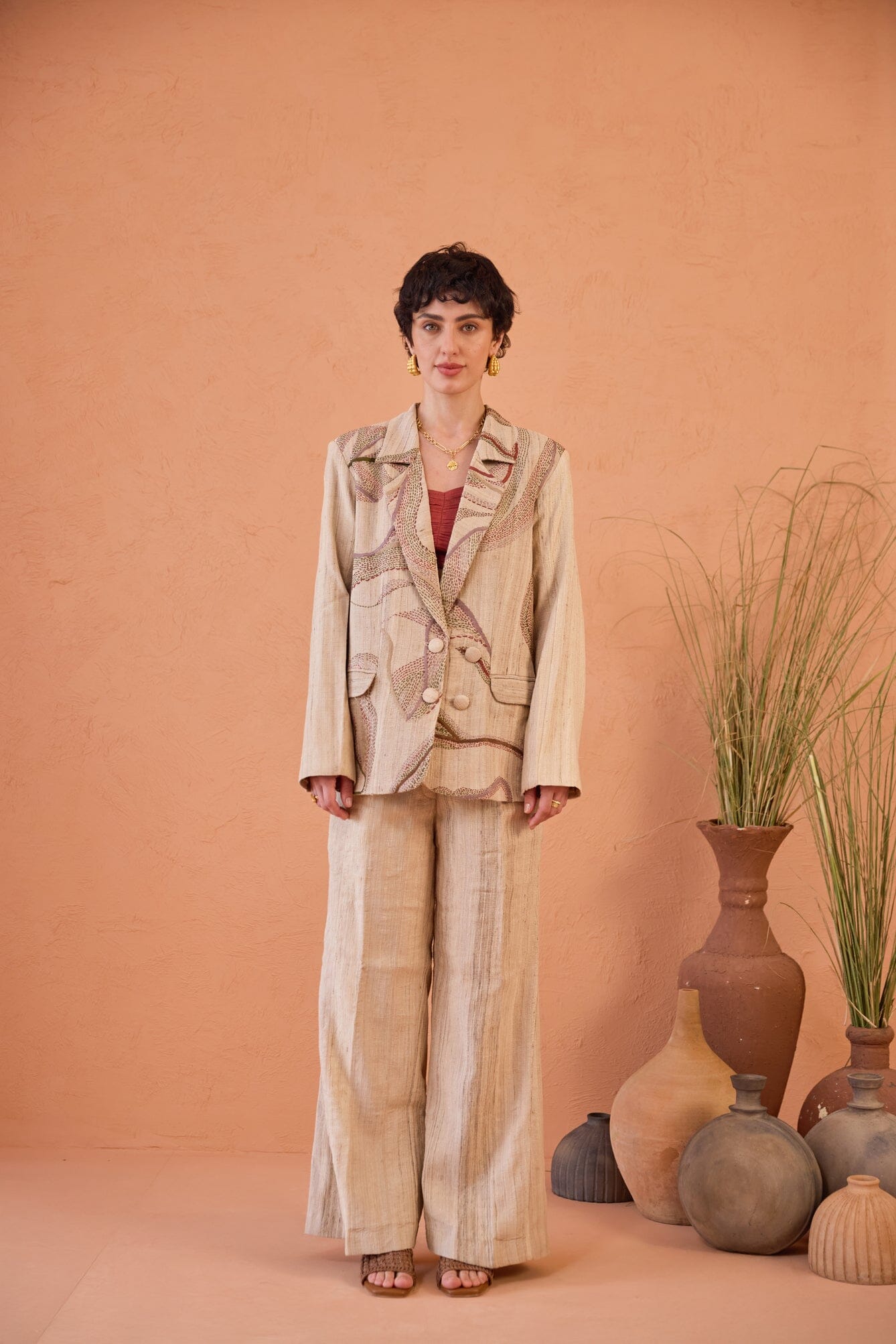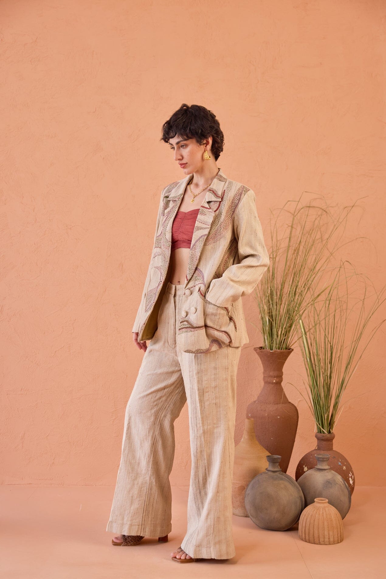 A classic silhouette meets artisanal finesse in this beige double-breasted blazer set, adorned with all-over kantha embroidery in delicate, line-art details. Shades of red, green, and lilac come together in a thoughtful palette, adding a touch of storytelling to every thread. This elegant set features a straight-fit pant, a tailored blazer, and a maroon bralette, all designed for a bold, refined finish.