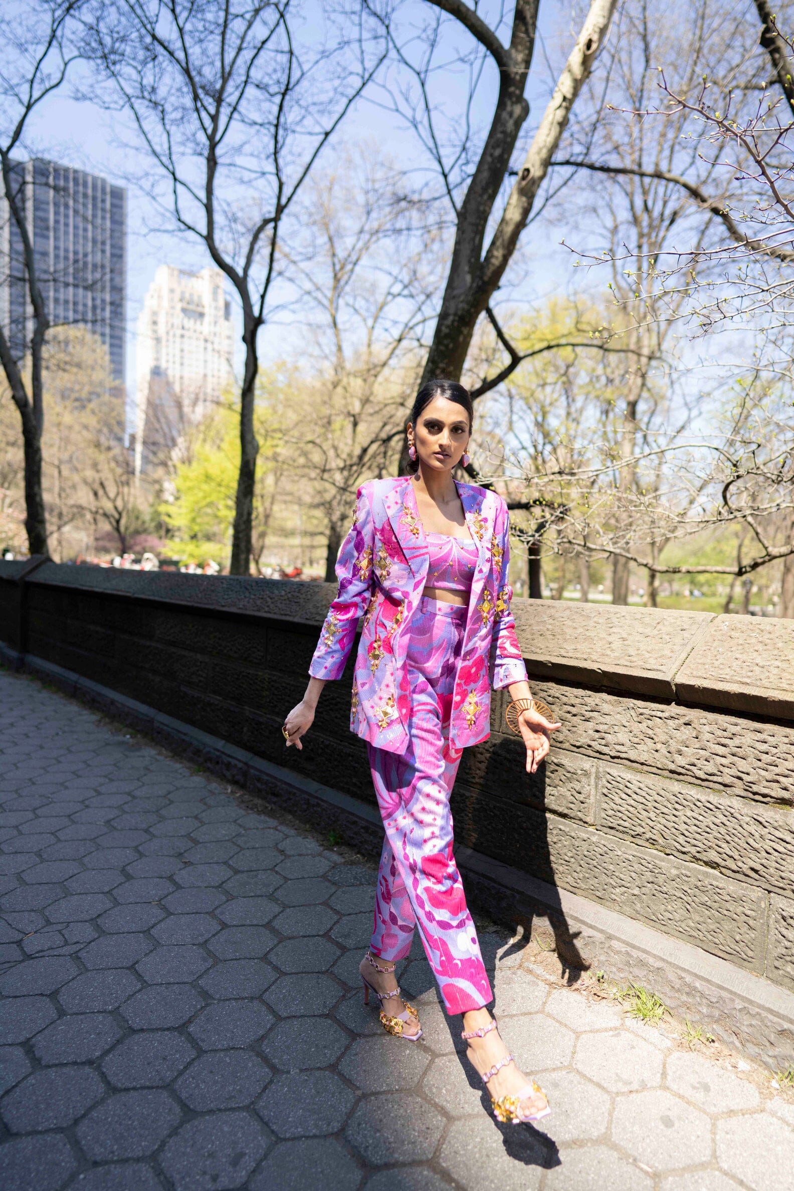 Introducing Living Coral, a crisp and sophisticated sequin-printed pant suit set. Featuring a lilac printed golden beaded bralette that is paired with pleated pants and a lilac metal sequin and pearl embellished blazer.
