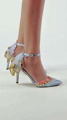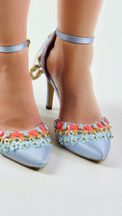 Beautifully handcrafted pointed toe D’Orsay stilettos that are constructed in a soft icy blue satin. She’s hand embellished with neon coral sequins, colourful glass beads and 3D elements. The pop pink trimmed back features an asymmetrical tulle ruffle detail with gold metallic embellishments.