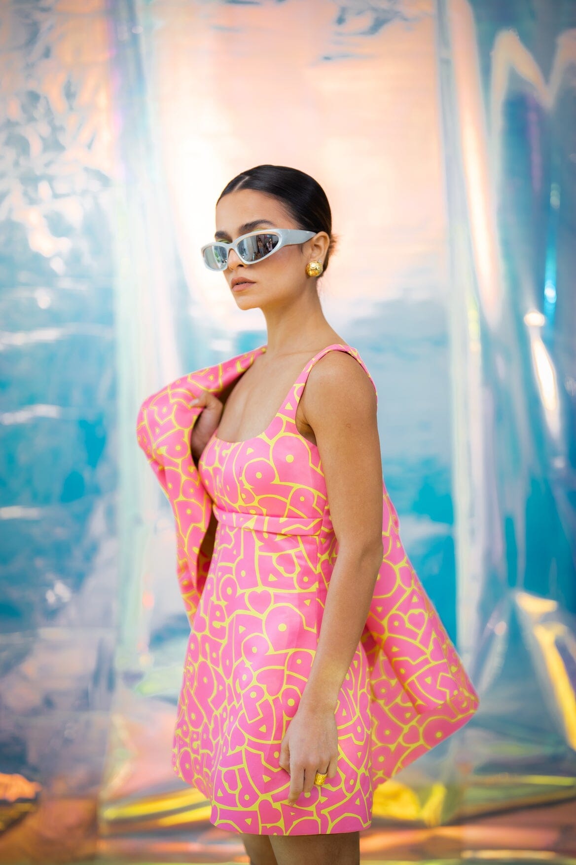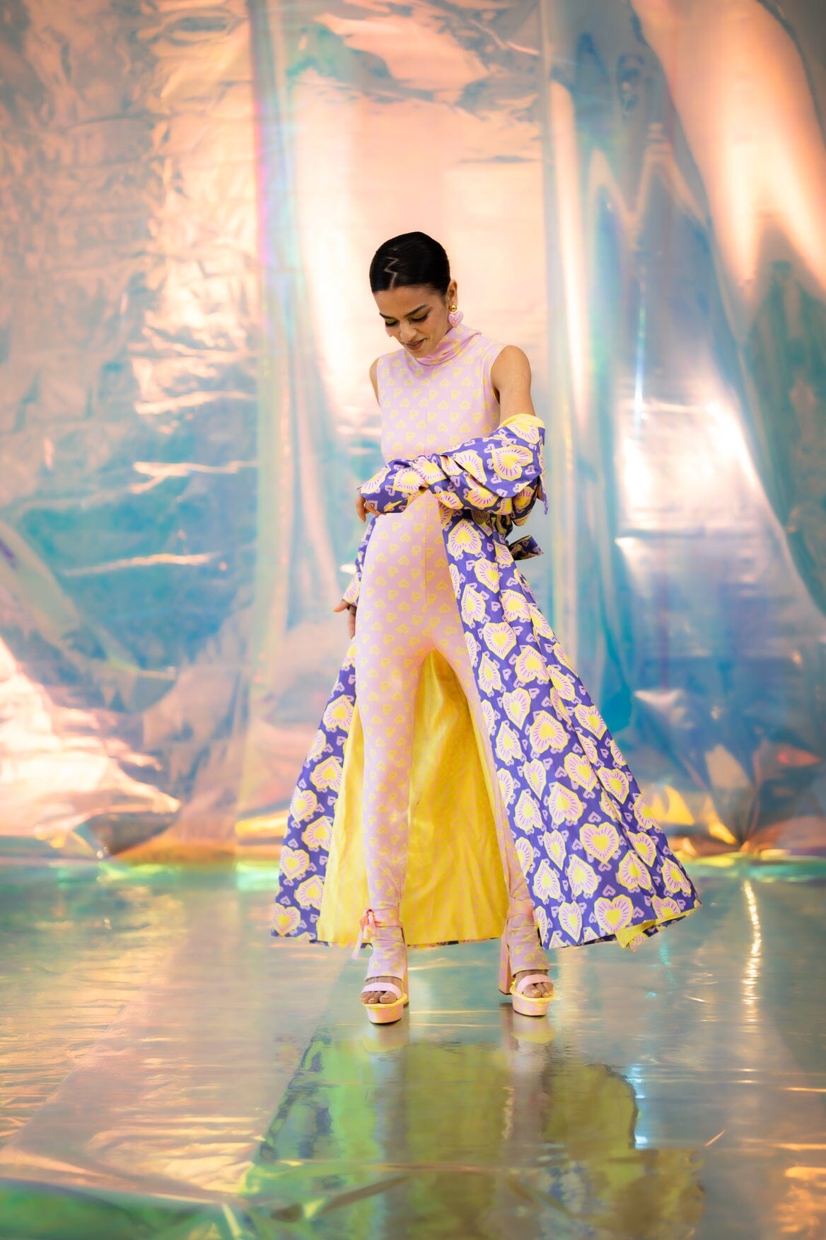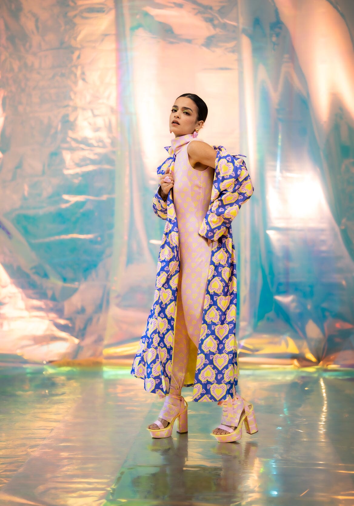 Pink Catsuit in Pac Street Girl With Blue Trench Coat in Blinding Pac Street Hearts