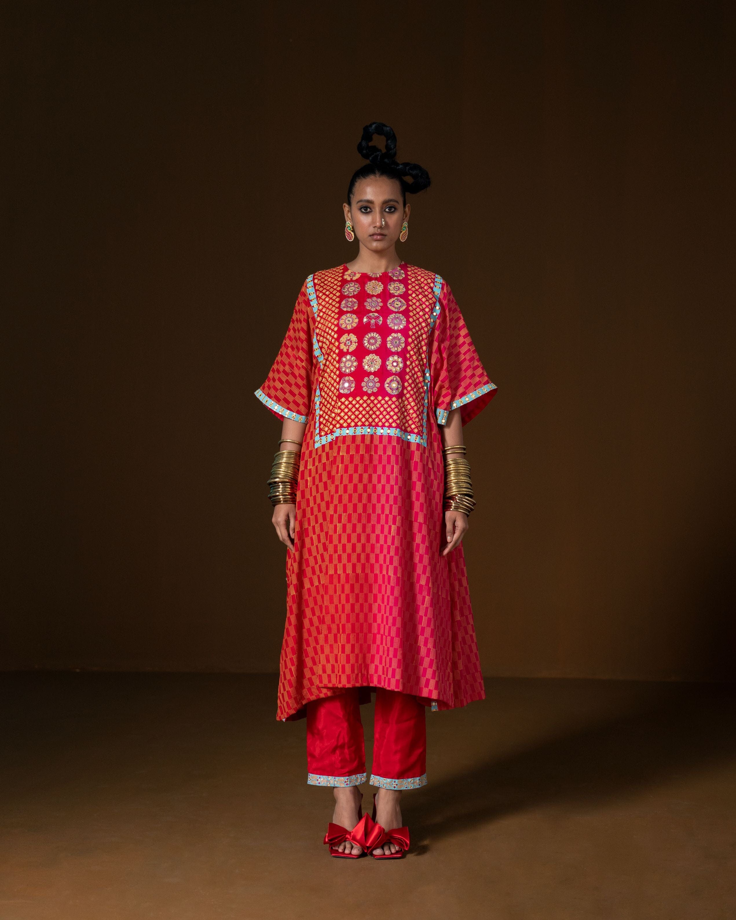 ANARDANA KAFTAN : this kaftaan is made in summer silk fabric with 3d sequin and mirror embroidery detail on the torso + ferozi embroidered borders running on sides. It has a tie up detail on the waist , to enhanse the shape. Its teamed with silk cigarette pants with embroidered hem.