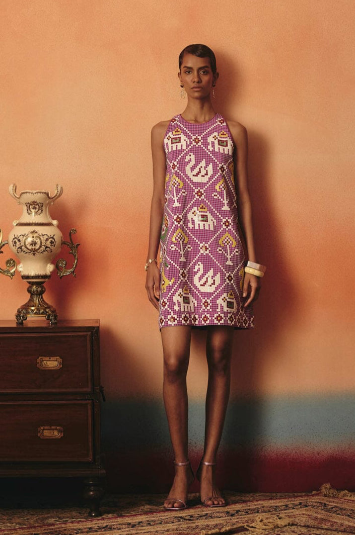 The Bulbul Dress from our new festive edit’25 is a pure crepe magenta dress, featuring the timeless Ikat-inspired patterns and our signature sequins detailing.